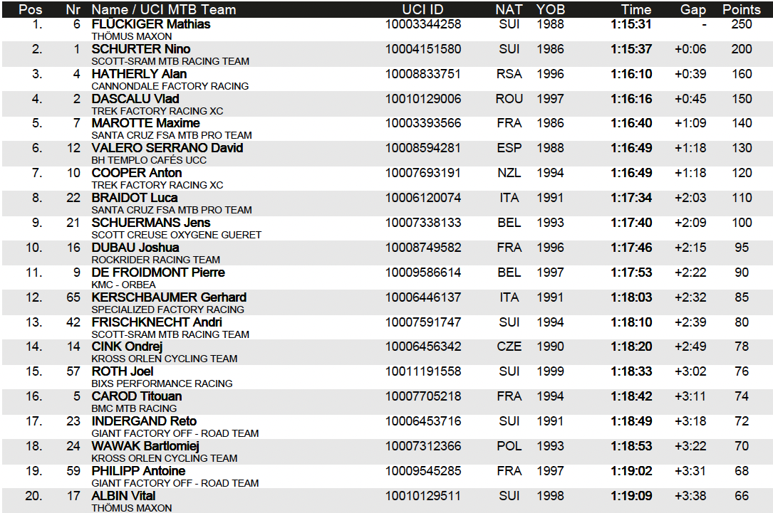 Schurter still leads the overall XC rankings, with Dascalu second by 189 points behind. Flückiger sits third. Pidcock, who was absent from this race, has dropped to fifth in the overall.
