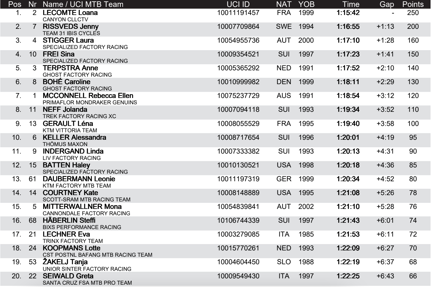 All eyes were on the two Austrian riders riding their home race: Mona Mitterwallner and Laura Stigger. Mitterwallner crashed within the first few seconds of the race starting and had to stop for quite a while to get her handlebars straightened and bike checked over. She finished strong in 15th place in spite of that! Laura Stigger gave the audience something to cheer about, finishing third. Her and Sina Frei were riding close together for most of the race, but Laura pulled away on the long climb in the last lap.