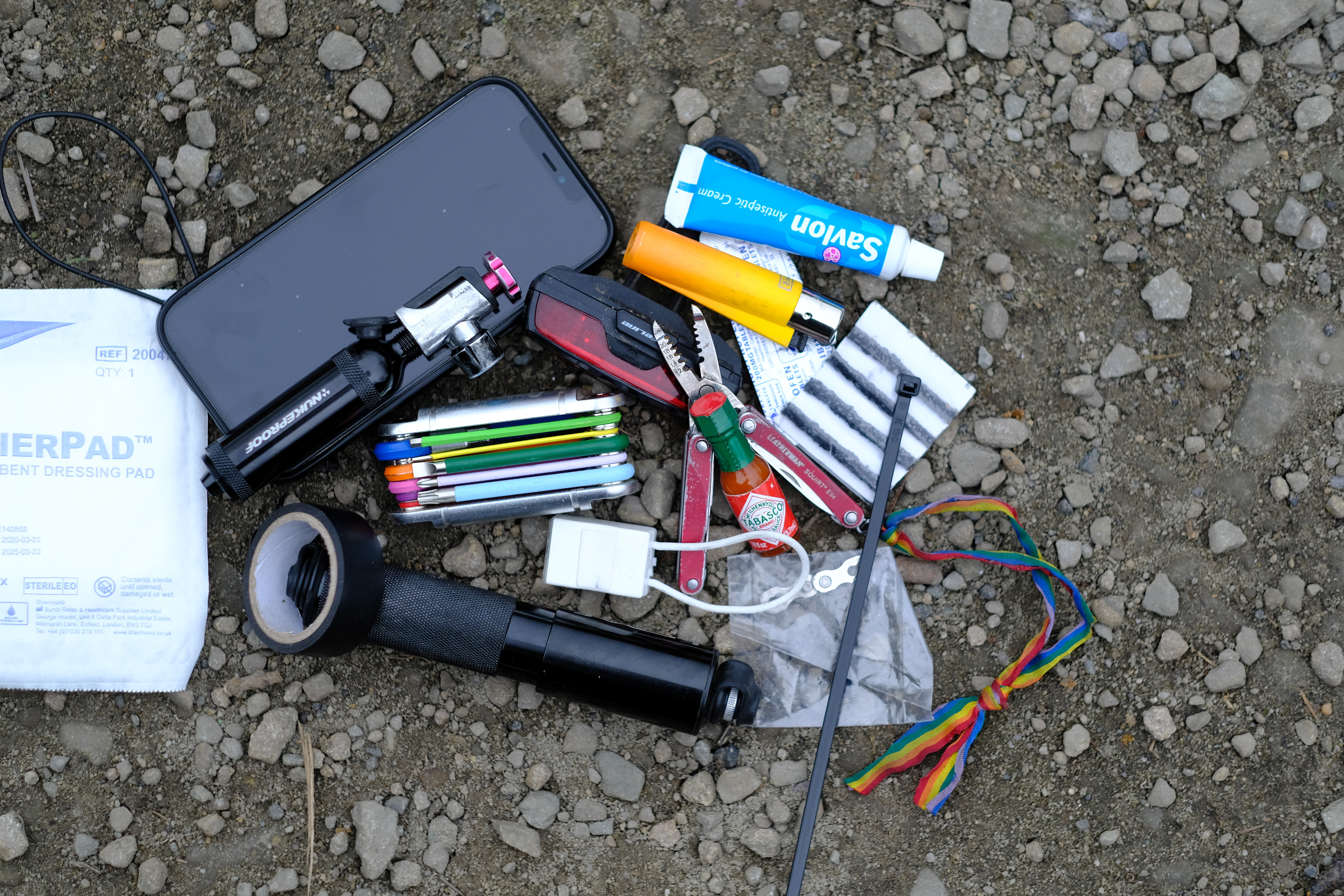 Well, it can vary, but I’d say the most common kit is: phone, keys, CO2 with inflator, a multitool and some sweets. But this is for frequently done local loops of modest amplitude. If I go further afield, for longer, I take a mini pump instead of CO2 and pack an inner tube in there too. And possibly an extra layer of clothing that packs down small.