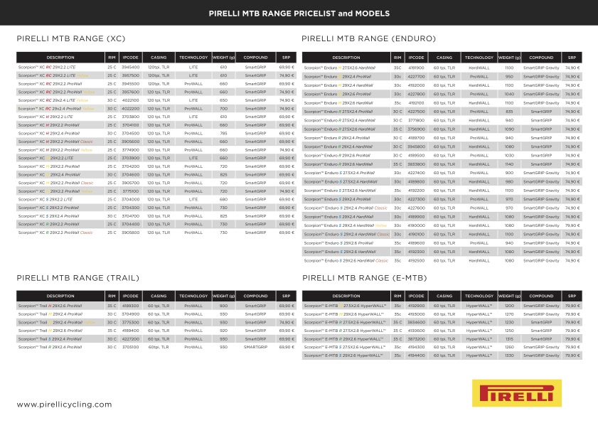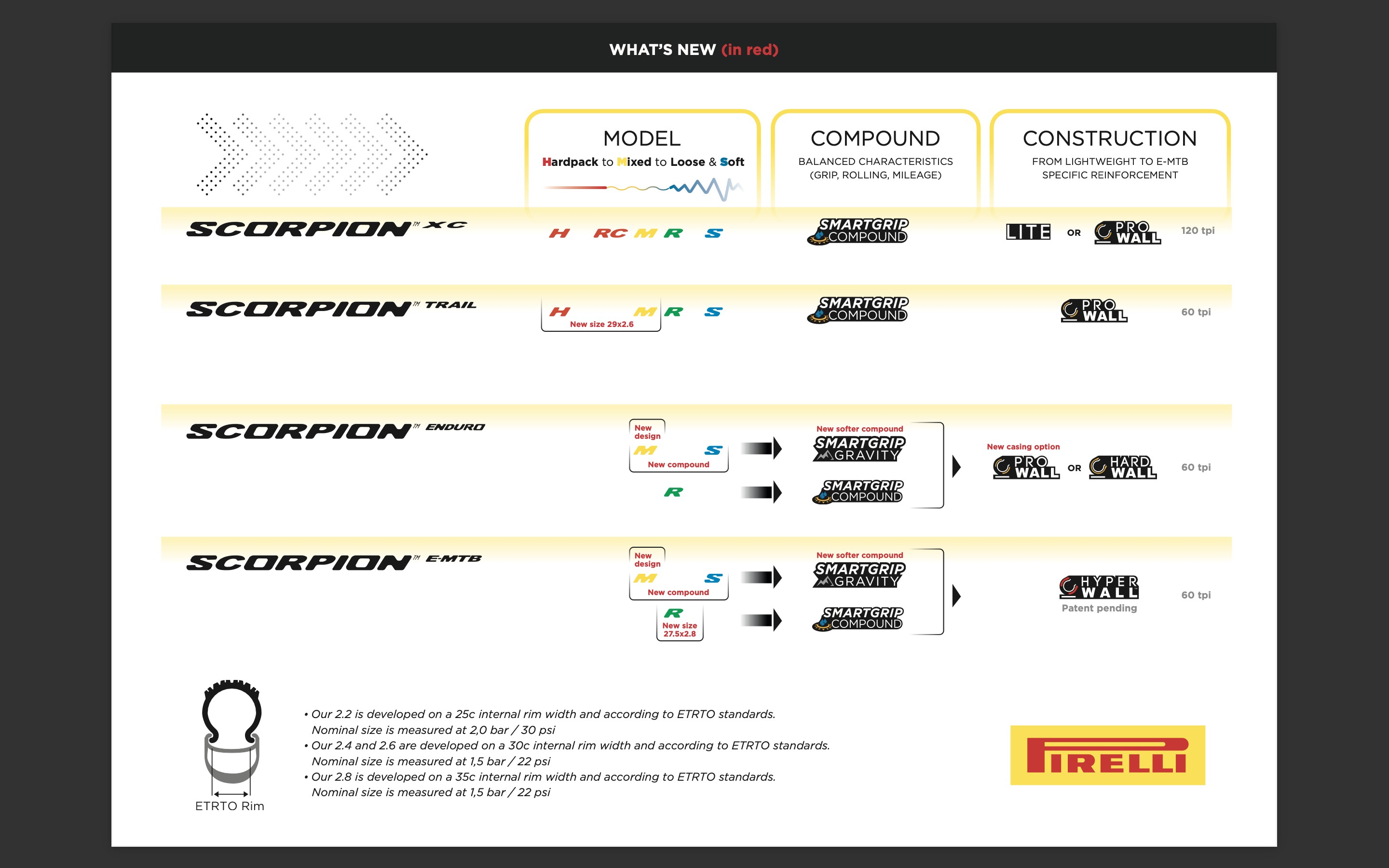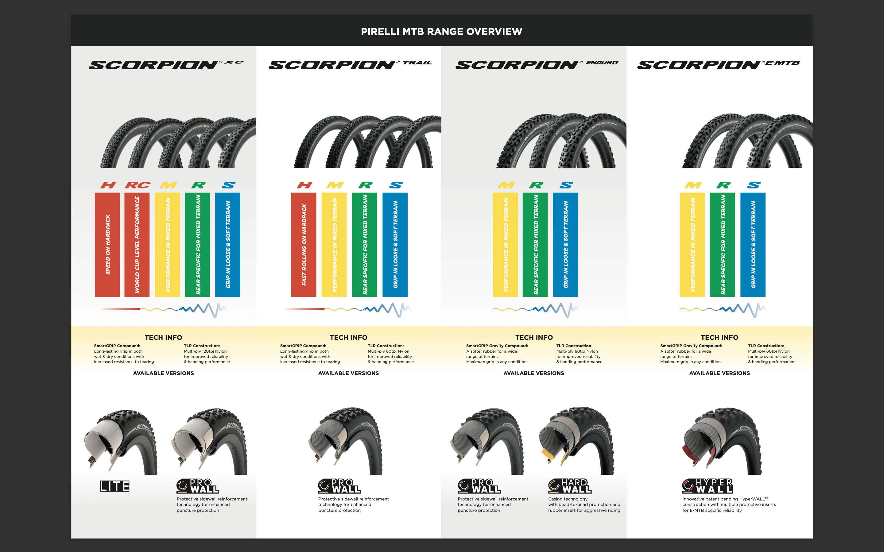Updates on Pirelli’s MTB line also touched the range of casing combinations on existing models and compounds. Today the Scorpion Enduro range is available not only in the HardWALL version, with bead-to-bead protection and rubber reinforcement insert, but also in the lighter and more rideable ProWALL, with sidewalls reinforced by a nylon fabric. In this way, an even more complete and modern range of uses and requirements is satisfied and updated to the great variety of performances that modern MTBs allow today.