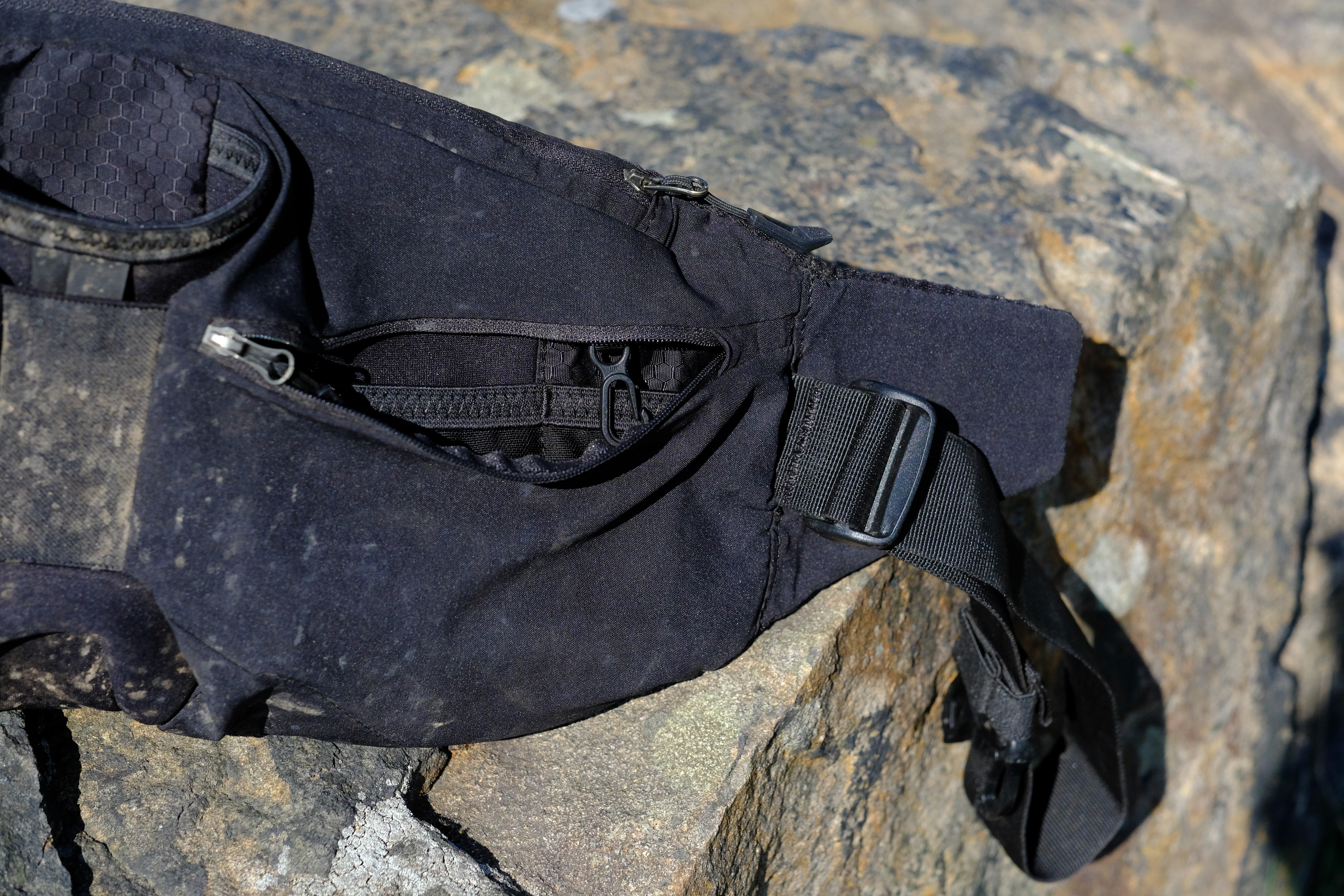 A shrink-to-fit stretchy hip pack that works well with light or heavy hydration loads.