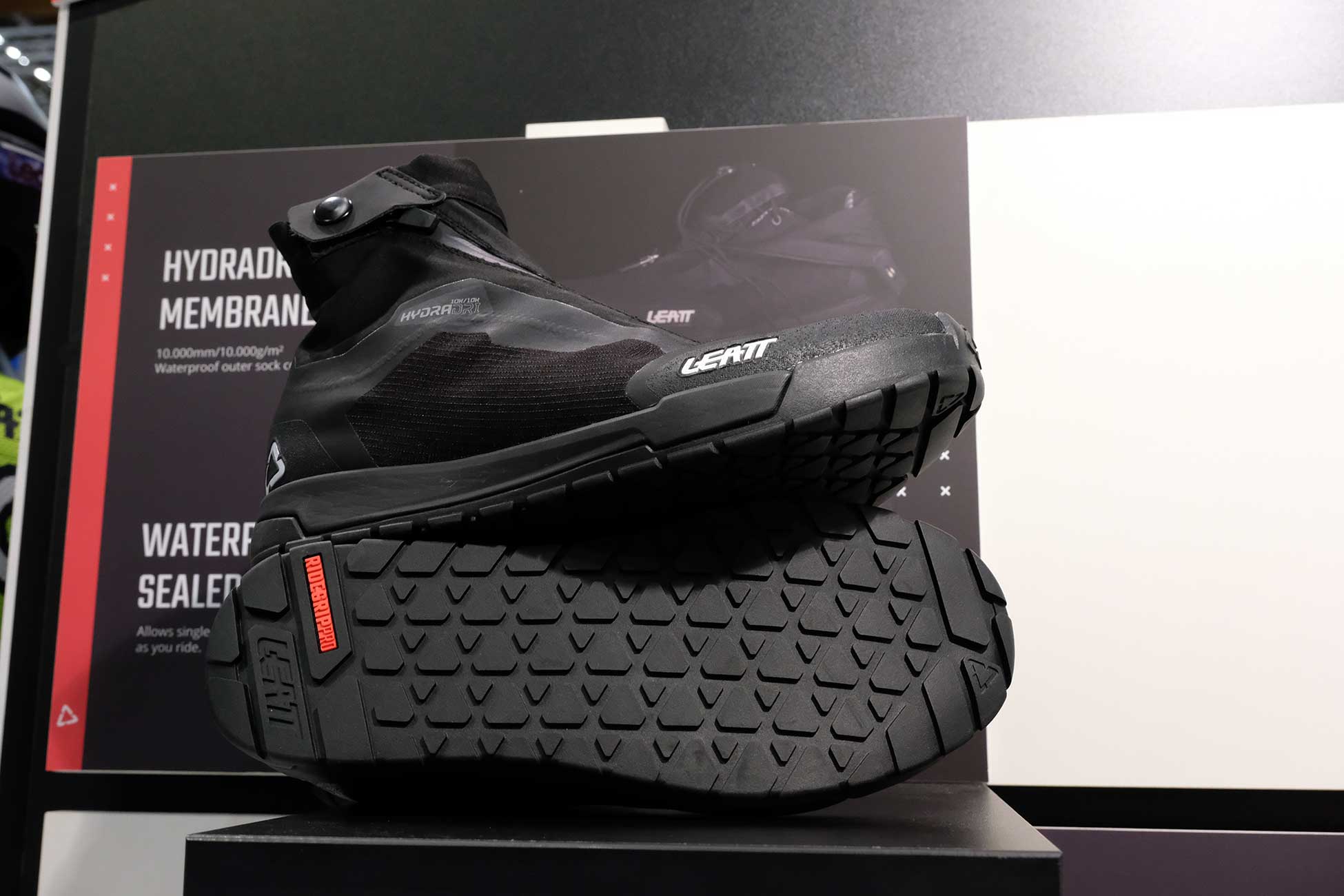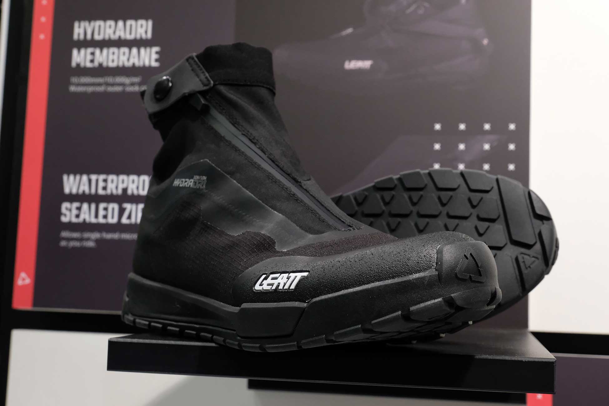 Leatt has been quietly expanding its clothing and footwear range and this year unveiled a completely new range that has (obviously) been developed with rider feedback â none more so than these HydraDri boots. Although not a full boot, it is effectively a performance flat pedal shoe with a full zip-up waterproof cover for winter (or three season UK) riding. The range has five new shoes in it in addition to these waterproof beauts, with features like âproâ rubber that is 20% softer for extra grip and the WaffleGrip Pro soles that work with shorter pinned flat pedals.