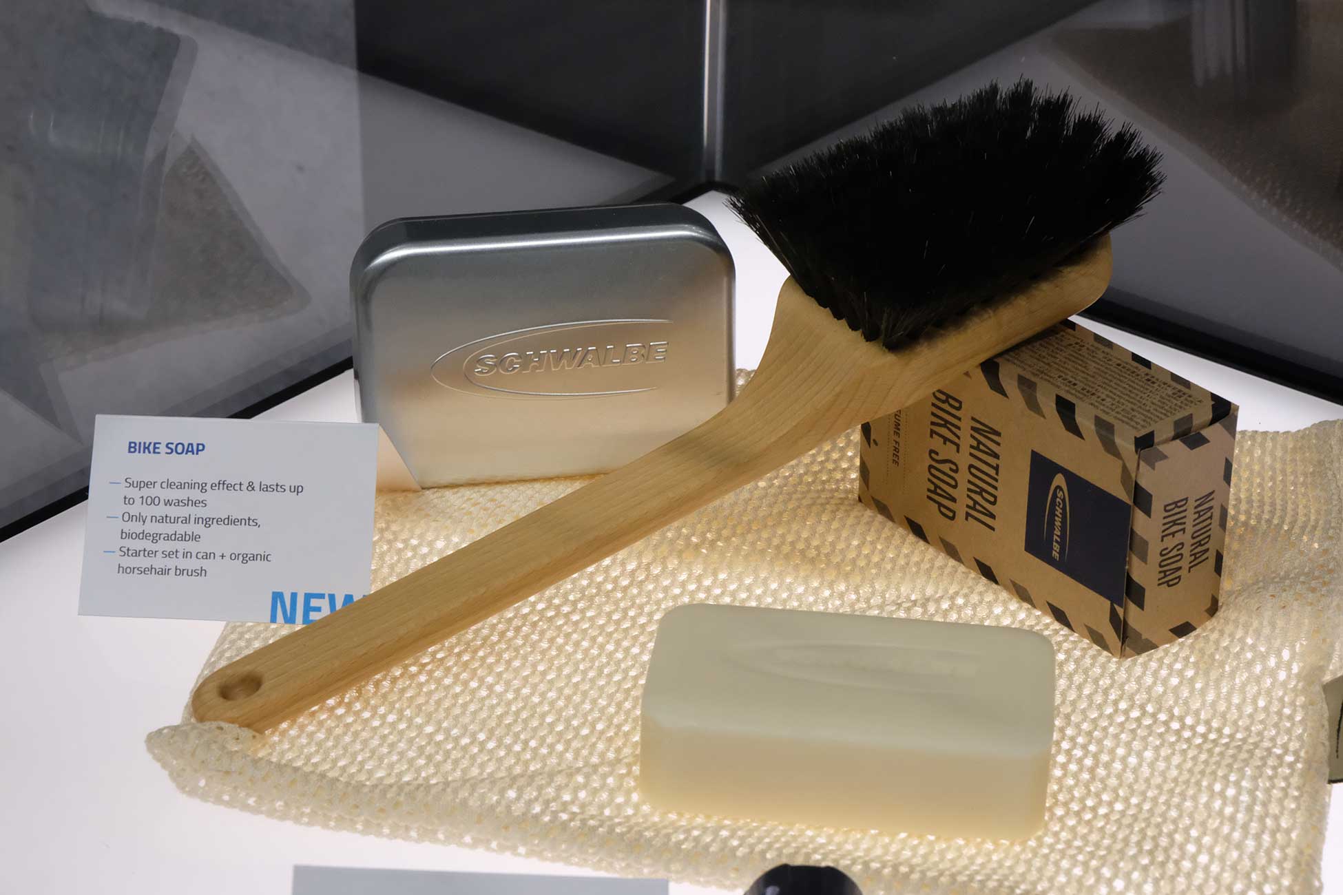 One other thing that Schwalbe is doing, is an âeco bike washâ. And unlike, well all other âecoâ bike washes, it doesnât even come in a squirty bottle. Itâs literally a bar of bike-friendly ‘bike soap’, a metal tin to keep it in and a wood-handled, horsehair bristled (sorry vegans) brush that you later up and wash down your bike with. A bit of a gimmick? Or an attempt to help? Given the rest of their efforts, Iâm prepared to give Schwalbe the benefit.