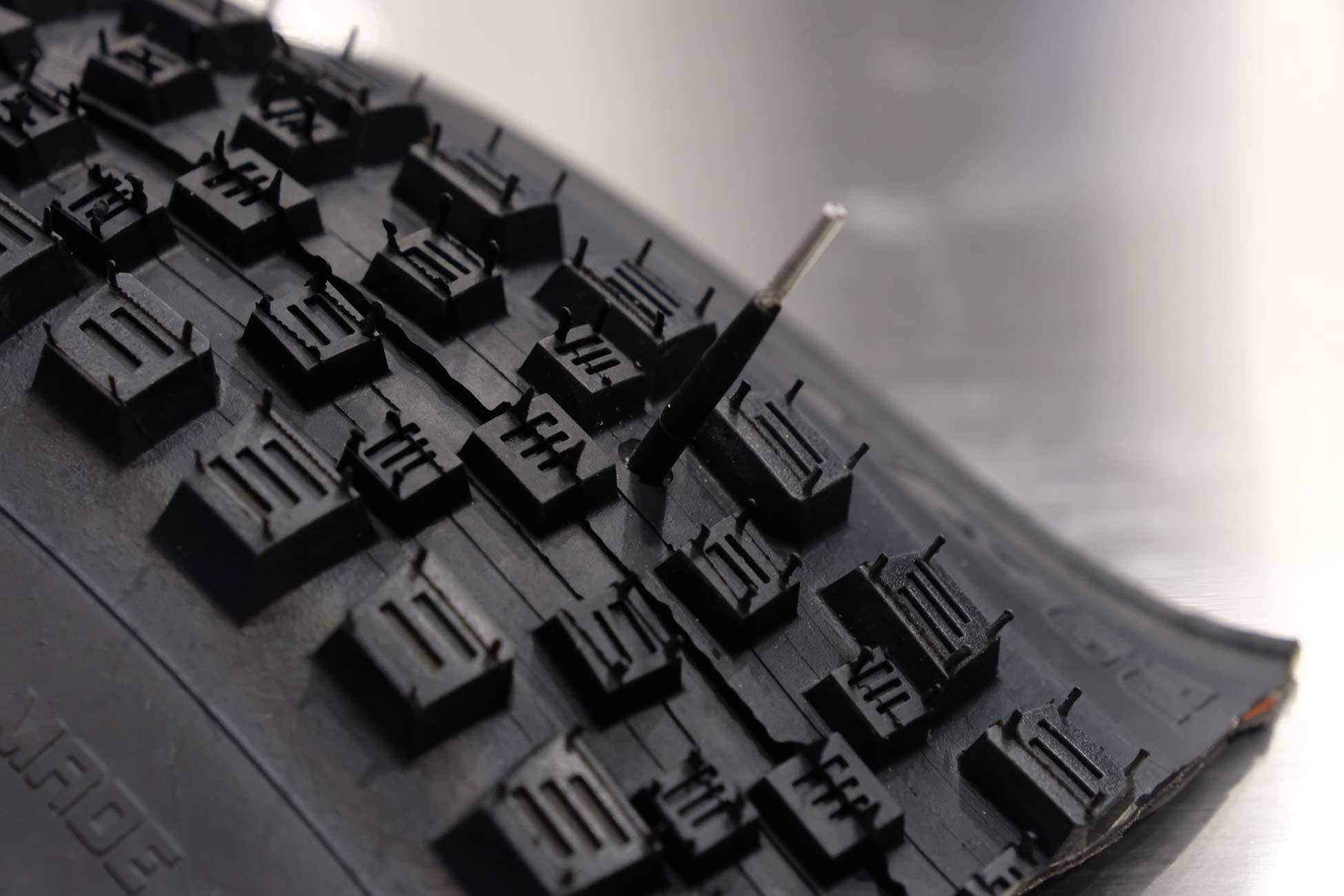 While I’m here, Lezyne also showed some automotive-style permanent fix patches for tubeless tyres. Clean the inside of the tyre, pull the patch through the gaping hole using its metal tip. Glue into place and snip off the tip for a permanent repair of your £80 tyre.