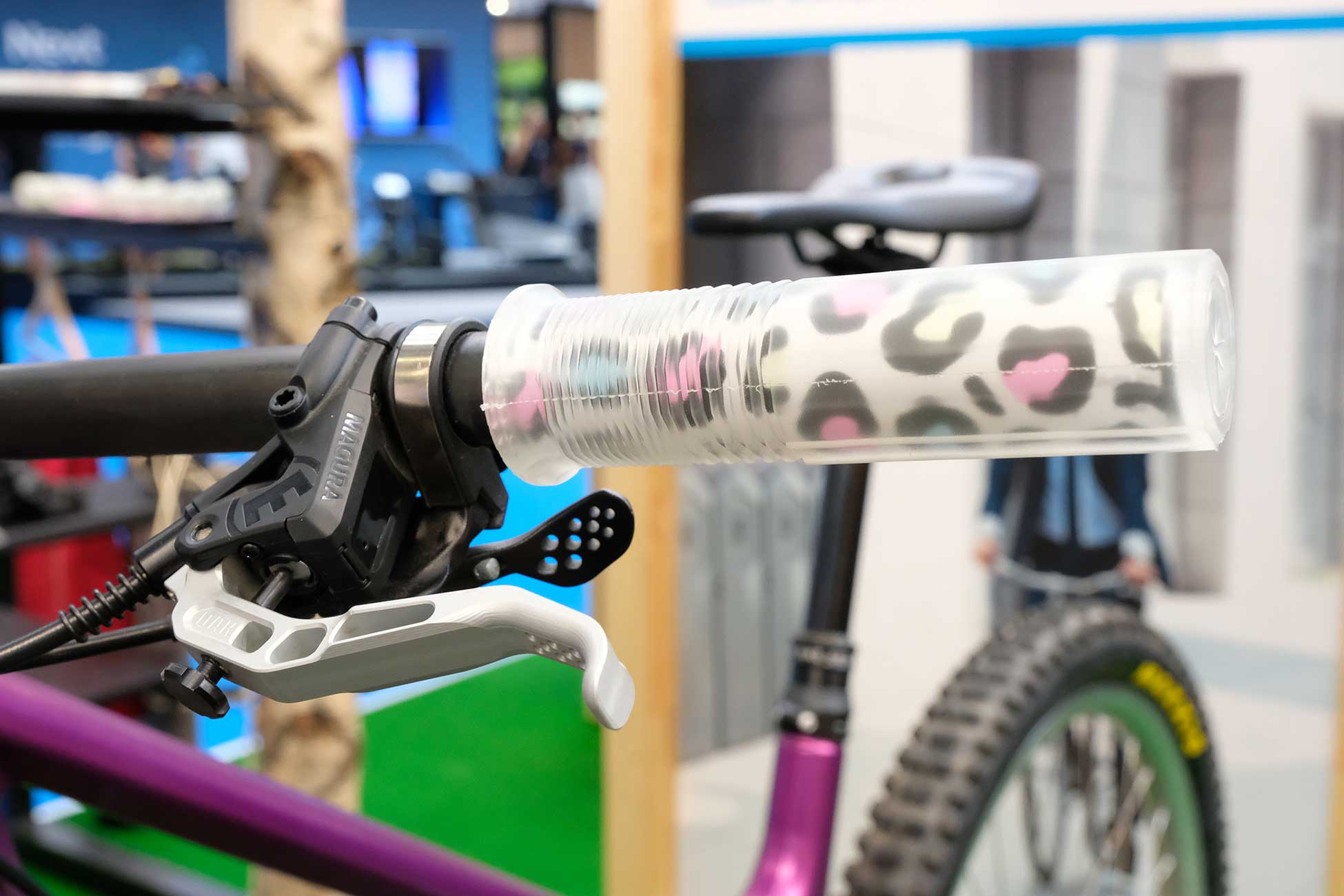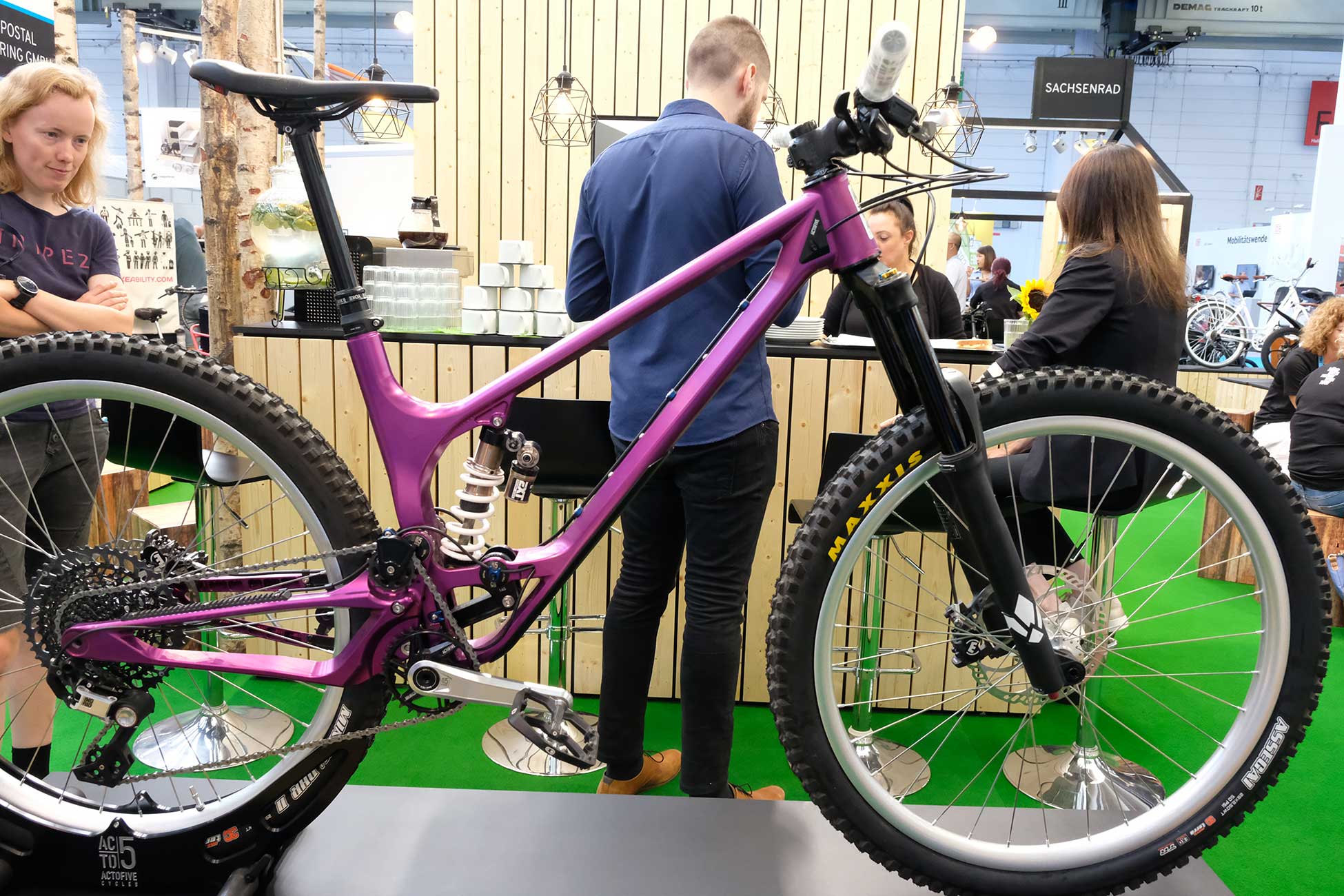 I canât say that Iâm normally a fan of completely machined bikes, nor of high-pivot idler bikes, but something about this ActoFive machine kept me coming back to look at it on the booth it shared with the Qvist hub folks. Actually, a quick word about the booth â it was sponsored by Cycling Saxony, which was formed after the last Eurobike show when a load of east-German engineers all found themselves separately at the show and decided to form a sort of co-operative to share costs for future shows. The local government got involved and helped fun the stand to promote bike companies from Dresden and Saxony in general, (similar to how Developing Mountain Biking in Scotland works. Reckon your council would be up for it?) Other Saxony-made components on the bike included Beast Components carbon bars and machined stem, as well as some neat clear â but non-yellowing â grips that let you put coloured stickers underneath.