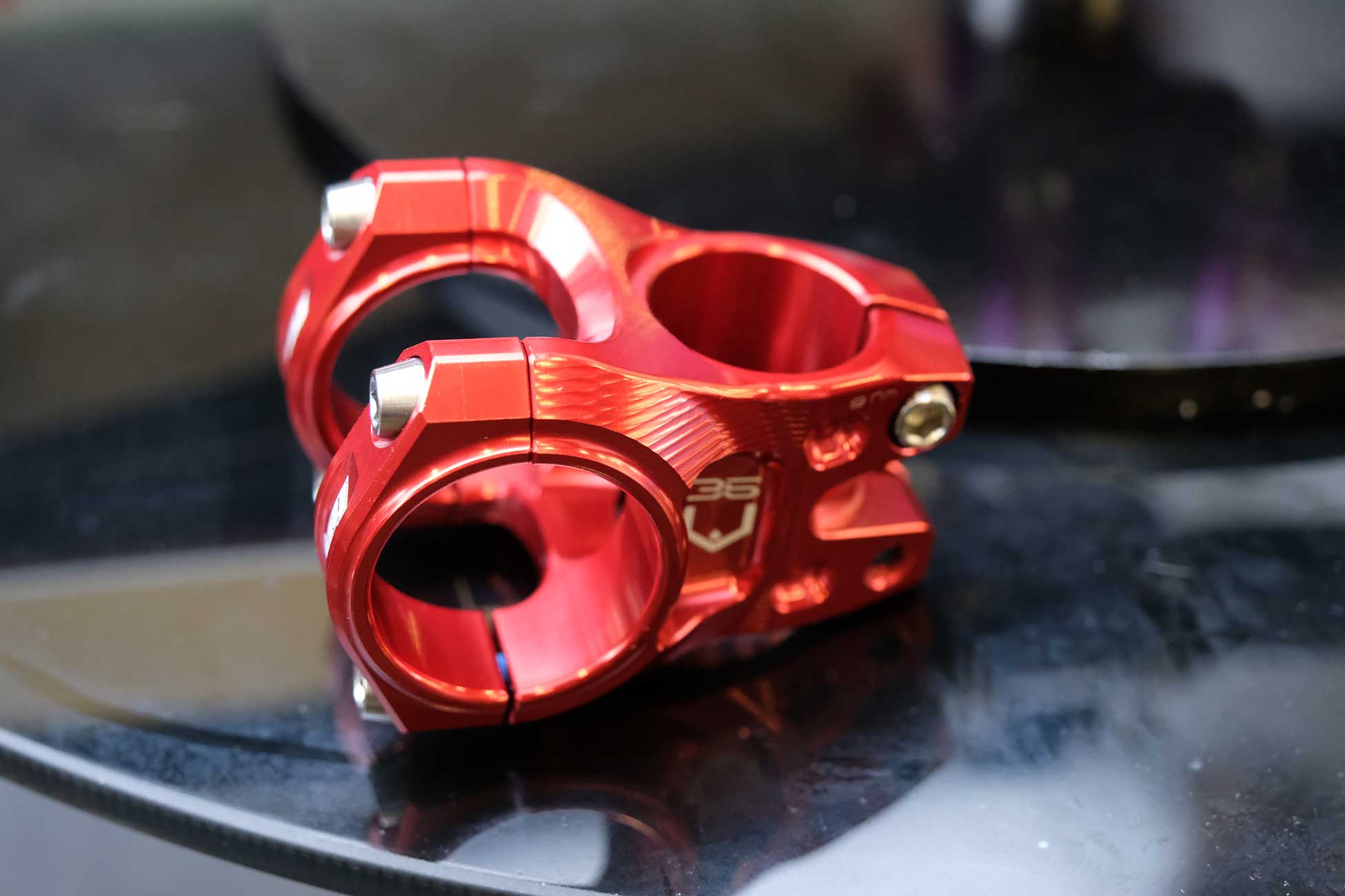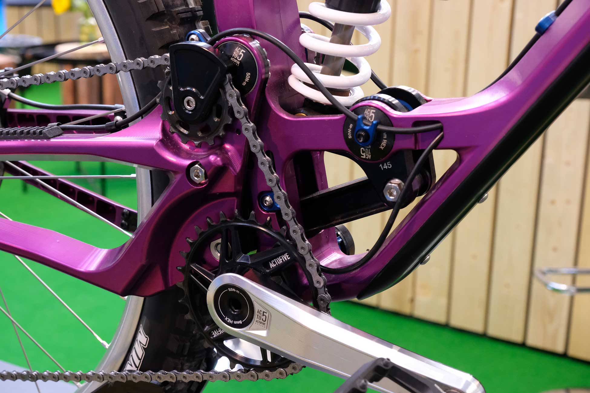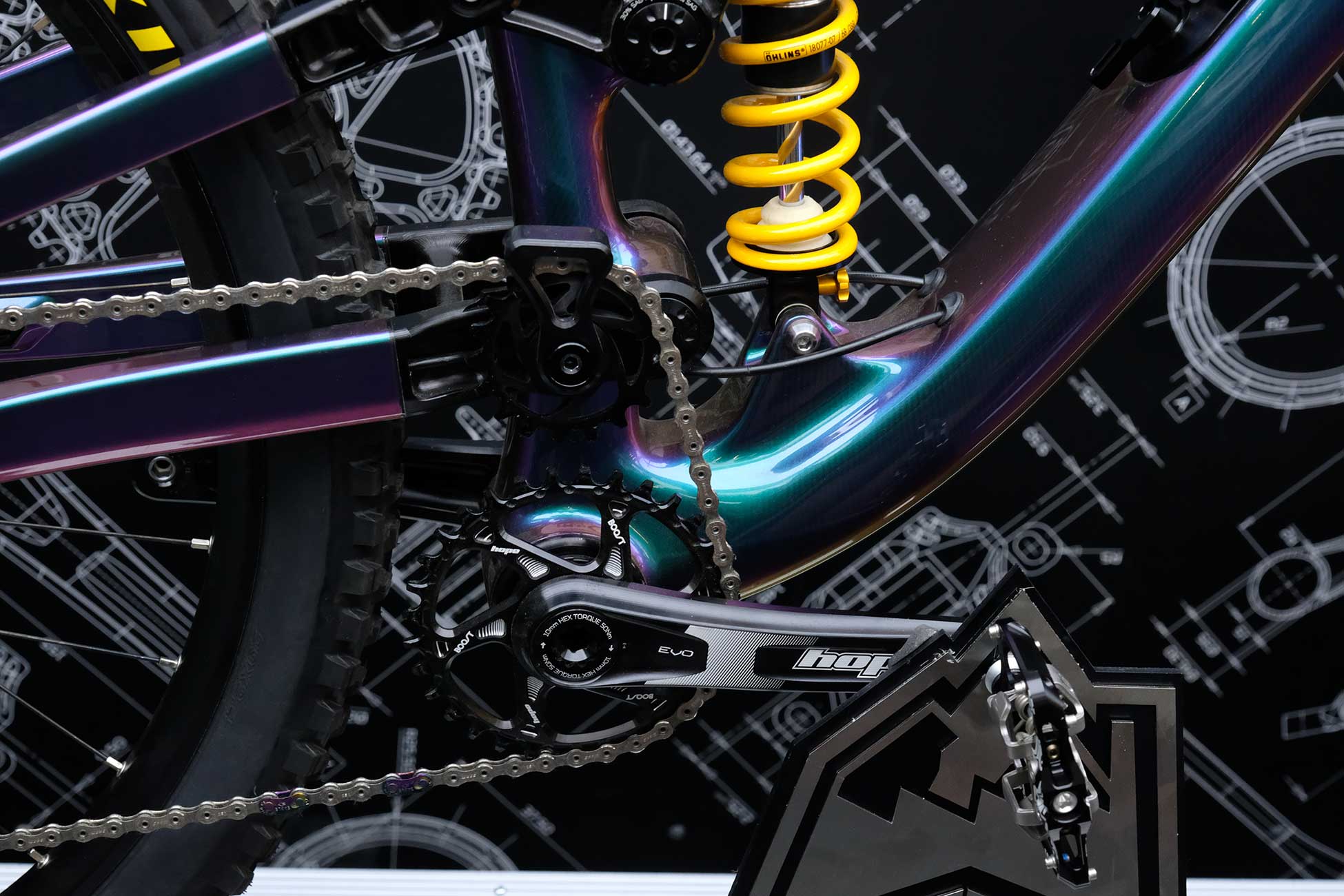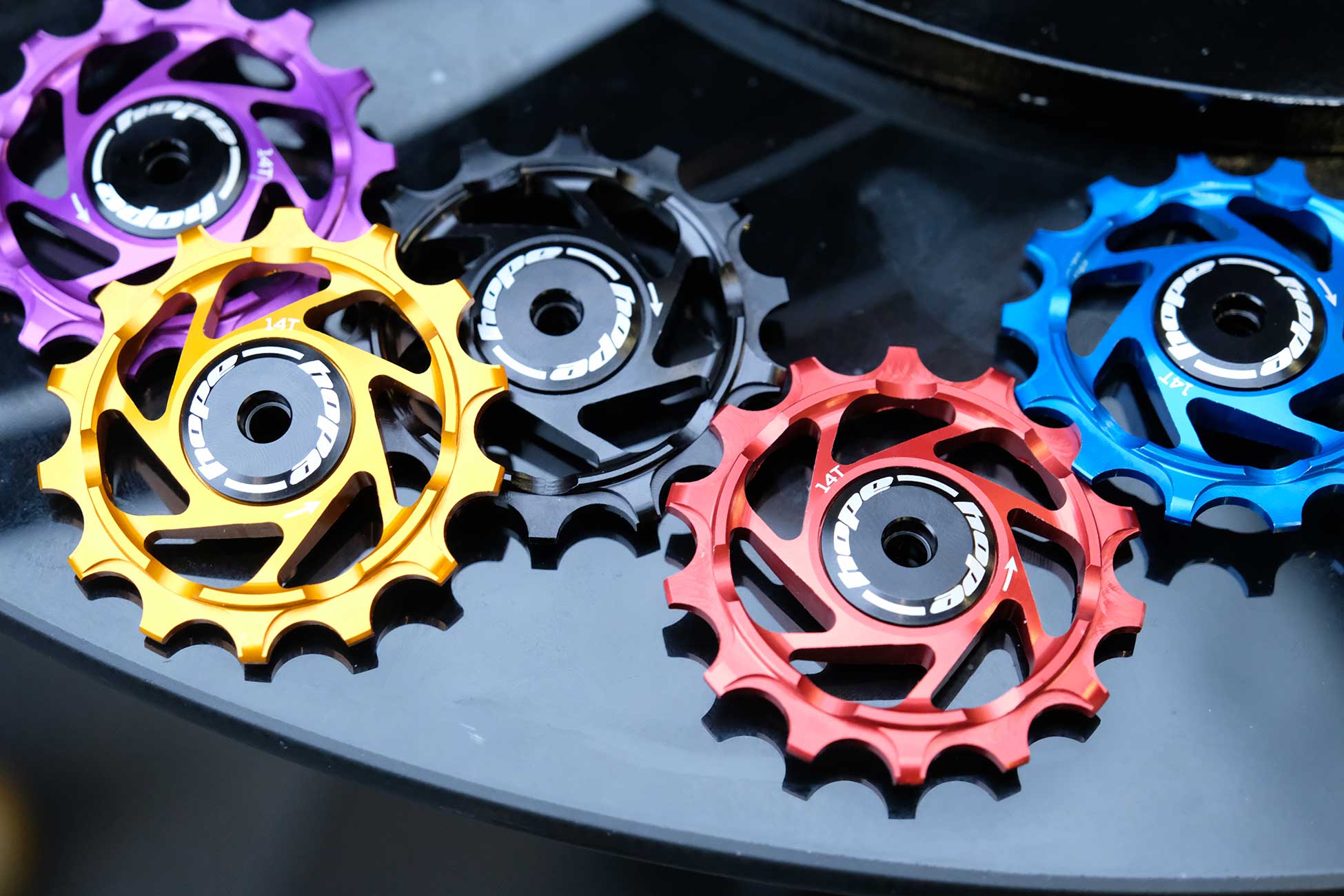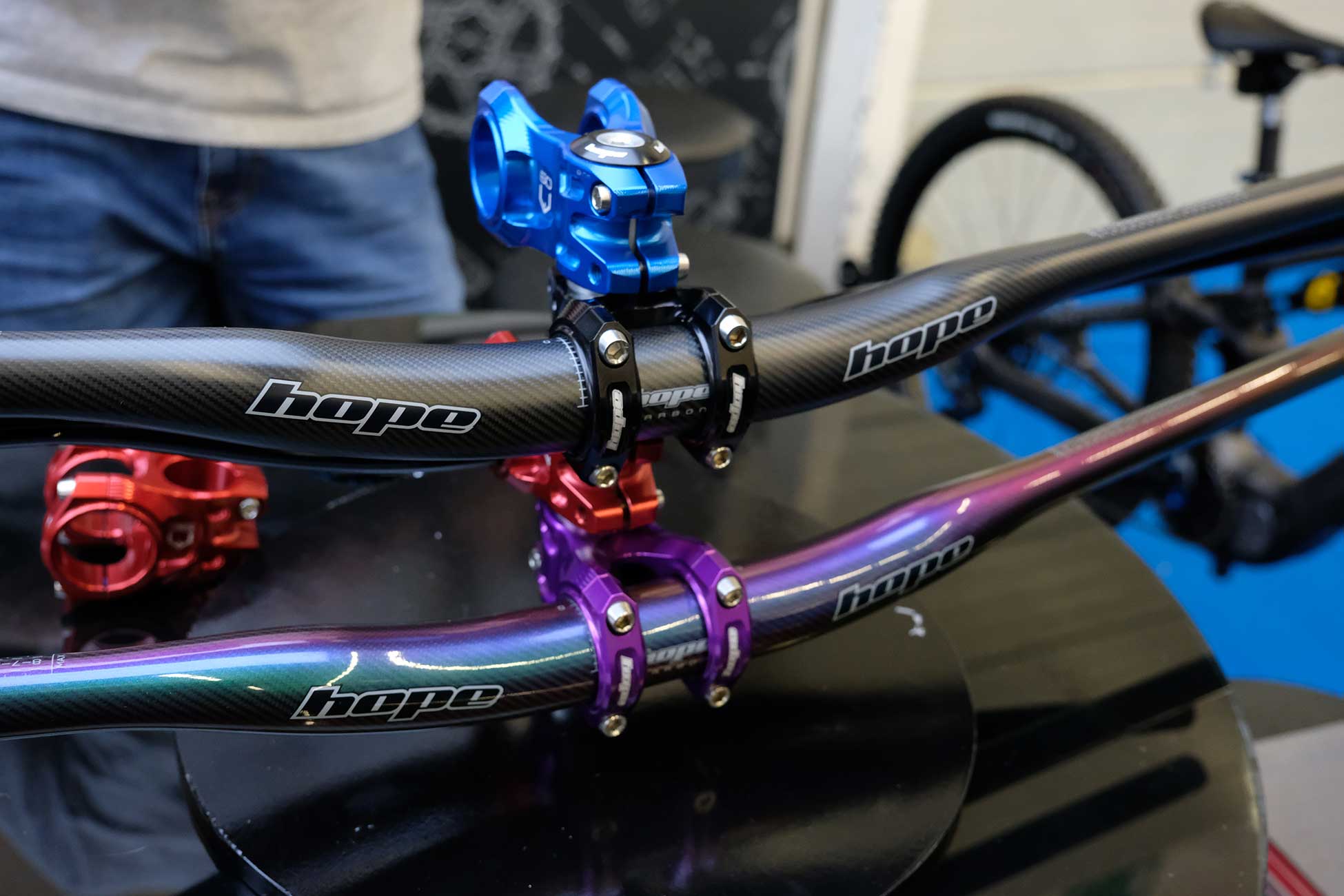 Centre stage was Hopeâs 916 mountain bike frame, complete with on-trend idler pulley and an incredible flip-flop clearcoat green/purple lacquer job (with matching handlebars, that Hope might start to sell separately once it has made enough for the bike orders). Again, though, for Hope, it was the incremental improvements that were new, but not necessarily news. The Gravity stem has been neatened and lightened, coming in 35mm and 50mm lengths and 35mm clamp size. (£105/âĴ130). It was showing 12 speed SRAM 14T lower jockey wheels in colours and thick/thin tooth profile (£45). And there was the announcement that all Hope bottom brackets will be SRAM DUB compatible, and the adaptors will be included, free of charge with all new Hope BBs.