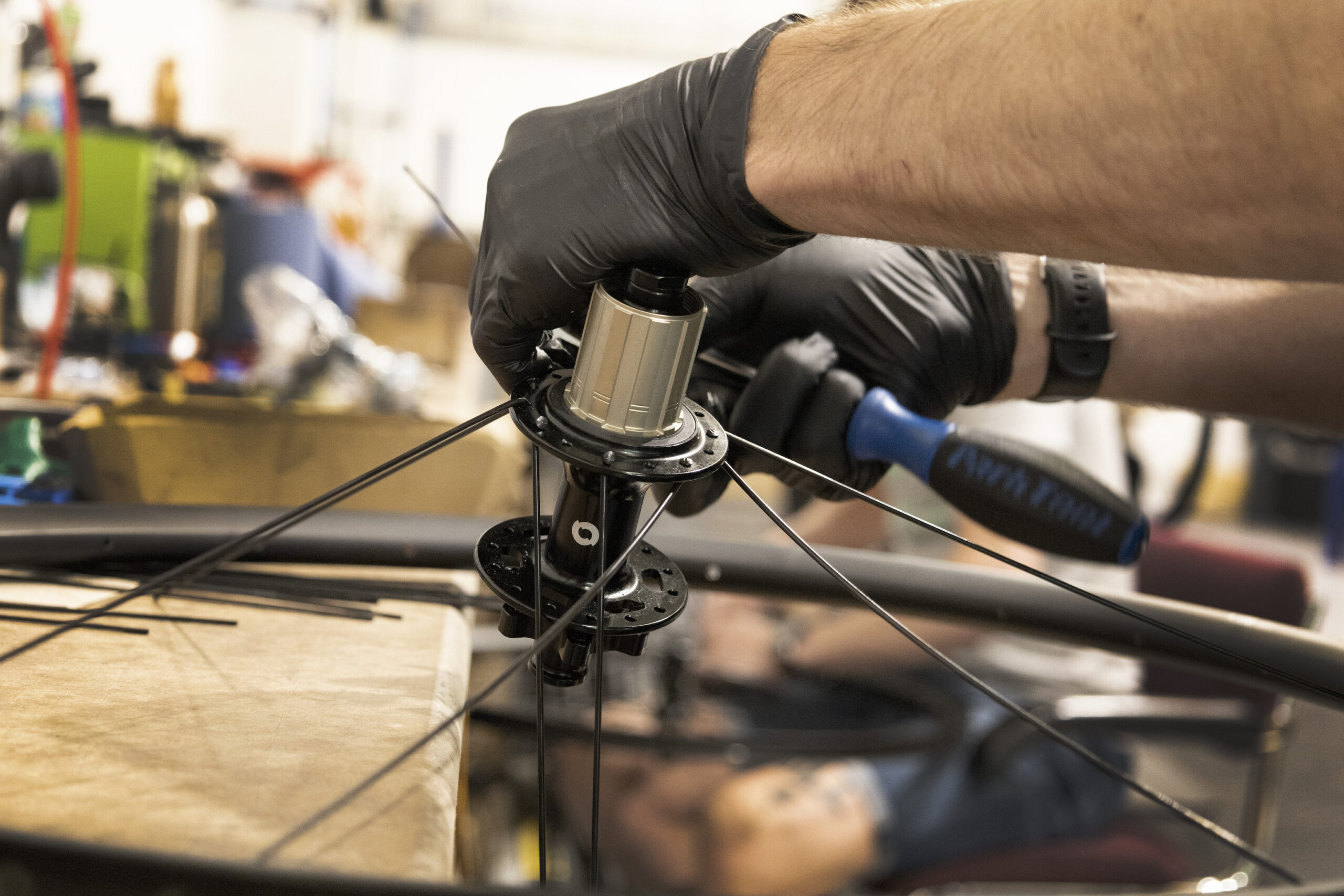 The wheels are built across two machines: the lacing machine and the truing machine. The lacing machine learns the rim dimensions, spoke count, location of the valve hole and angle of the nipple driver. The result is an evenly tensioned wheel. The truing machine tensions spokes, working towards pre-defined tolerances.Â