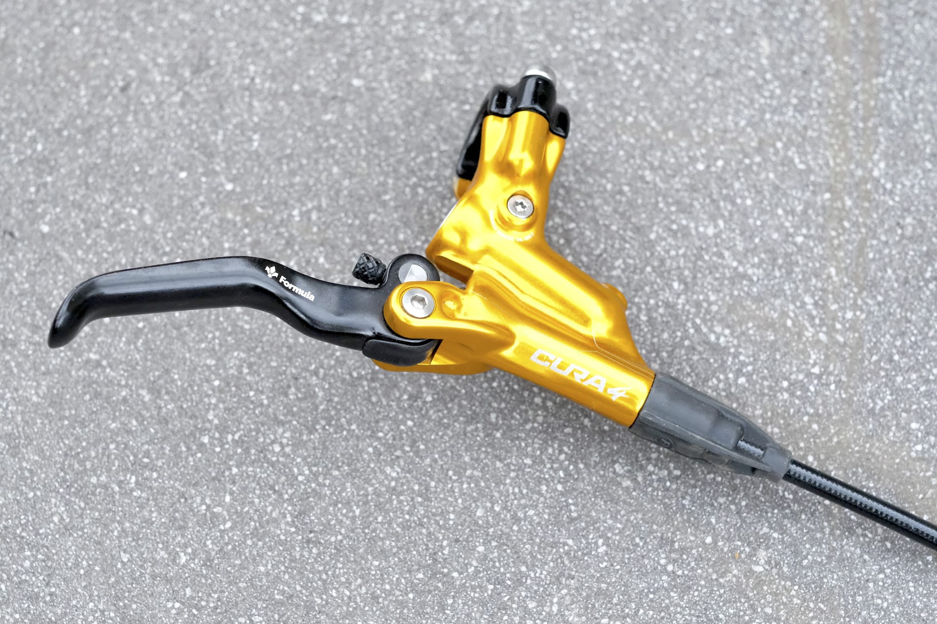 The lever blade of the Cura 4 is classically Formula: smooth and curvy forged little things. Despite the reach adjust, you are fairly restricted in where you have your bite point biting. If you like flat, hooky levers you may not like the Cura 4. If you like a brake to be really grabby and on–off binary, you may not like the Cura 4. If you simply measure a brake by how all-out powerful it is at the top end, there are possibly more powerful brakes. But if consistency and supreme modulation are your priorities, these are the best brakes out there.