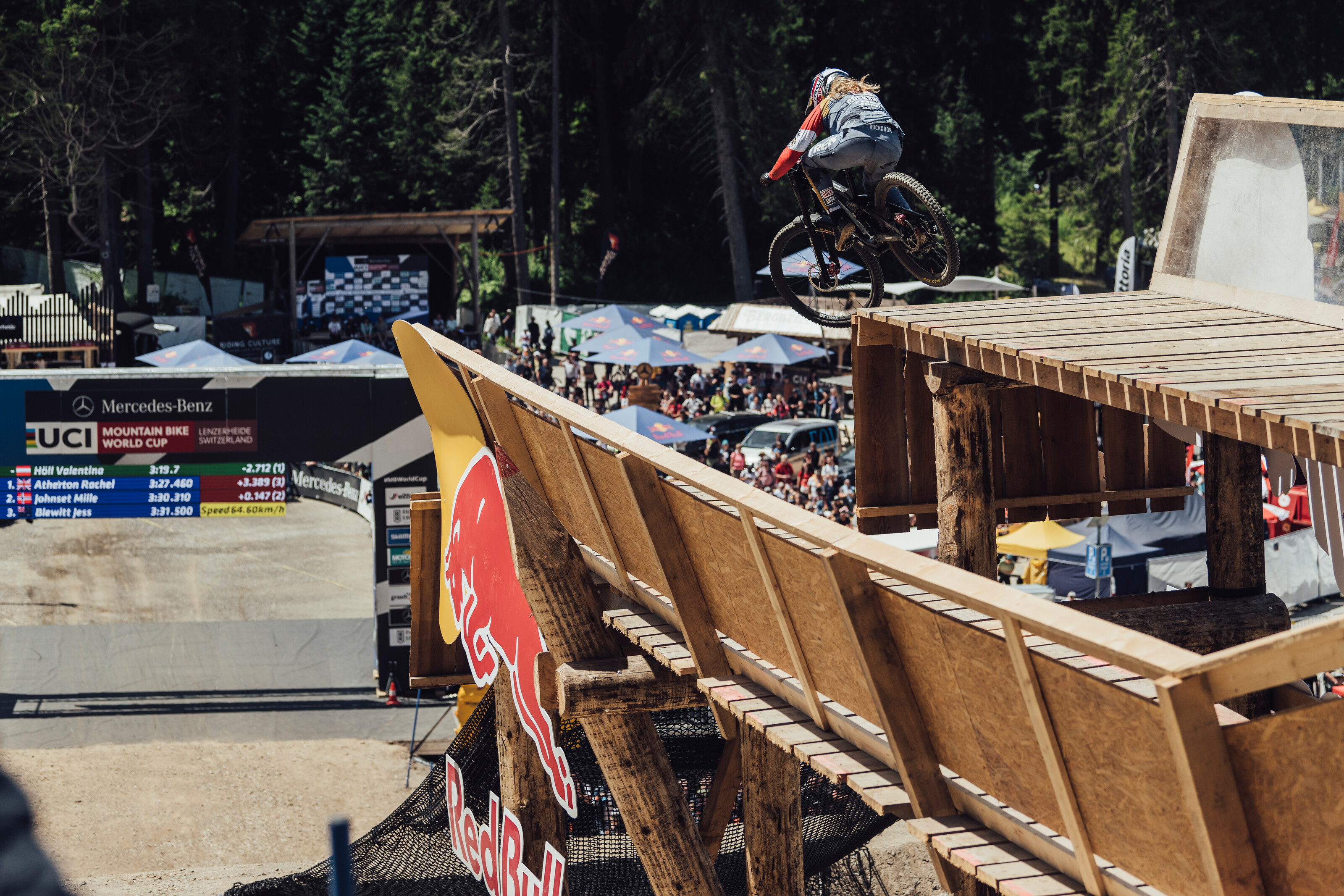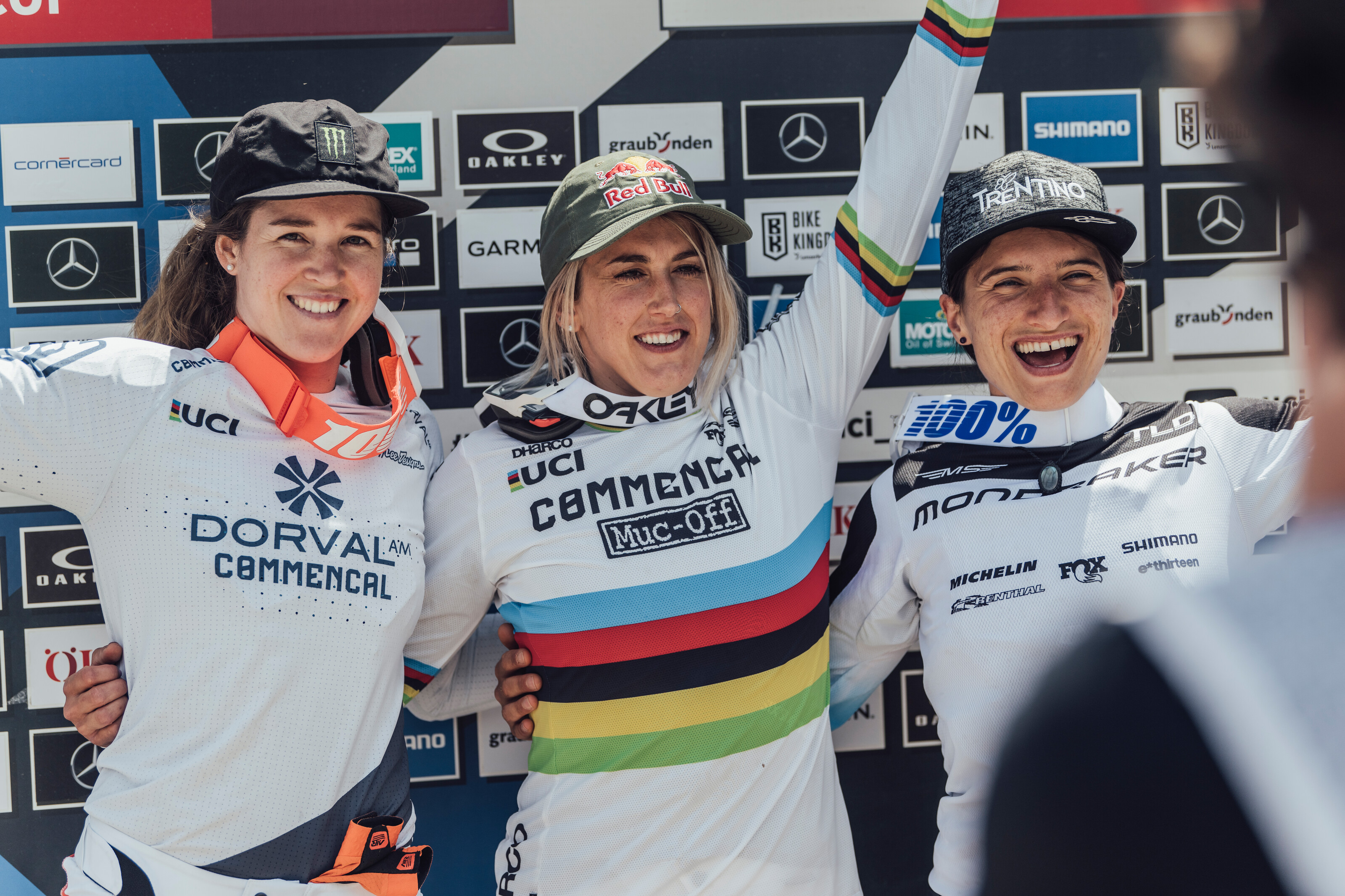Before a pedal had turned on race day the Elite Women’s category was generating more questions than answers. Could Series Leader Camille Balanche maintain the near 5 second advantage she generated in qualification – a huge margin on a track where the entire men’s field of 60 riders were separated by under 10 seconds? How would the rest of the field respond? Rachel Atherton surprised everyone by announcing she was making her long awaited comeback, what could she do? Vali Hoell crashed in qualifying after going fastest at the first split, was she on the same pace as Balanche?