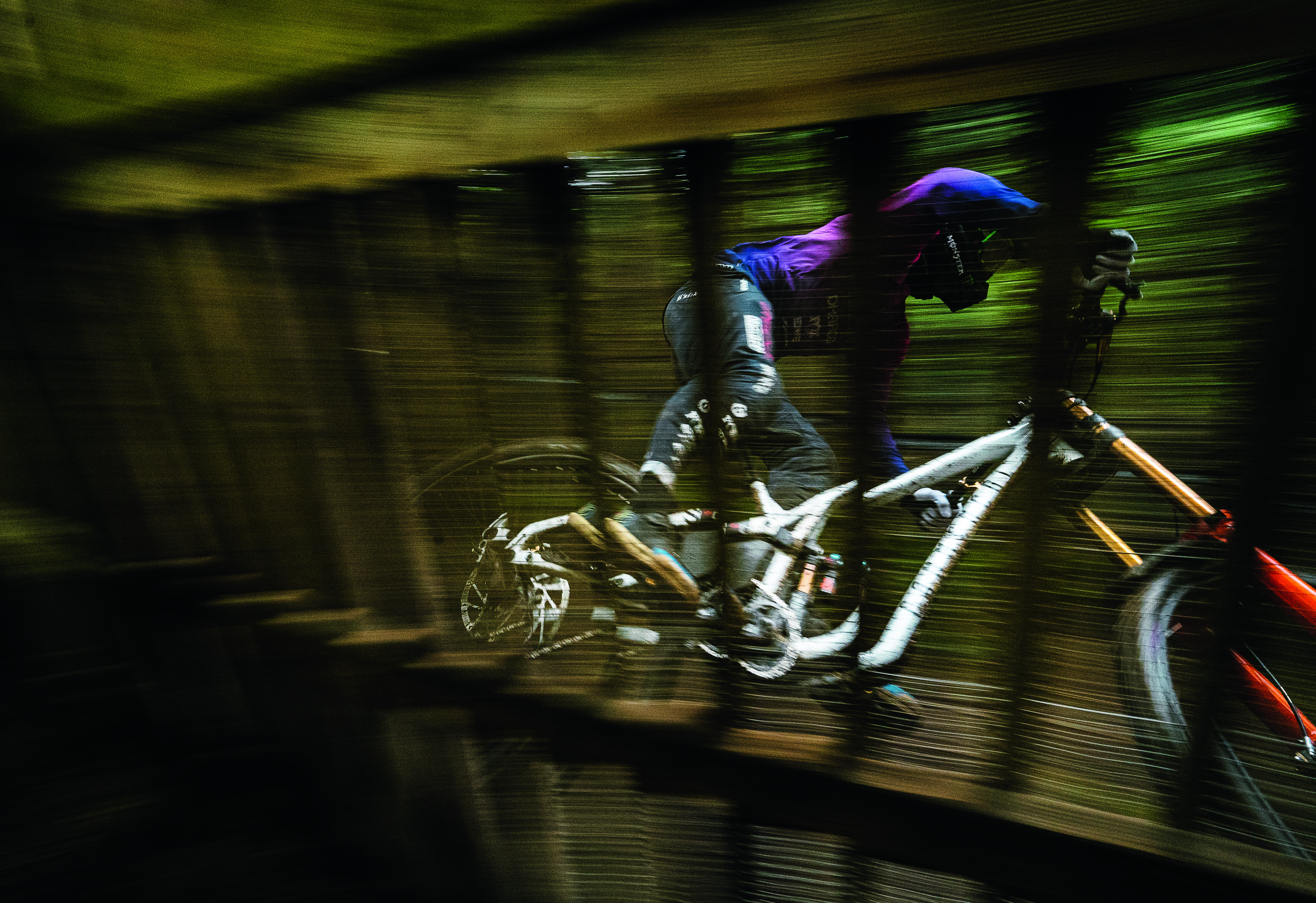 “Nice and wide at 16mm, 1/40 second exposure, f/13 to keep as much in focus as possible without pushing the ISO too far. I’m crouched down in the dark, barely any room to move, my face inches from the near vertical wooden slats of the wall ride. Further up the track, the marshals whistle and cheers from the crowd let me know a rider is coming. With no visual of the track, I’m working solely on instinct and listen for the moments silence as they clear the river gap followed by the rumble of tyres, before panning my camera and firing off a burst.” – James Vincent