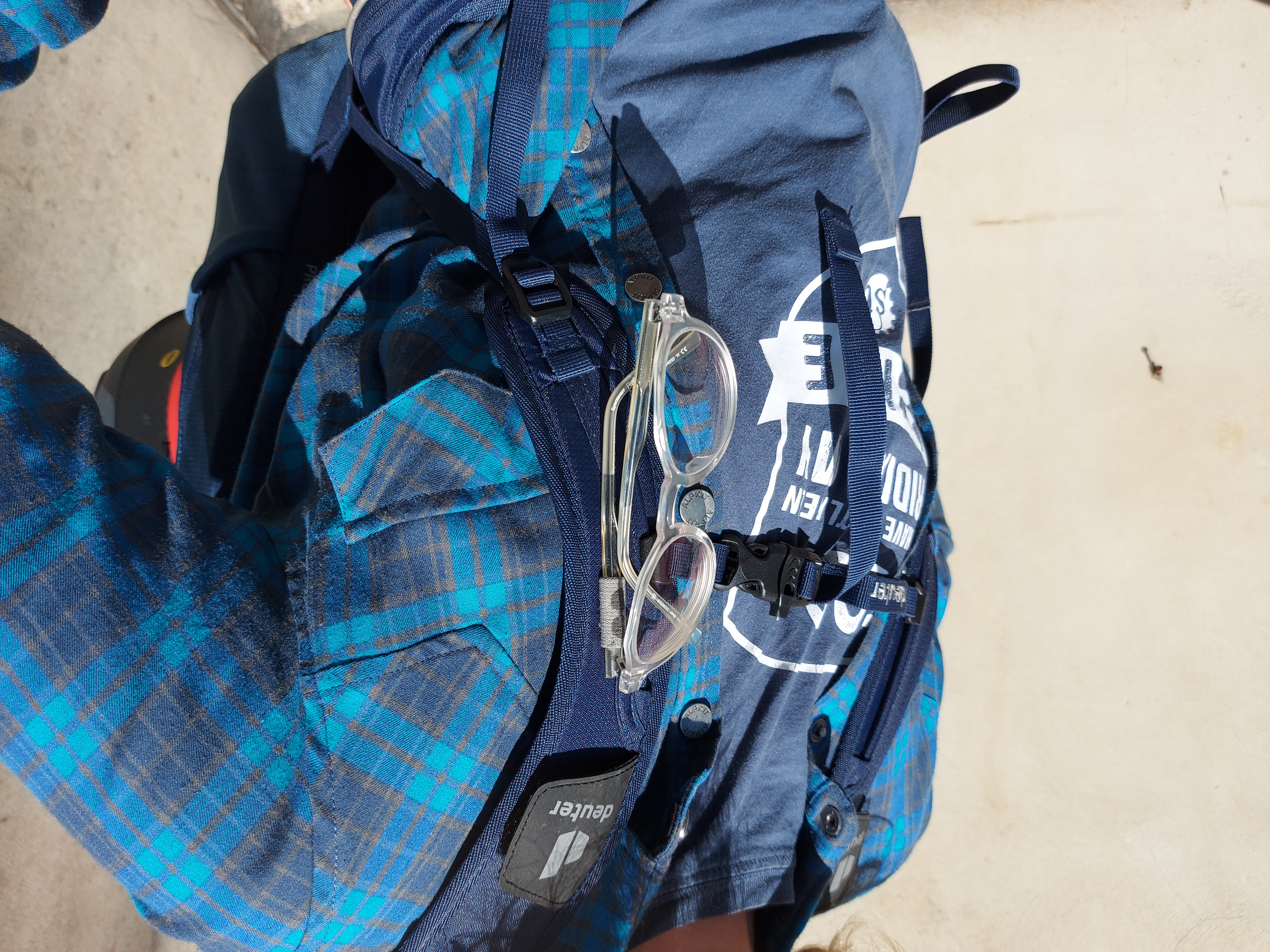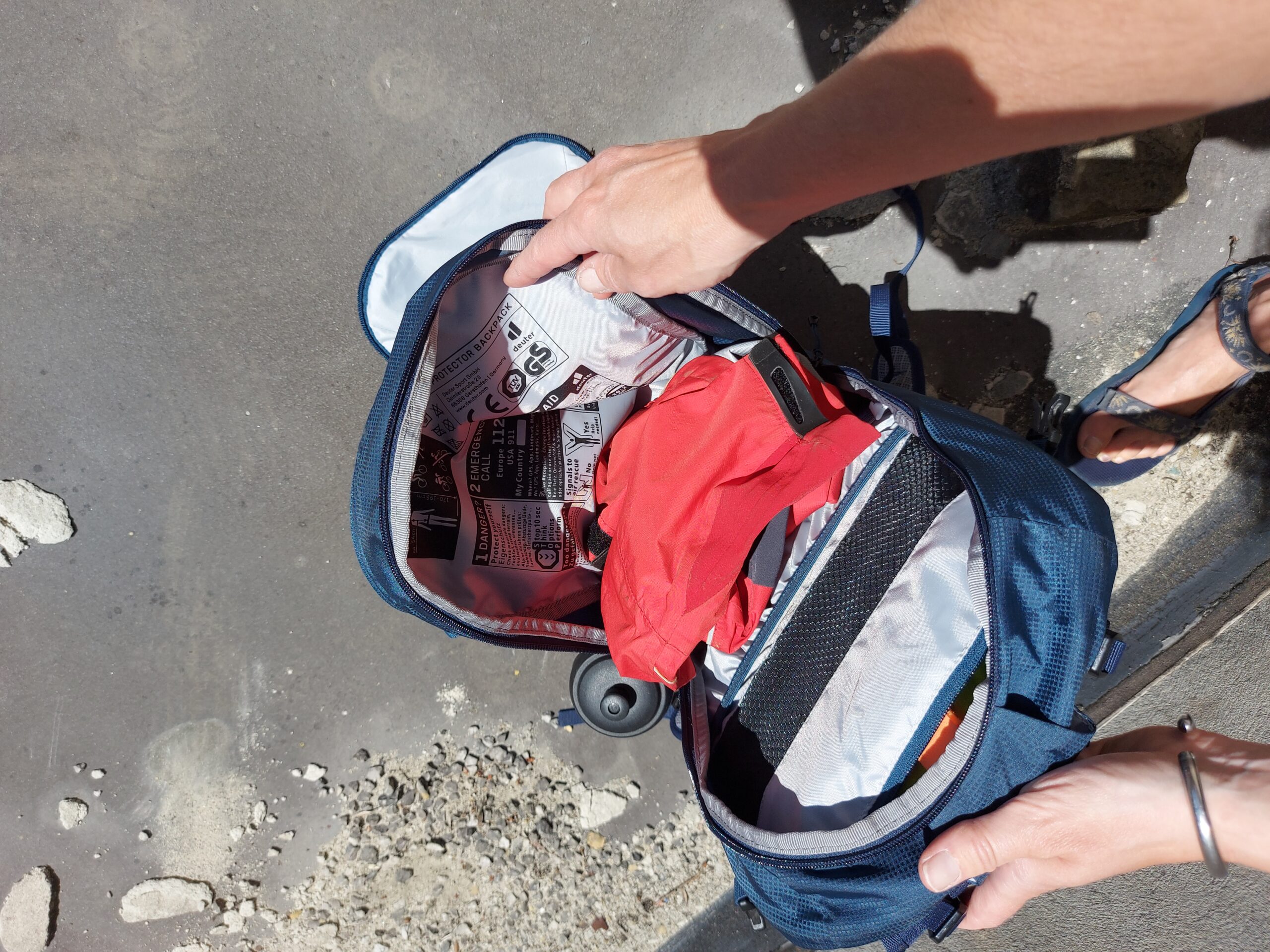 The front pocket of the Deuter Flyt 20 opens all the way out flat, revealing two mesh pockets and two fabric pockets with stretch tops, and a zipped pocket which runs half the depth of the bag. Unlike the Attack Enduro pack, there are no additional mesh pockets on the outer flap as it opens up, though this probably makes it easier to open the pack without losing the contents. There is no fleecy eyewear storage pocket on this pack, although one of the main shoulder straps has an elasticated loop which is meant for glasses – though that seems to me like a one-way ticket to breakage.