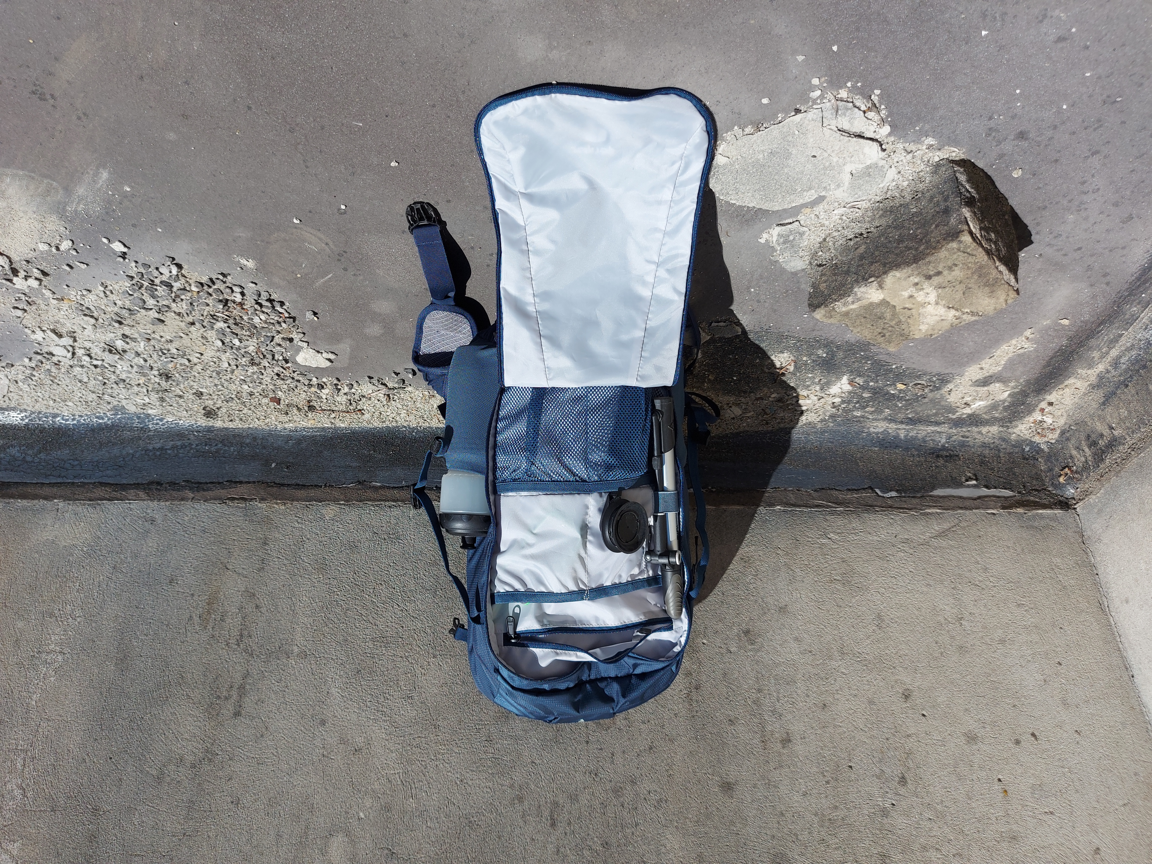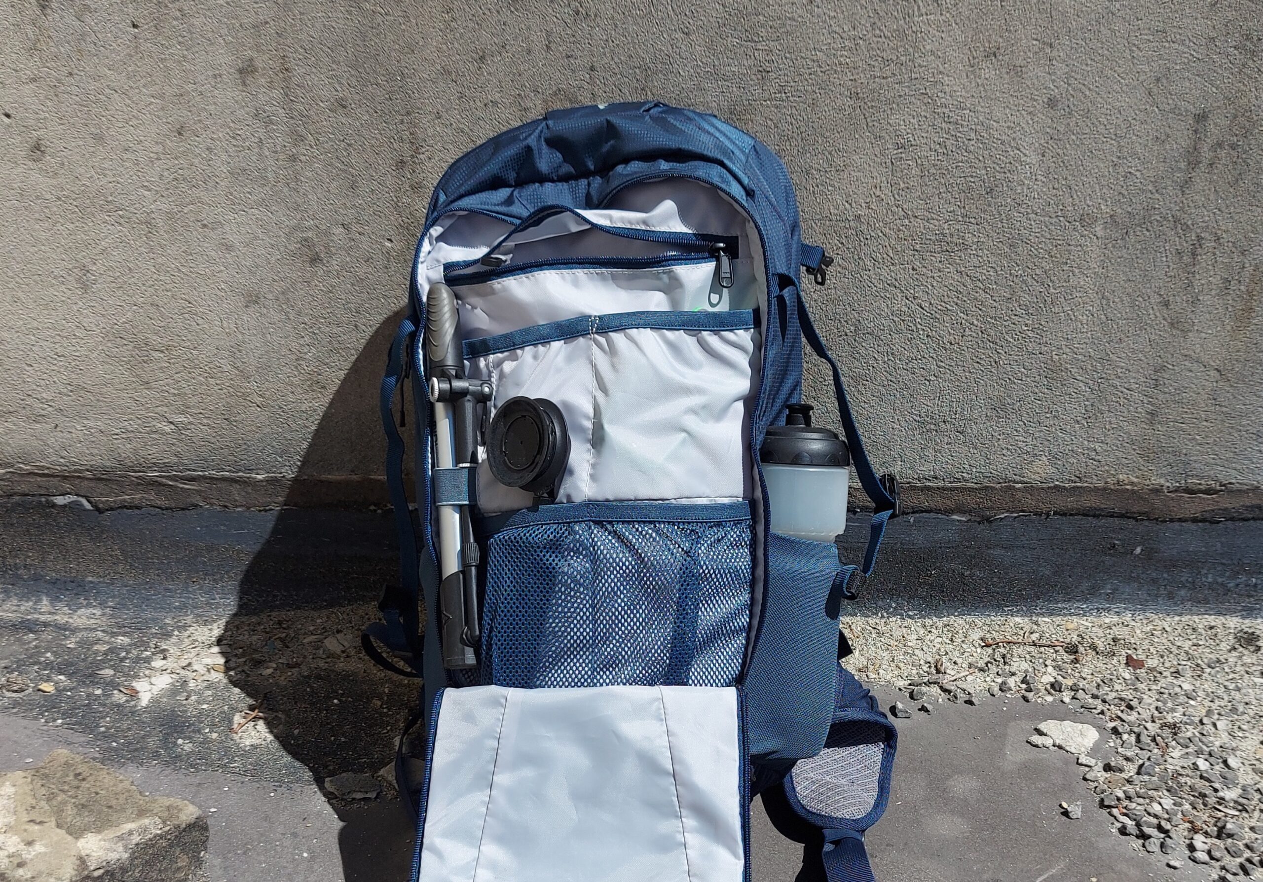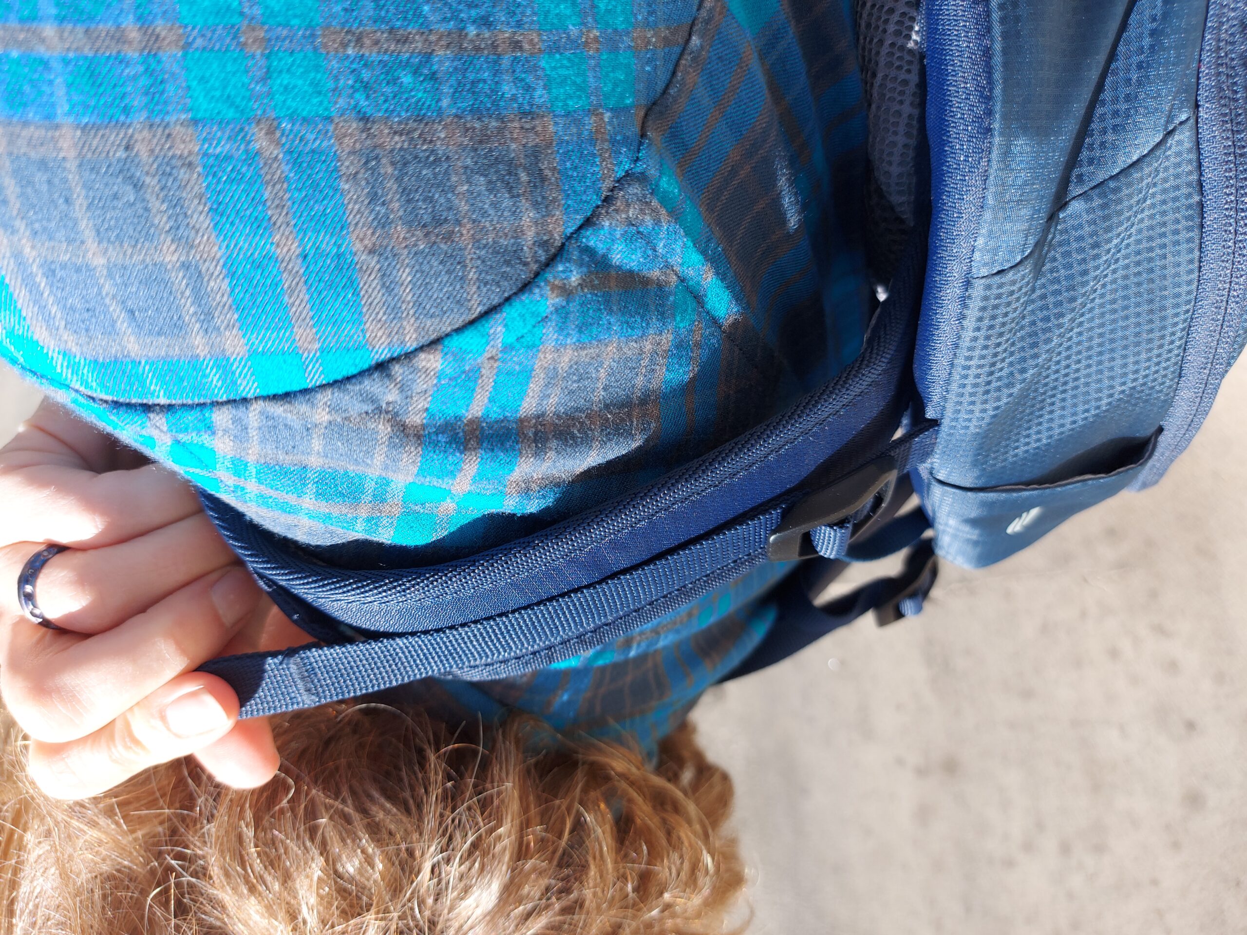 On the outside edges of the bag there are two stretchy mesh pockets big enough for a bottle. The hip strap ‘wings’ are barely padded and each wing has a small zippered pocket. From the wings, a standard canvas strap with clip extends around you. There’s also an adustable chest strap, and the position of the rucksack’s shoulder straps can be adjusted top and bottom.
