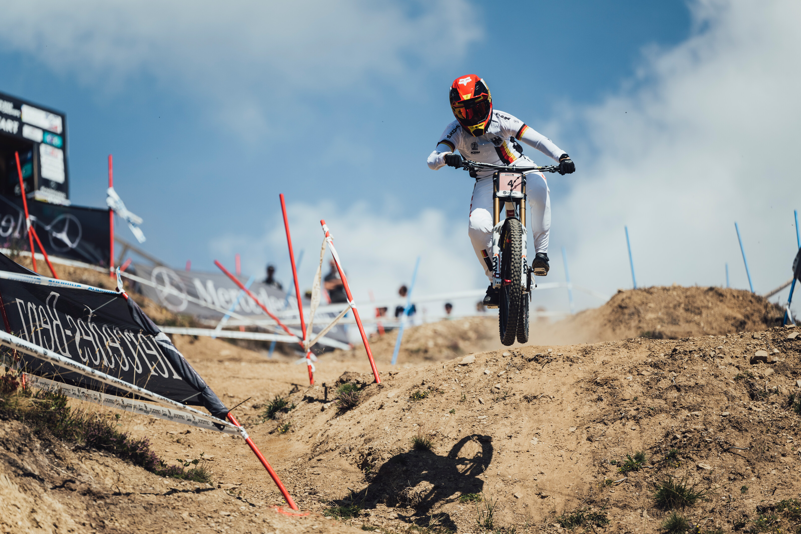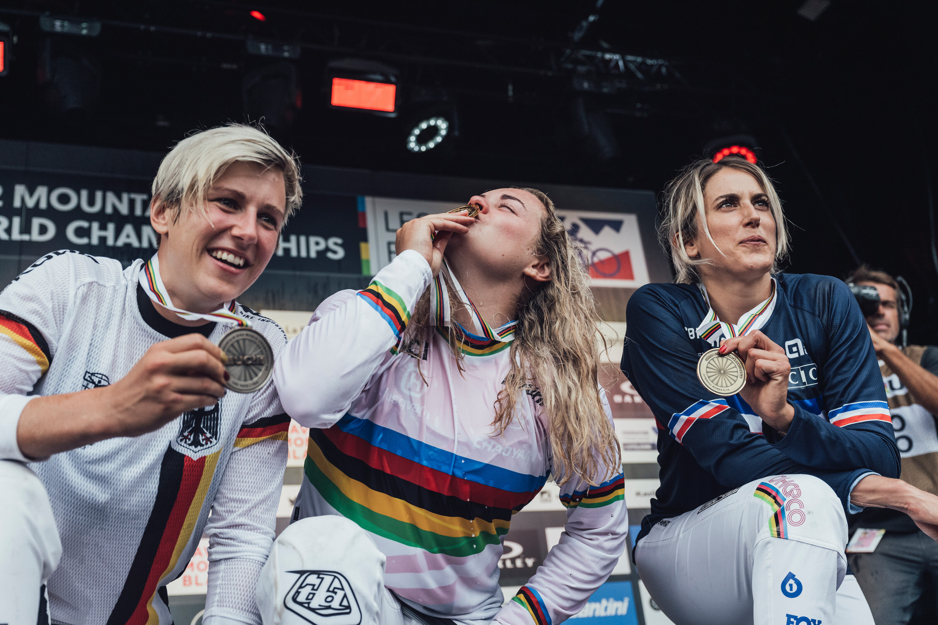 With her collarbone double plated, Switzerland’s Camille Balanche is the final rider in the start gate. She rides like it isn’t bothering her at all but surely she couldn’t live with Hoell and Hoffmann? 1.1 back at Split 1, it stretches to 4.4 at Split 3 and by that stage we knew Hoell will be the new World Champion, but could Balanche medal? No! She crosses the line in fourth just 4 seconds back but with that performance she will be confident she can secure the World Cup overall next weekend in Val di Sole. At just 20 years of age Vali Hoell becomes Austria’s first DH World Champion, Nina Hoffmann takes Silver and Nicole the Bronze.