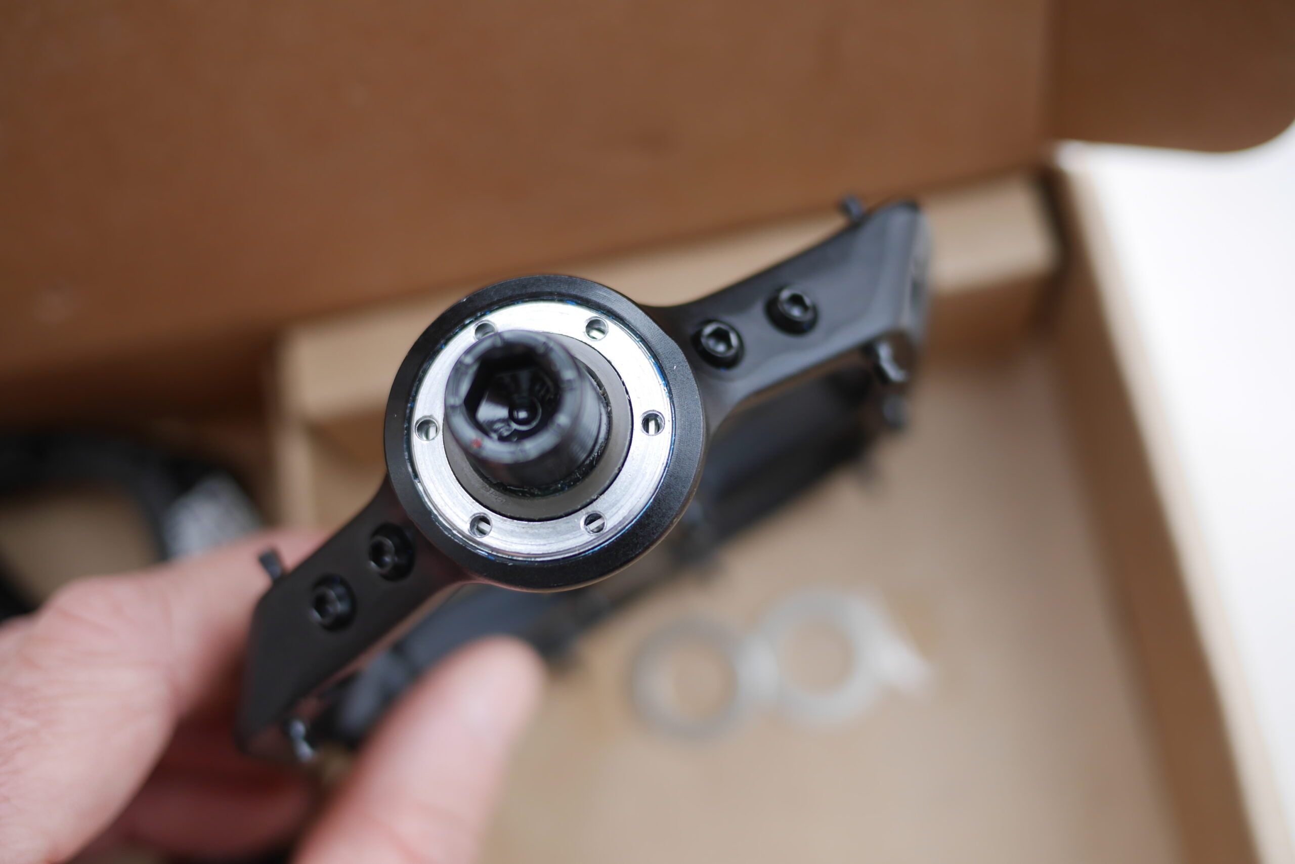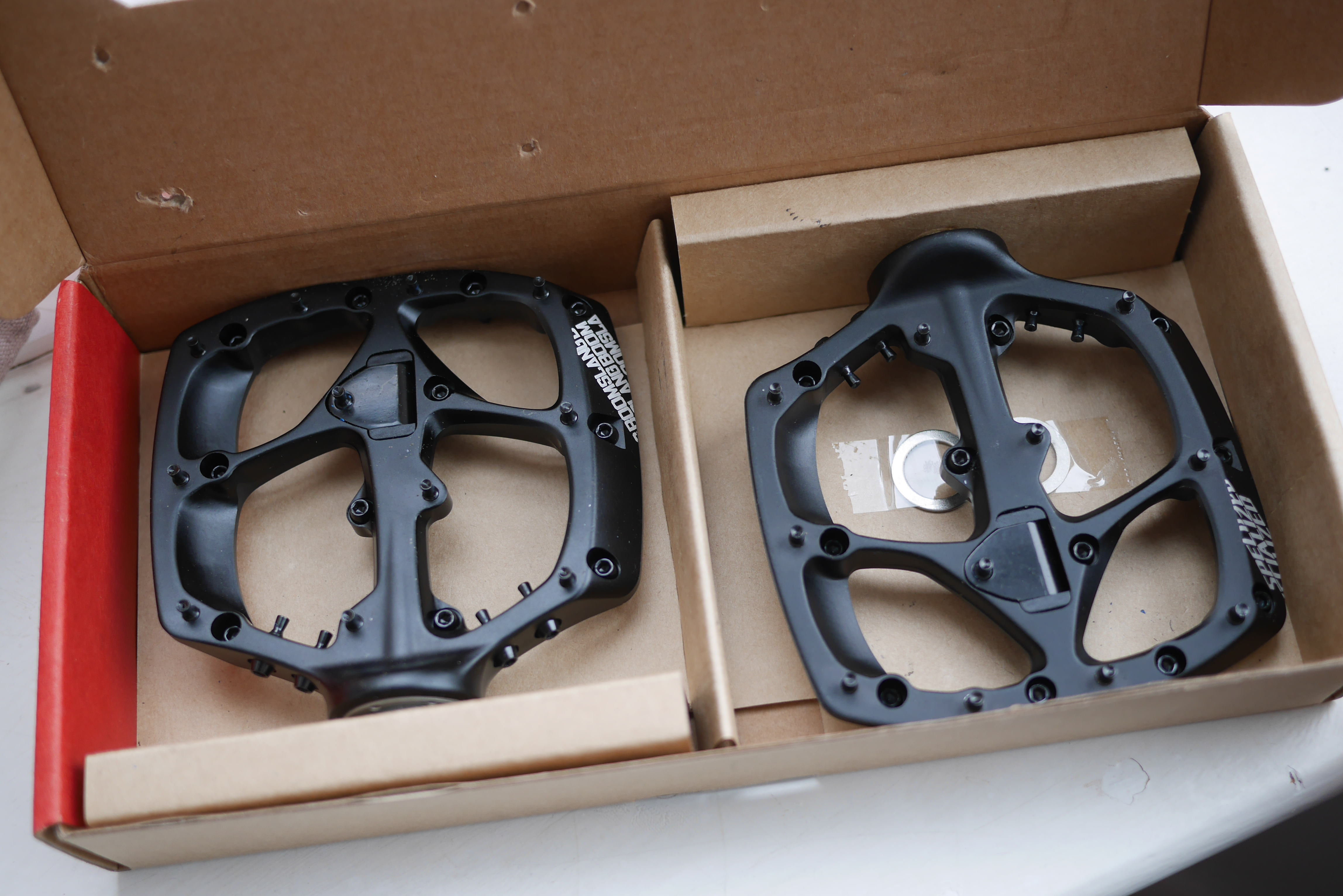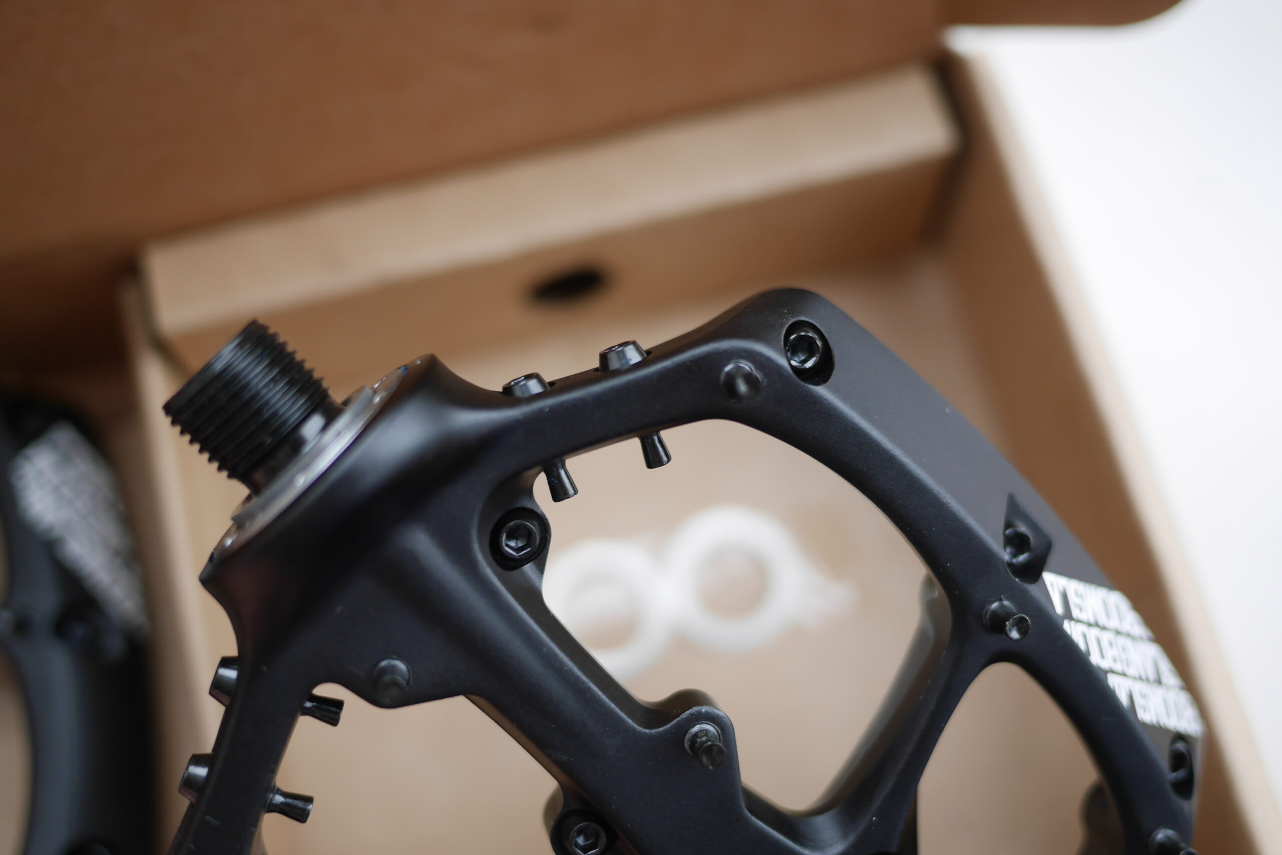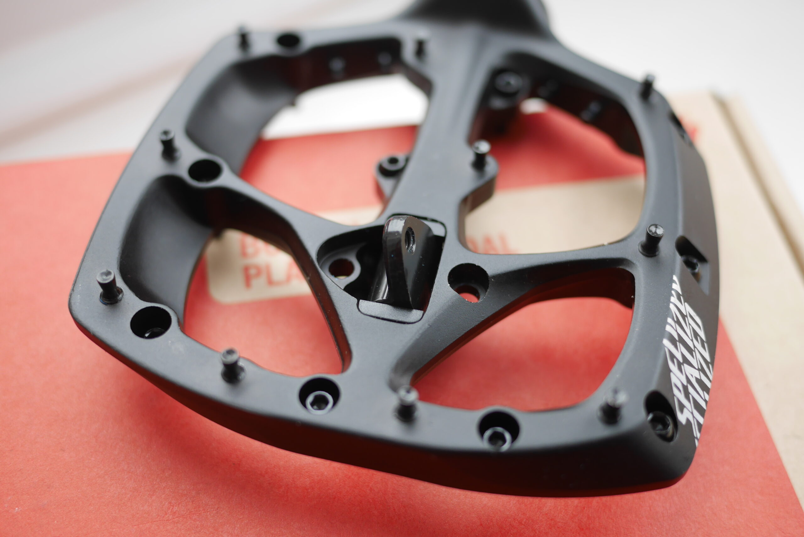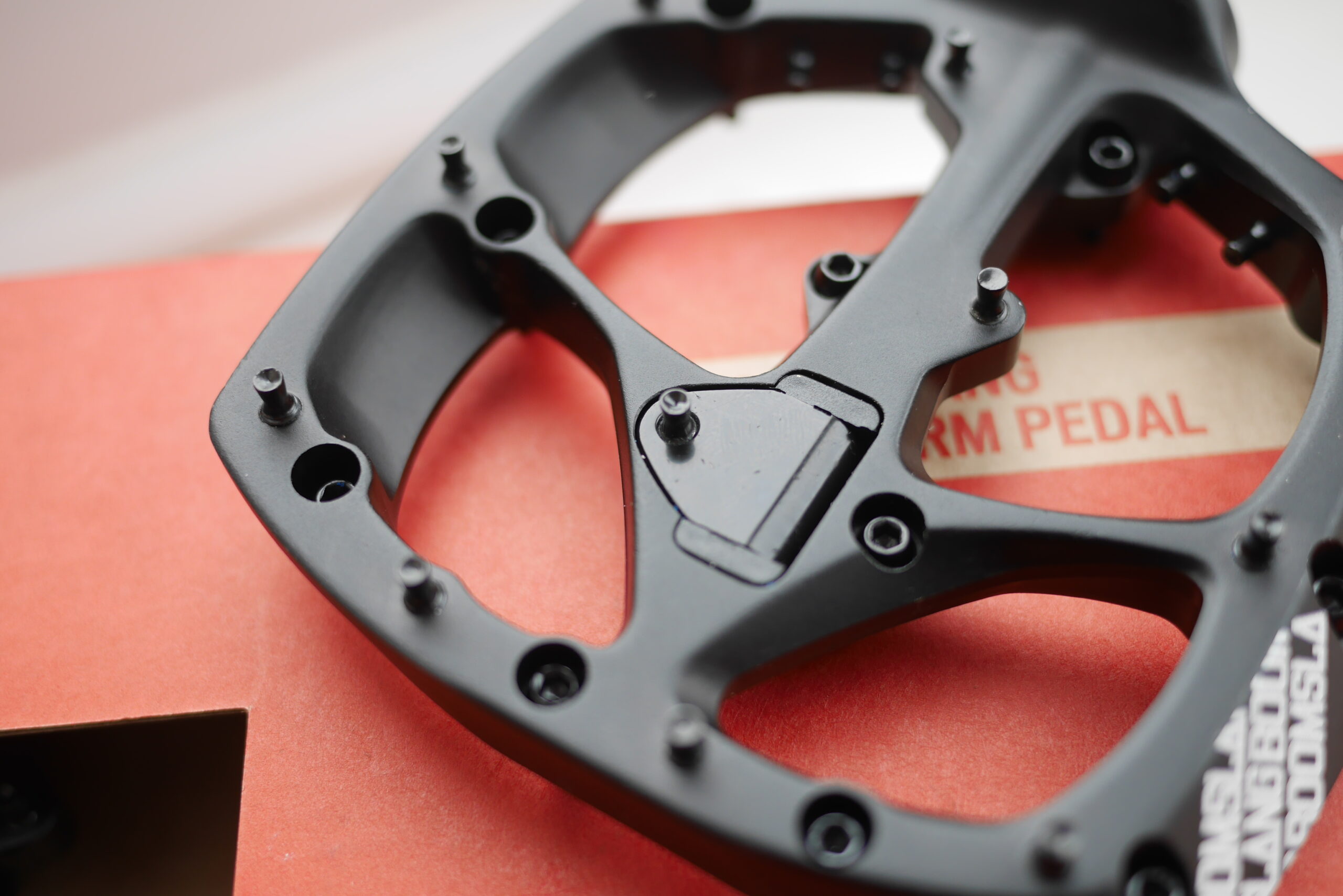 Boomslang pedals have been around for a while. So long in fact that they’ve arguably just been a bit forgotten about. 10mm thickness at centre. Undercut pins. Pedal body carriers four spare pins for easy replacement. Tapered outside pedal edge for maximum grip and ground clearance. 110x108mm. Innovative spinny trapdoor thing for accessing needle bearings at the outer end of the axle spindle. No exactly cheap pedals but it’ll be interesting to see if their bearing-not-bushing design results in a longer lifespan compared to other pedal designs.