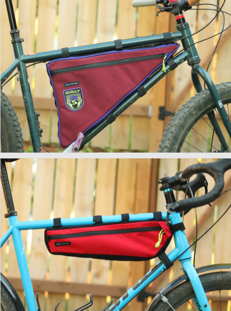 Travis is currently working on a prototype frame bag in many colours, in both full and half frame sizes, made with 1000d cordura, and water resistant #8 YKK zips, seen here.