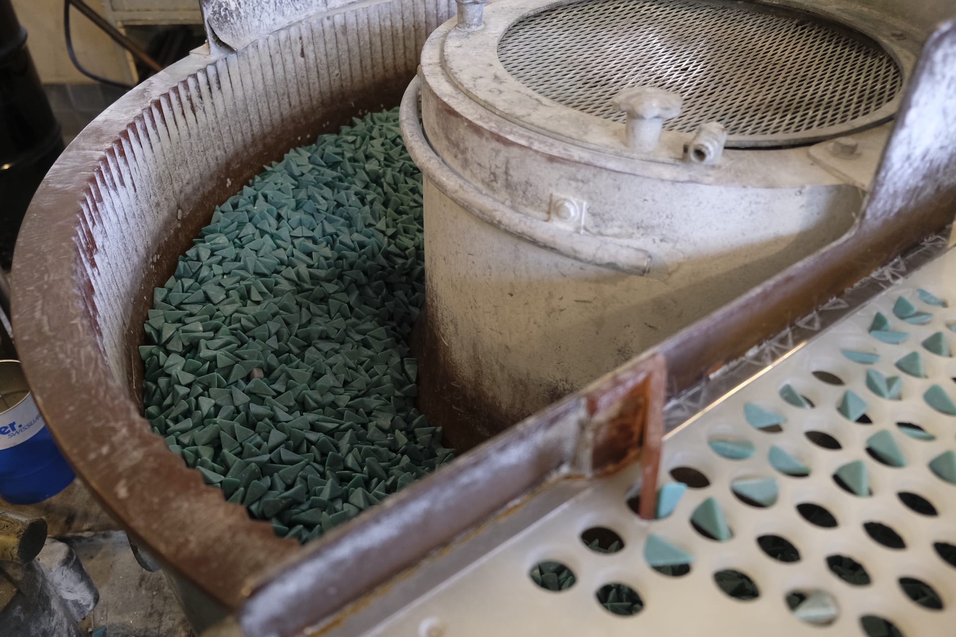 PMW aims to make products in three-month rolling batches, reducing the set-up time and hoping to anticipate the likely number of items required before the schedule rolls around to time to make the next batch. PMW tries to organise batches so that something that needs a really sharp new tool for a precision or detailed cut gets done first. Then the slightly blunter tool may be used to make something else that needs a little less sharpness to get the right finish, and so on. Joe, a machinist and handy mountain bike racer in the early days of mountain biking, has a loupe and a system going on. He knows which tools are heading towards blunt, which are sharp, and which will work on which metal or product. To us, it looks like a pile of miscellaneous drill bits. We resolve not to touch or knock anything over.