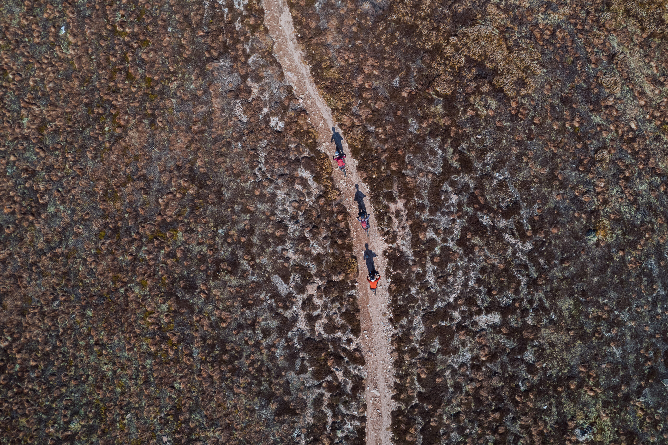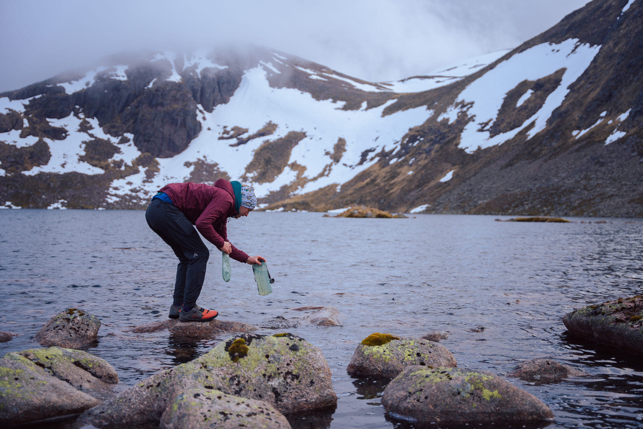 After an early night the three of us woke naturally at around 5am to gloomy skies and enough time to start our day with a cup of metaphorically connected pouch brewed coffee. The spicy ribbon of trail dropping steeply from our hanging valley towards the Hutchinson Memorial Hut had the perfect aspect to be filled with golden morning light, instead the morning clag left us squinting through the haze to get a sense of our surroundings. As we land at the bothy at 7am the curtains are still drawn. The friendly Munro baggers’ wool socks either can’t have dried fully yet, or their owners are still recovering from sharing their exuberant yomping tales in all their intricacies. Leave no trace obviously didn’t apply here – we picked our way through scattered tufts of semi-disintegrated toilet paper and decided to give the hut a miss altogether.
