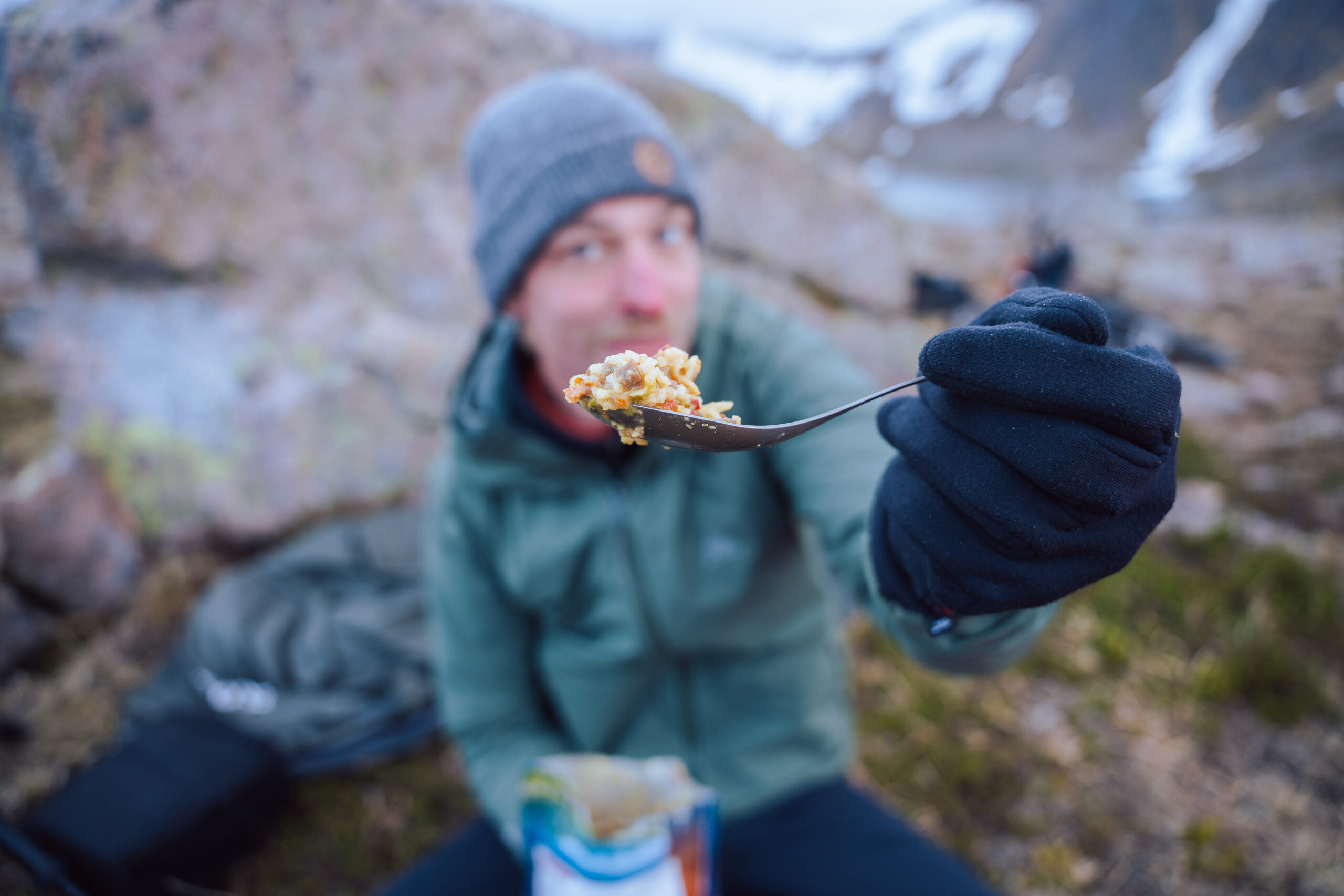 Despite the pleasant weather accompanying us at the start of the day, a strong easterly breeze picked up to funnel a much more dense cloud base into our hanging valley as we busied ourselves setting up camp for the night. As the mercury began to drop sharply, I was forced to don all available clothing layers, well aware that I’ve lost most of my built-in insulation over the course of the last five years. I’m at high risk of getting so undercooled that not even our highly calorific freeze-dried meals or copious amounts of tea would have had the power to restore enough body heat to warm my sleeping bag and get a comfortable night’s sleep.