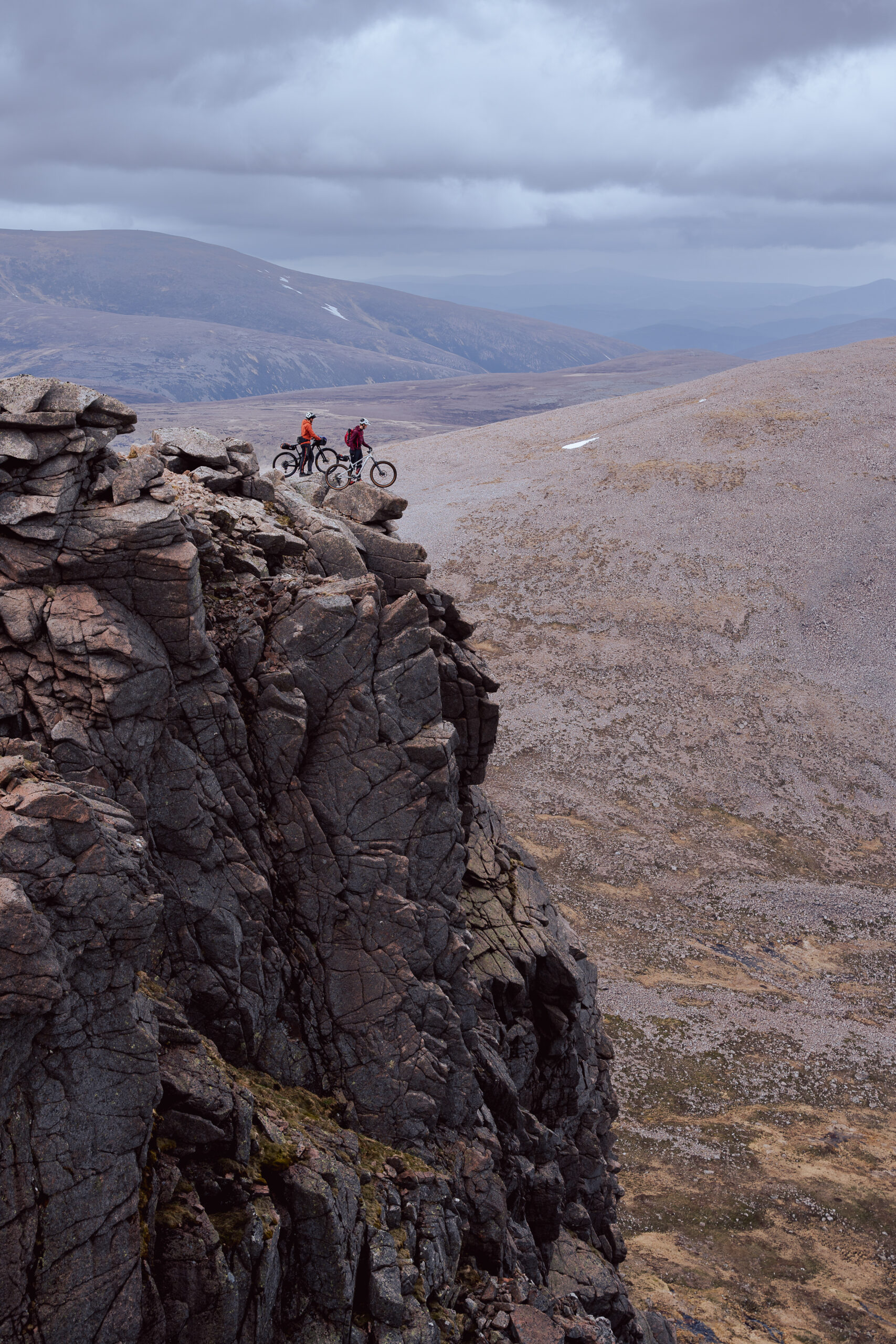 From above, the Cairngorm landscape looks to be largely made up of dramatic rolling hills, their summits blunted through years of exposure to the elements and deprived of the jagged edges more commonly found in their western counterparts. As we dropped towards Coire Sputan Dearg this top-down illusion couldn’t be further from the truth. Huge U-shaped valleys are crowned with dramatic cliff edges that wouldn’t look out of place in the Alps, their dizzying heights reminding us of our privilege to be able to traverse through this remote, hostile and mountainous terrain. The trail skirted through a technical, rocky section before it spat us out next to a huge gully, its gaping mouth wide open like a Venus flytrap, ready to punish both rider and rig for any form of sloppy understeering.
