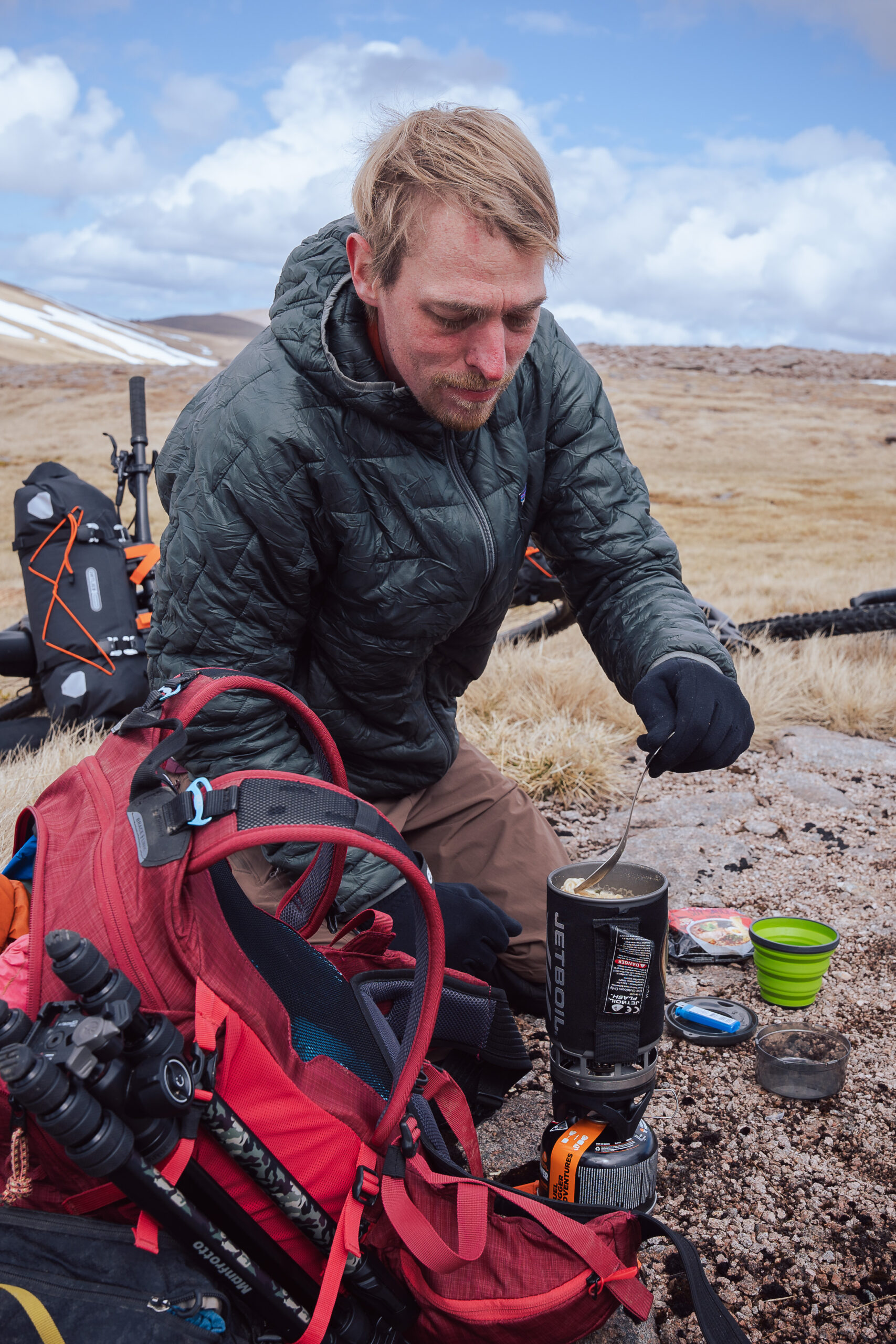 As the valley became more defined and with large swathes of spring snow still stubbornly filling the line of least resistance and holding large sections of the trail hostage, we butchered our way down the mountain as we attempted to link up sporadic parts of singletrack that bullishly emerged from their winter hibernation. Seat slammed, with both feet and tyres making a quad-pod formation, we dug our heels into the snow to attempt to slow our ever-increasing pace as we pointed our front wheels down the slushy remnants of winter’s blanket. This was a different type of thrill, not one rewarded for carefully executed line choices through rocky crux sections, but rather for making it down just-in-control passages of the slush puppy snowpack, primed to gobble up a front wheel and send us over the bars without any notice. We were all howling with elation when we reached the loch and our campsite for the night. Just enough stretches of dry trail were linked up between point and shoot descents to offer a true sense of the area’s rawness. It was exactly as per the doctor’s orders.