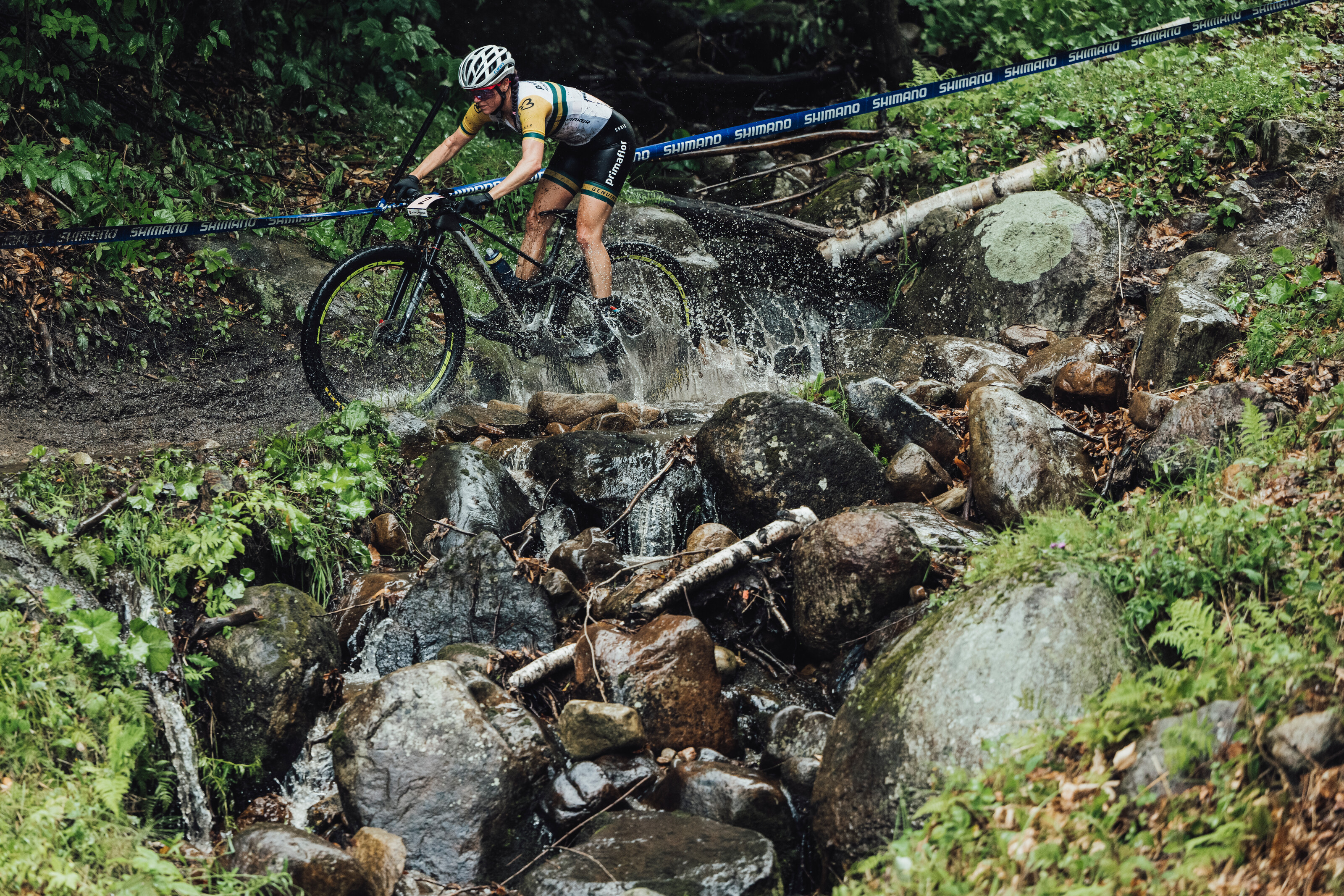 The race started with a huge crash involving Emily Batty, amongst others. She fought back to finish 18th. With the conditions going from super dry to pouring rain, the technical track became incredibly slimy, causing even more crashes. Gwendalyn Gibson, the short track winner at Snowshoe, was amongst those who crashed. Unfortunately, she had to pull out of the race as she hurt her bad knee and it began swelling. In her own words, “Usually a DNF is not an option to me but with Worlds just around the corner I had to make that really tough decision”. Alessandra Keller was another woman who was having a strong ride, only to crash mid-way through the race.