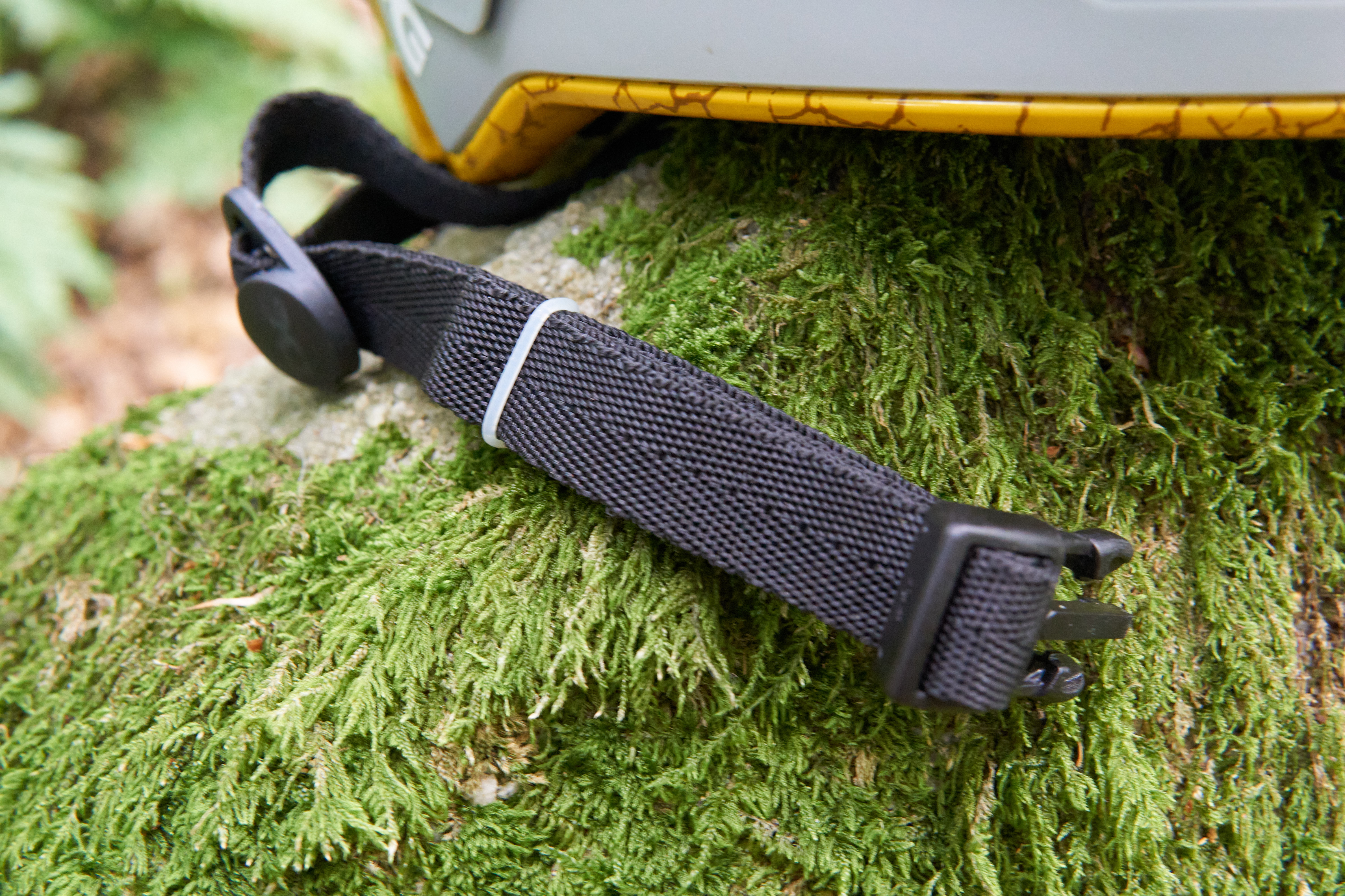 The chin strap has adjustable 3 point sliding buckles and a simple plastic side-release closure. Slightly at odds with the high-quality feel of the helmet, the loose end of the strap is held in place by a cheap-looking rubber band.