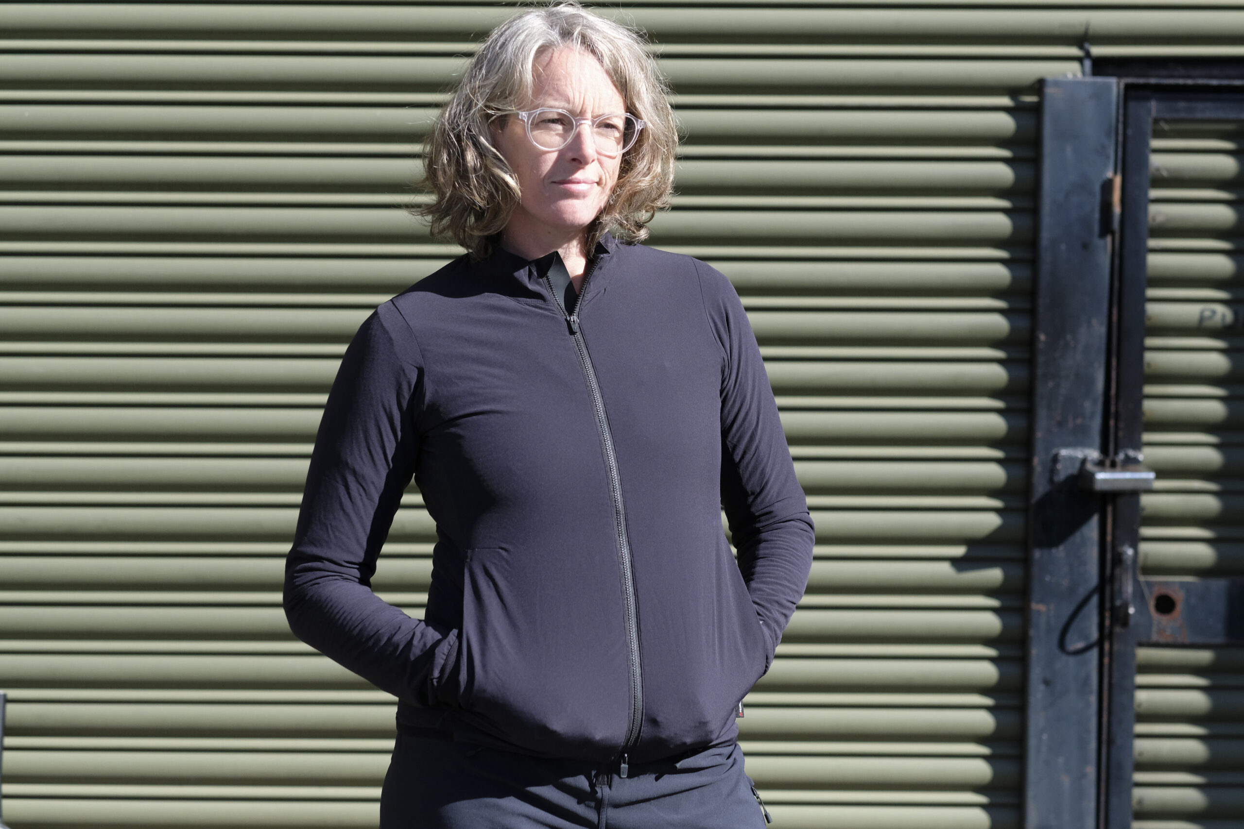 A floaty light windproof jacket for throwing on in light showers or when the icy blast hits you as you round the lee of the hill. Scrunches down to almost nothingness, pulls on over your head with a half zip. Hannah is in a medium here, which would make for a snug and non-flappy outer on a bike.