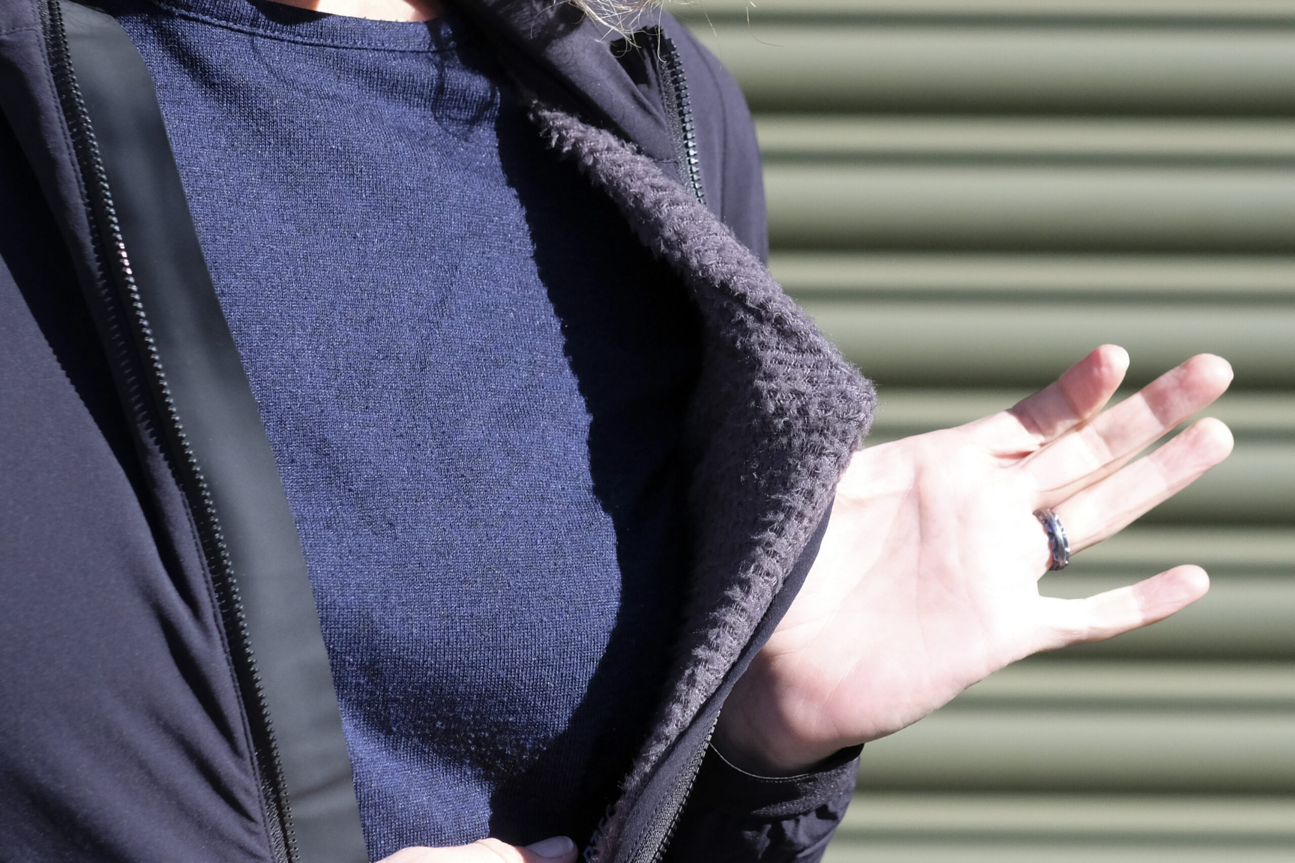A fuzzy fluffy Polartec Alpha lined jacket designed to be worn as a mid layer on grim days. It’s also available in a rather fetching maroon colour, but Hannah will be blending into the darkness in this black number. Or just wearing it at home to keep the heating off a little longer.
