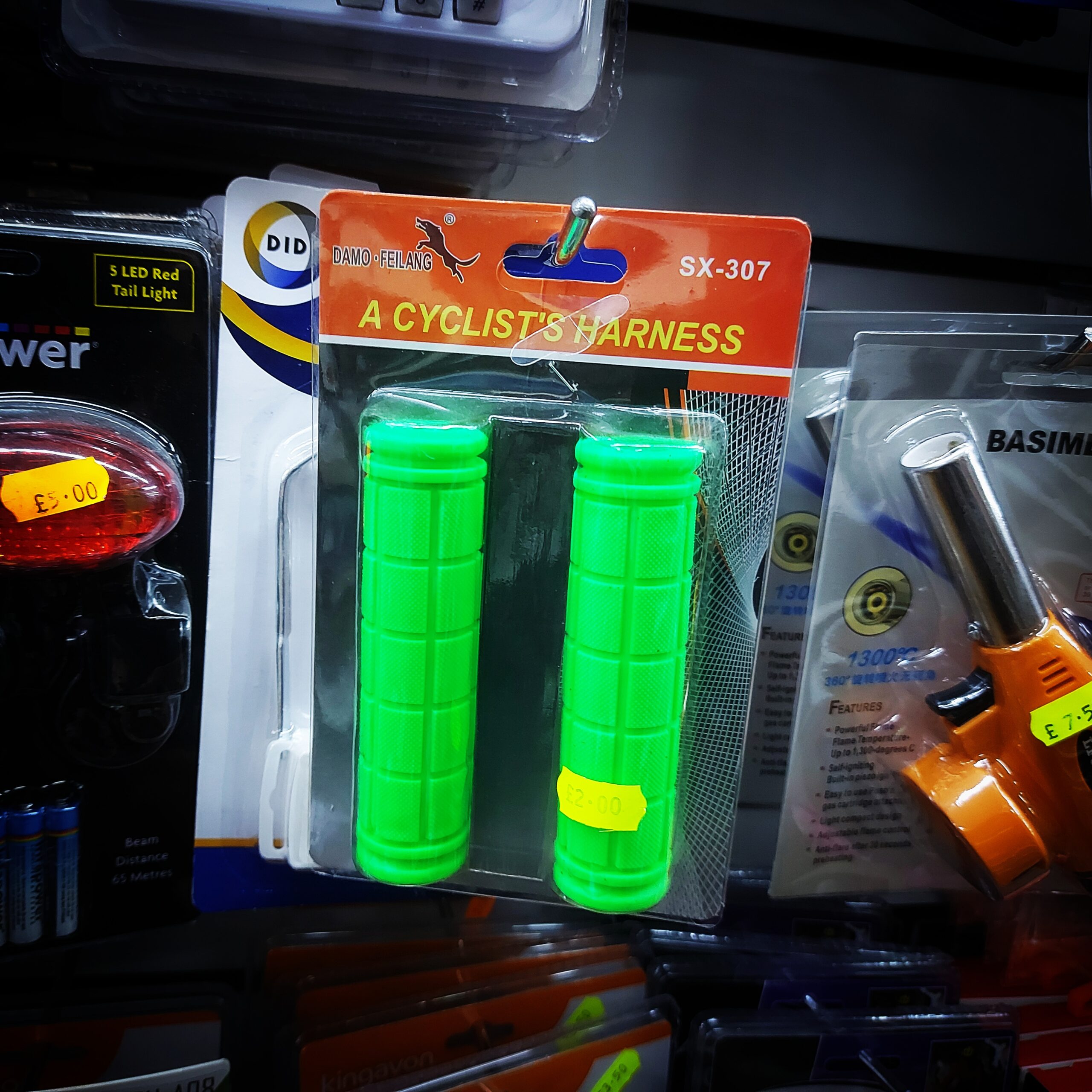 My local sells-everything shop is possibly my favourite shop. I sometimes take the kids there for a day out (did I mention I was cheap?) because there’s just so much to see and wonder at. I didn’t buy these grips – sorry, Cyclist Harness – but I thought you all would to see them.