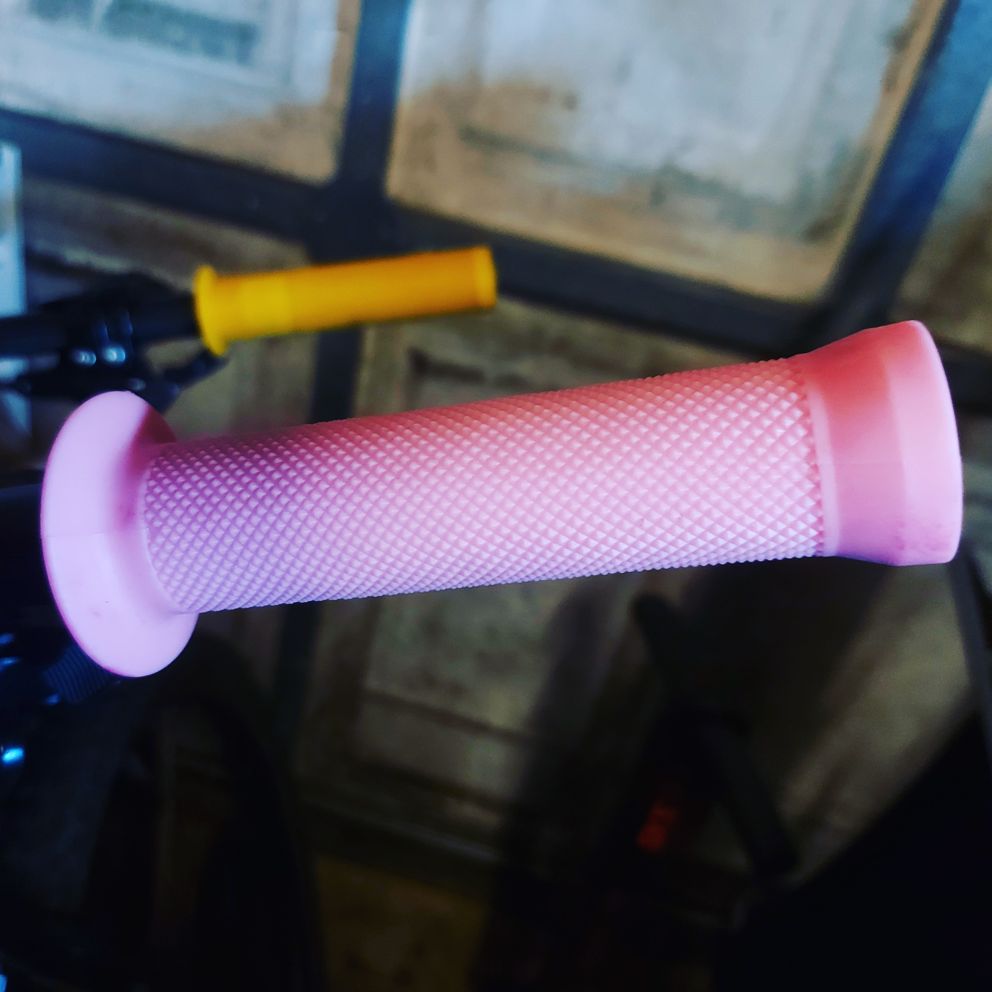 Well, a bit of internetting lead me to this YouTube vid from Bike Mag (RIP) which basically says that shot-peened finish alloy handlebars will always lead to spinning push-on grips. After parcel taping the ends of my alloy Thomson bars… it seems to have done the trick. Anyway, I’m giving the concept another go, initially with these cheap AF (and harsh AF) push-on grips from Clarks. Because they are pink and cheap. Like me.