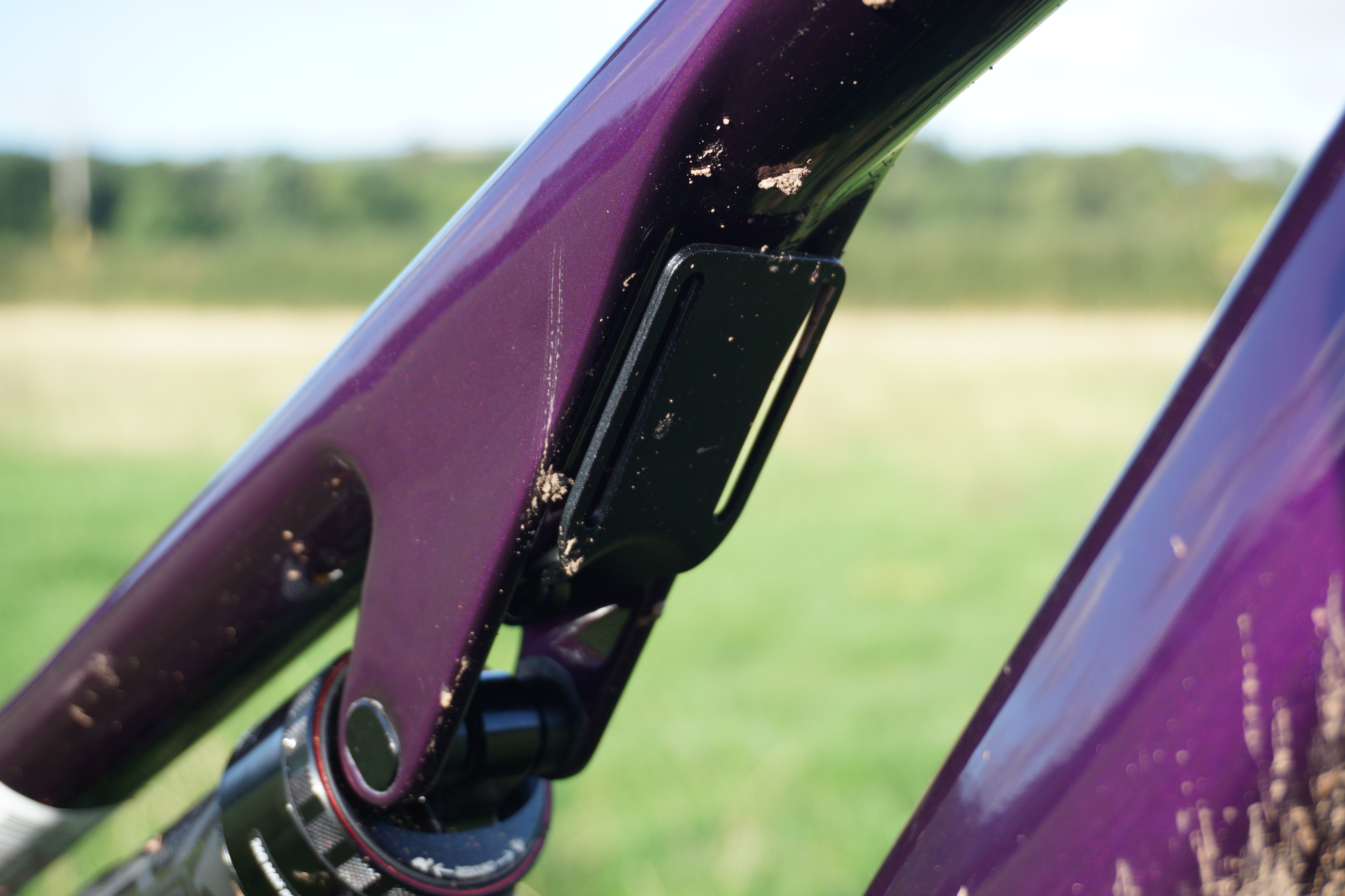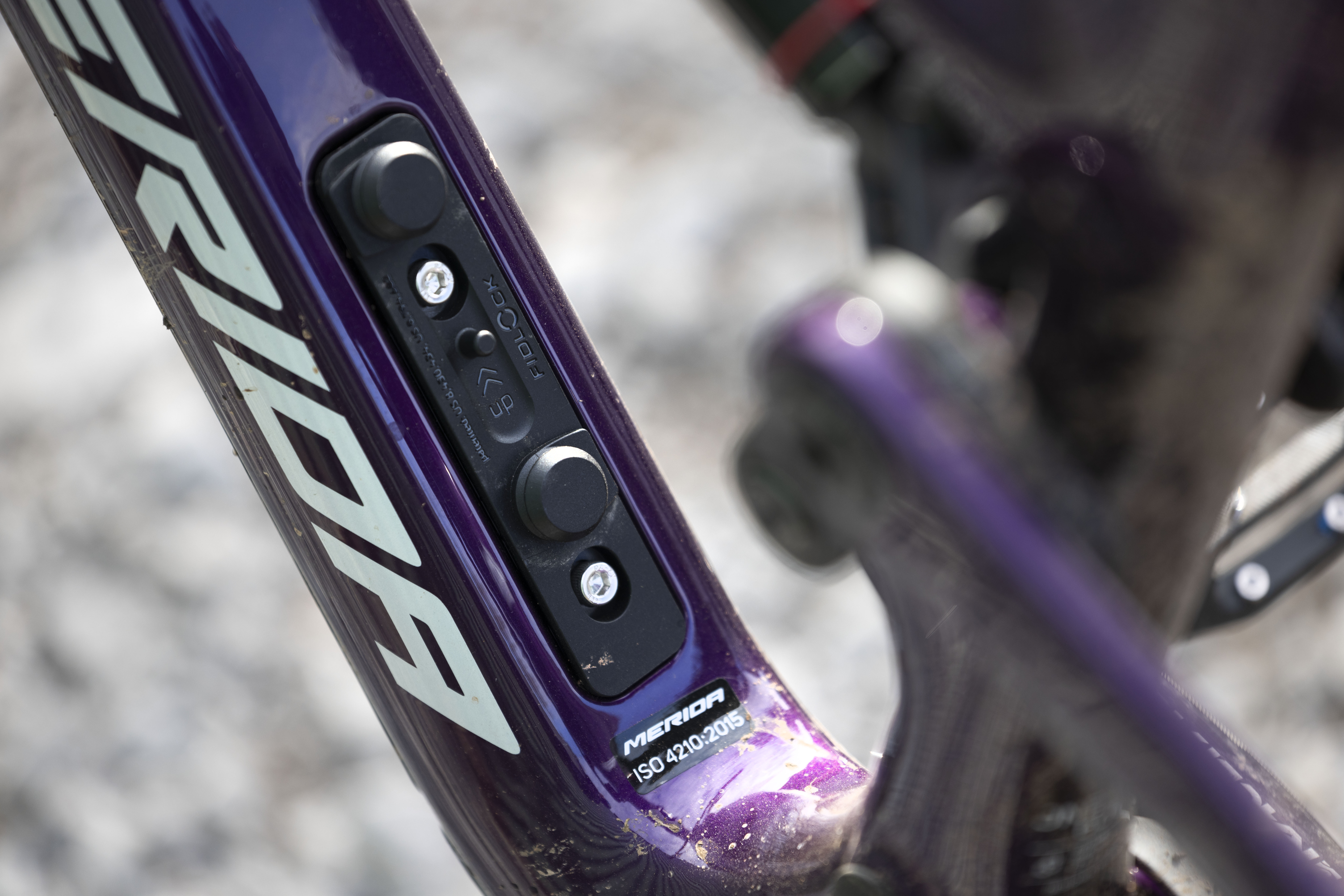 I particularly like the way Merida has thought about the on-trail maintenance with an integrated Allen key tool in the rear wheel axle that will tend to most bolts on the bike. All the bolts and hardware associated with the suspension design are one-sided to tighten and loosen with a single tool. This should considerably reduce the faff time on the trail. The axle key tool also opens up the Merida Service Port via a single bolt. This not only gives you access to the internal cable routing but also allows you to stow away some emergency items like a spare mech hanger, tyre levers and even a pump inside a long skinny tool roll that is stashed up in the downtube. You will find a multi-tool tucked up between the saddle rails and on the underside of the top tube you will find a base plate for housing a spare tube. All models with the carbon frame use the magnetic flush fit Fidlock bottle mount to allow the use of a proper size bottle inside the frame.