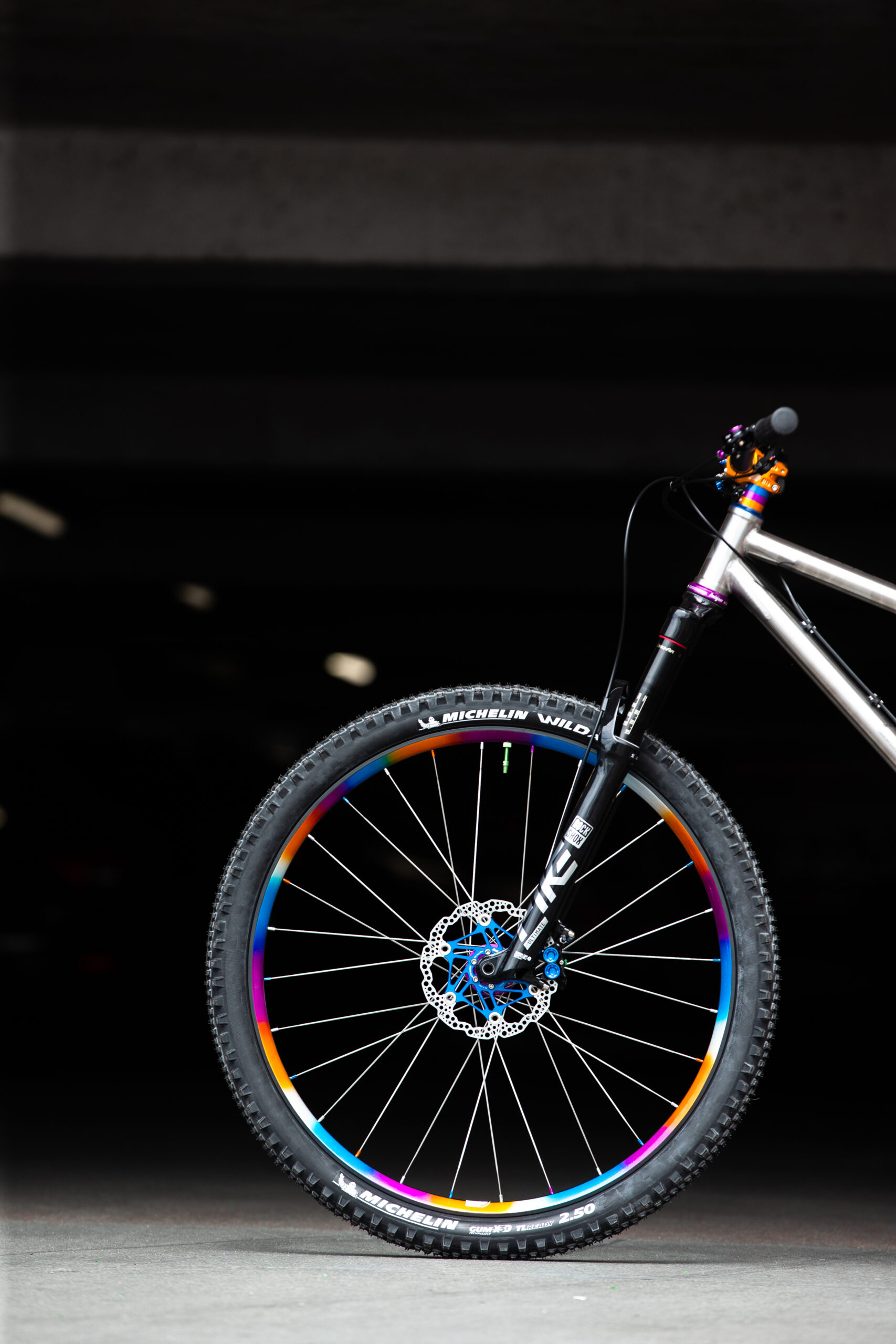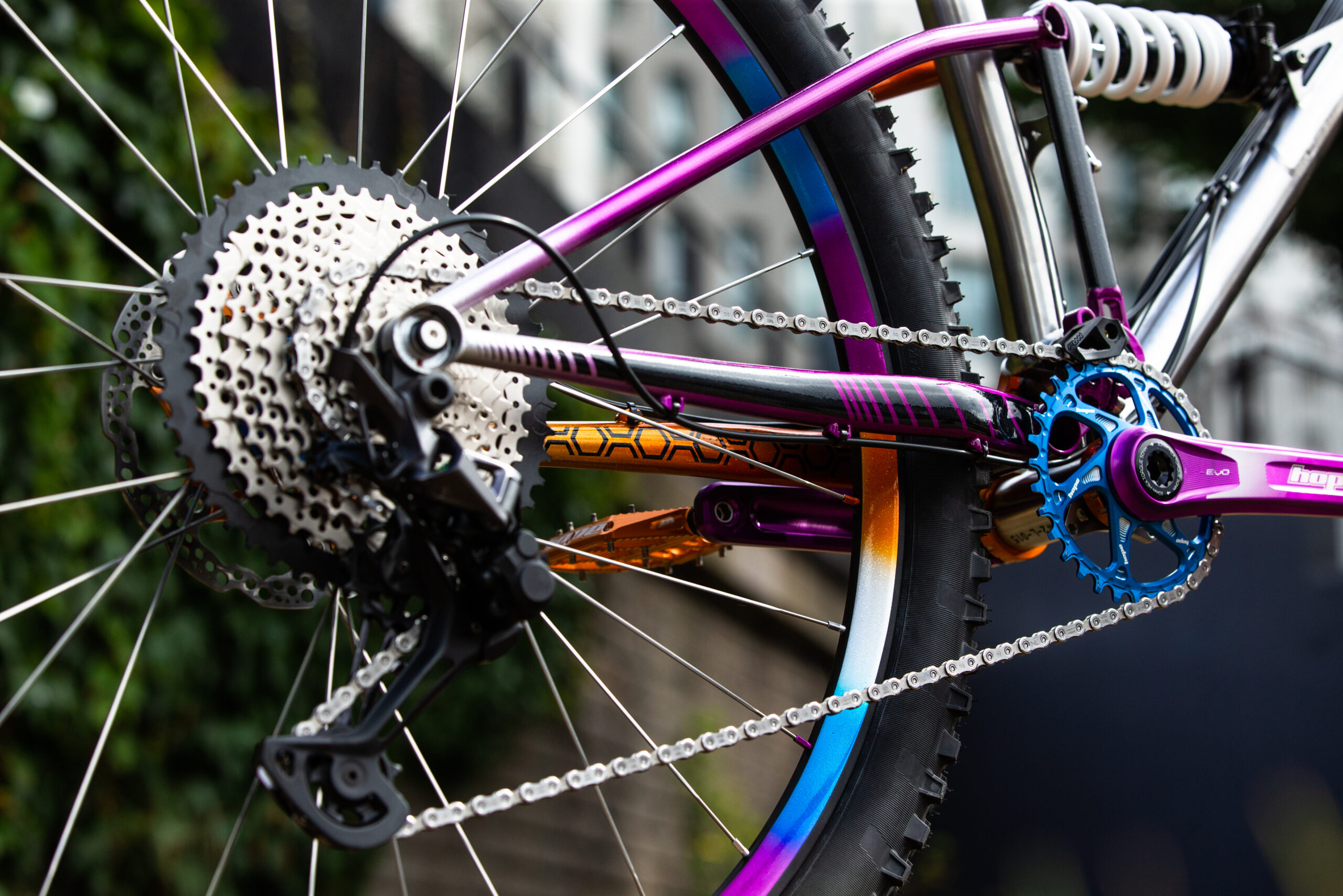 Next we enlisted the help of Bristol Bike Restorations for a custom paint job. We gave Josh free reign to use his own creative interpretation and he created a smooth fade between colours and some nice hex details to match the Hope components.