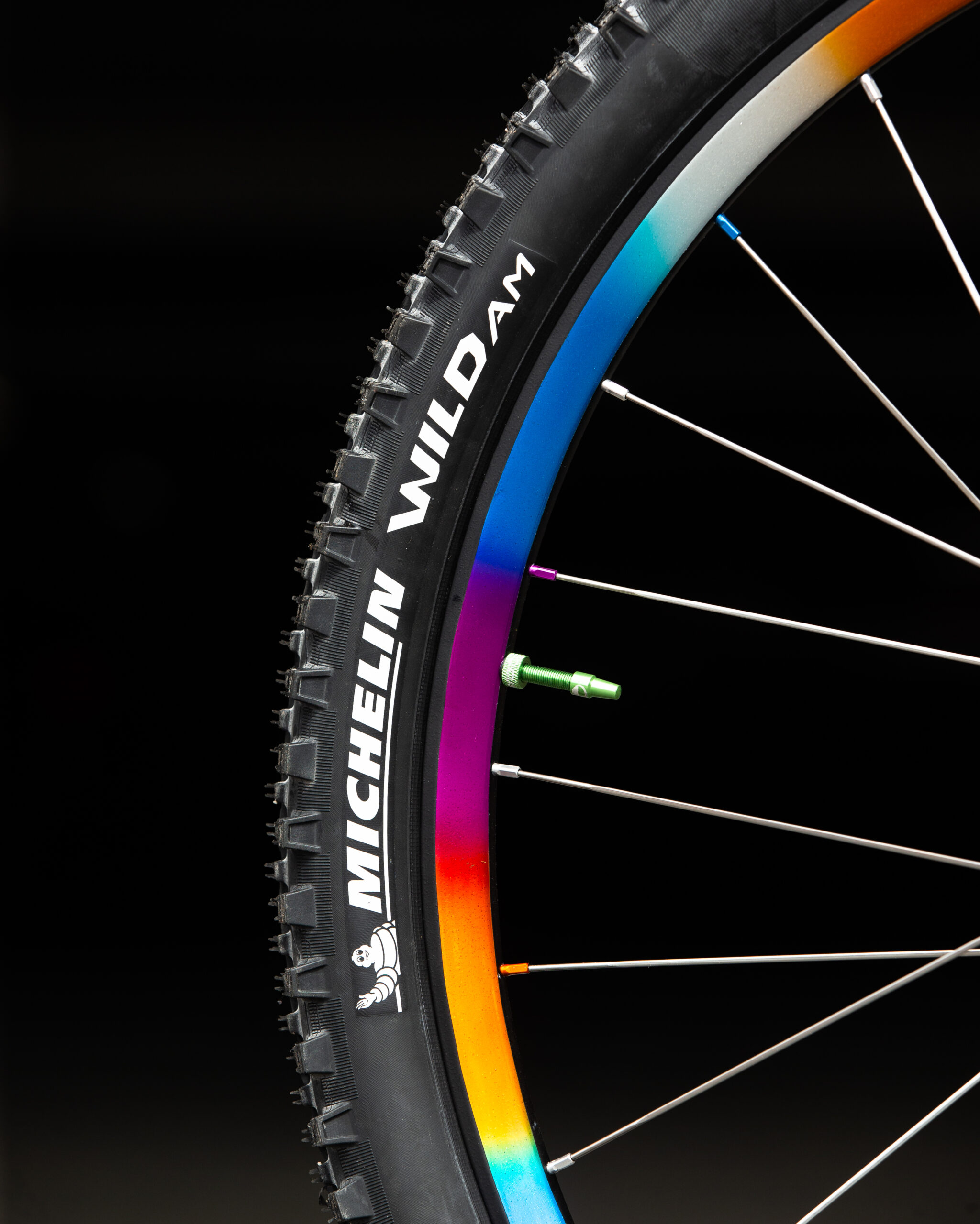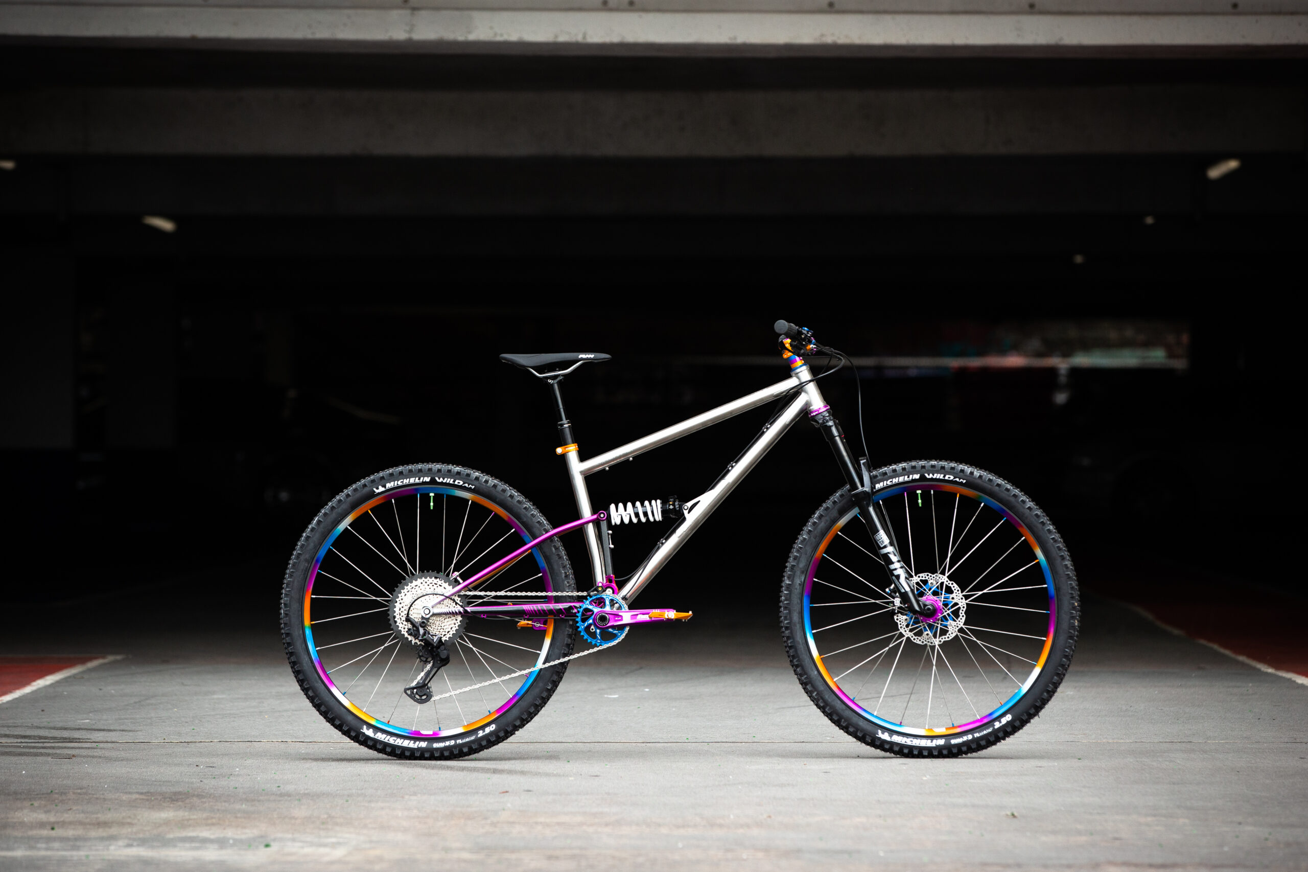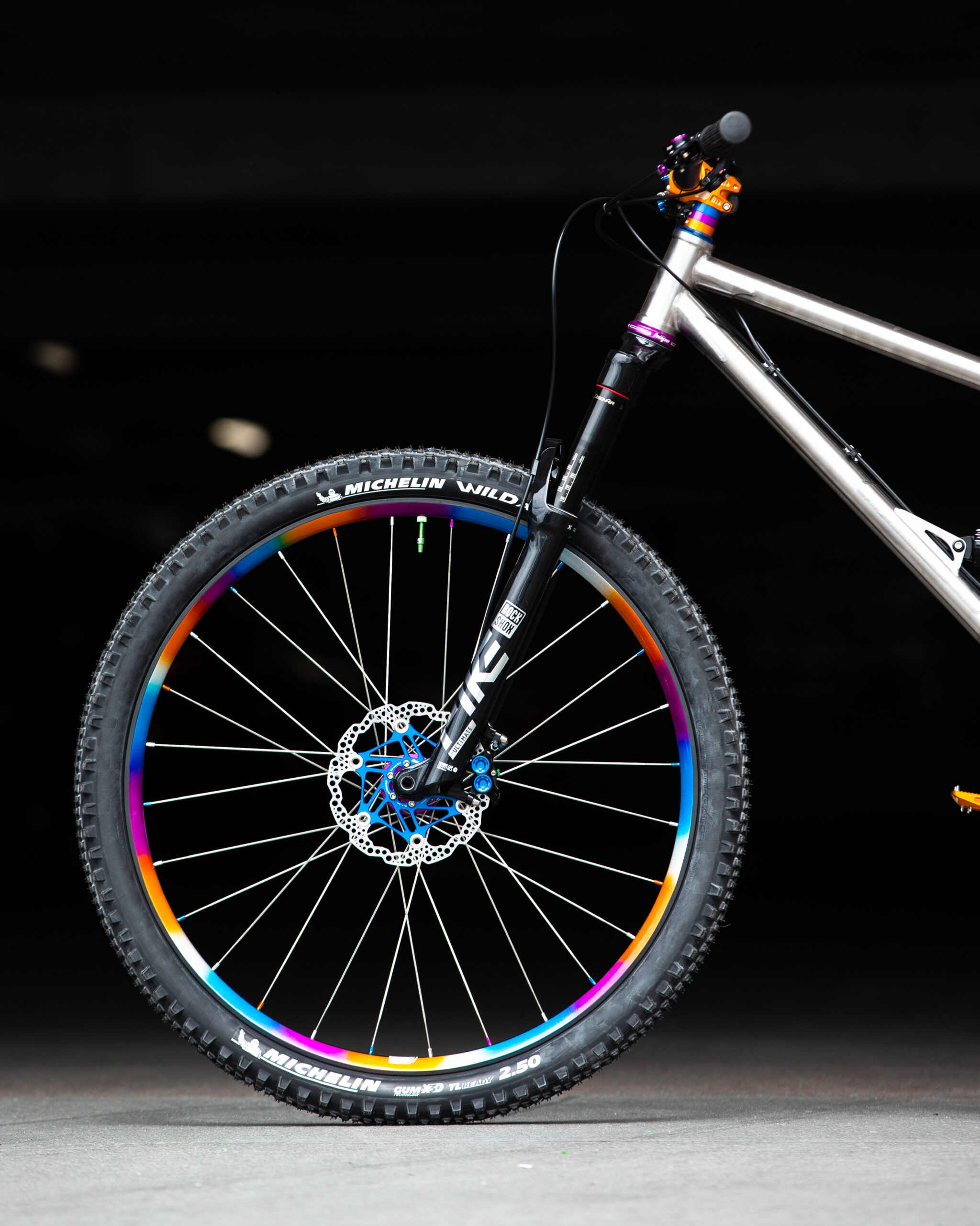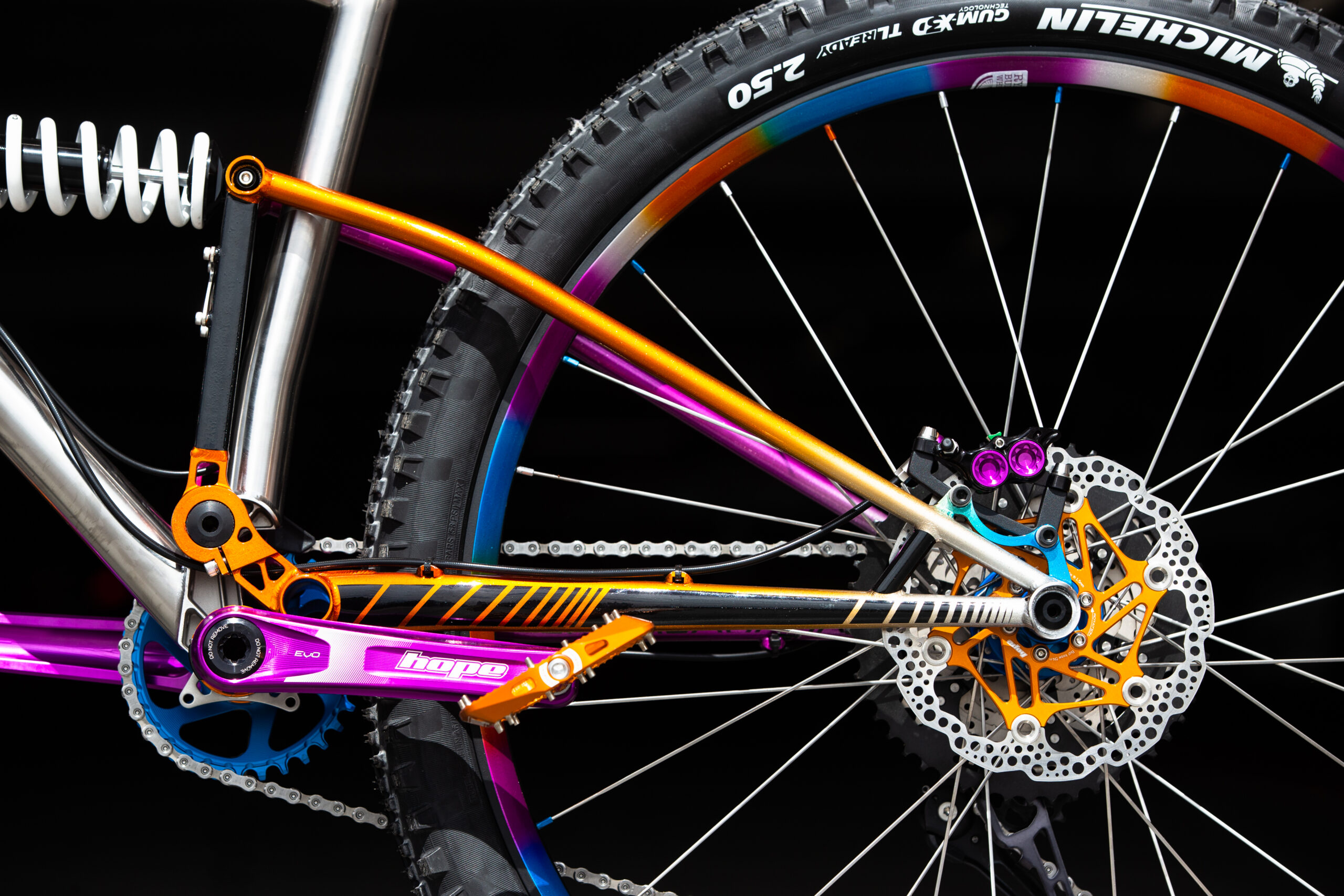 The age-old mountain biking truth ‘anodising equals eye-catching’ rings true on this one, and Hope supplied some absolutely stunning anodised parts for this. Choosing all 4 of their ano colours felt a little over the top even for this build, so we stuck with 3 – blue, orange and purple. We selected as many Hope parts as possible and tried to have every part next to a different coloured component.