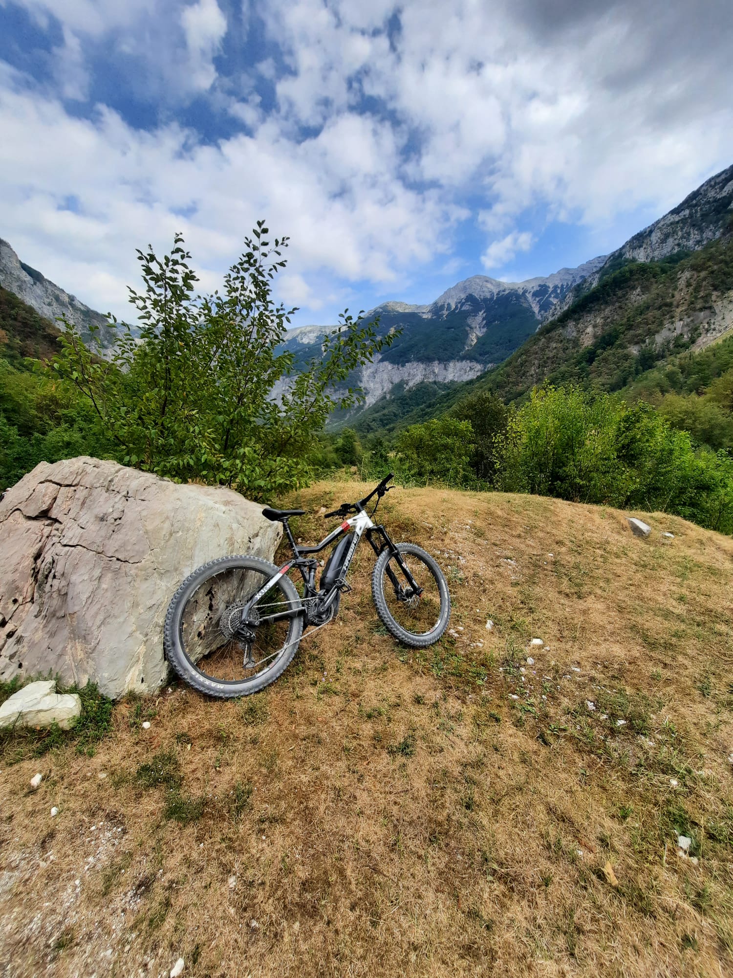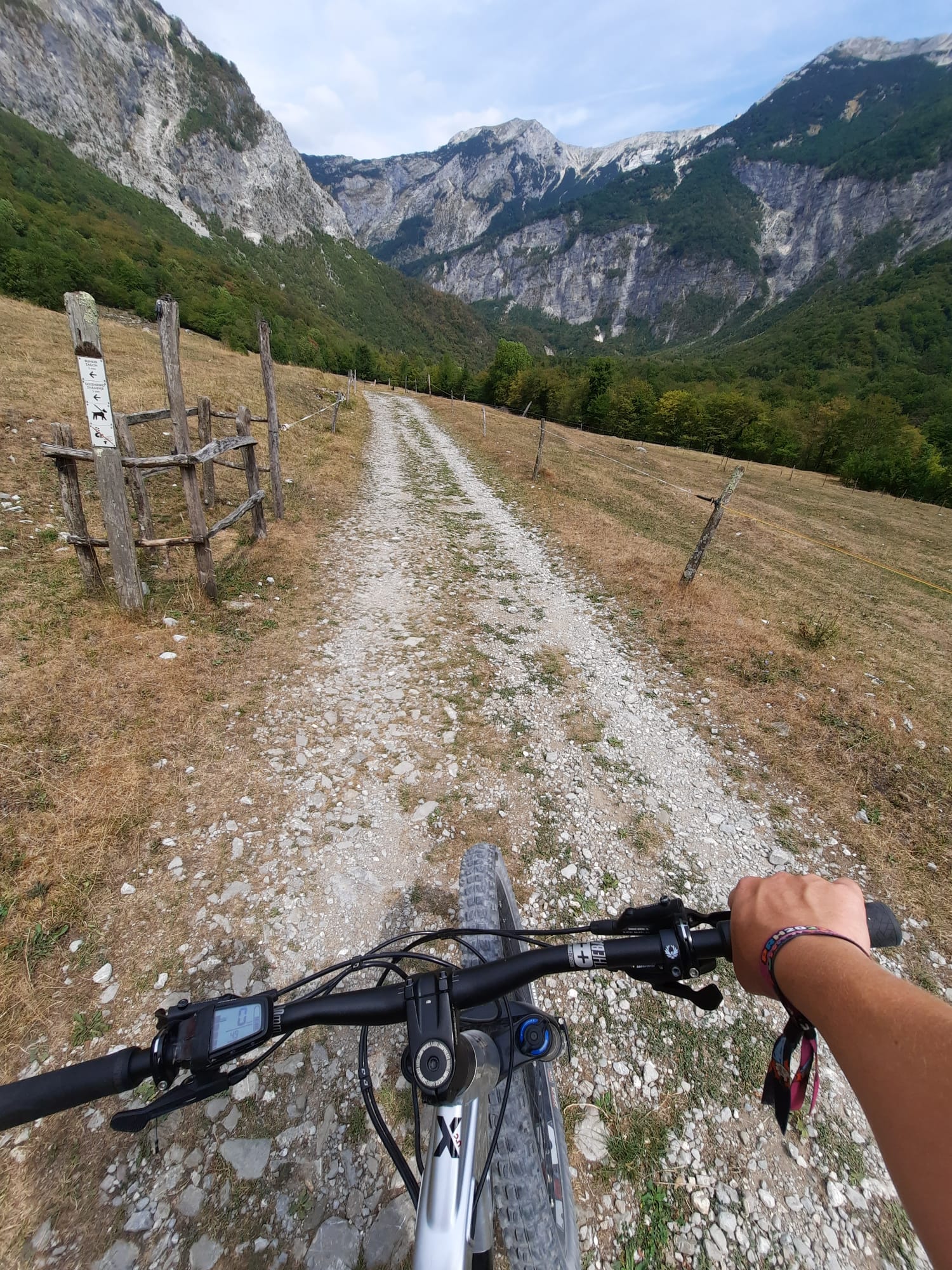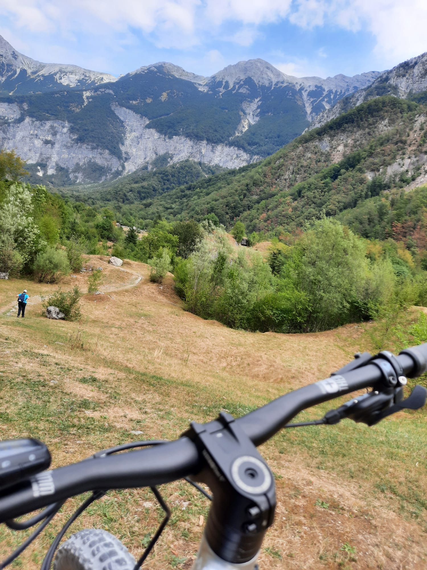 I settled on a full suspension Haibike from the awesomely helpful Azimut Center for the very reasonable price of €38 for a full day between 9am and 7pm. I followed my nose into the hills and soon came across a group of local riders stopped on their way back into town. They pointed me in the direction of a trail that I could see climb steeply up and around the side of a forebodingly big and jagged looking mountain. Through a combination of swoopy arm movements and repetition of the word ‘turns’ I was fairly confident they were sending me somewhere I’d enjoy.