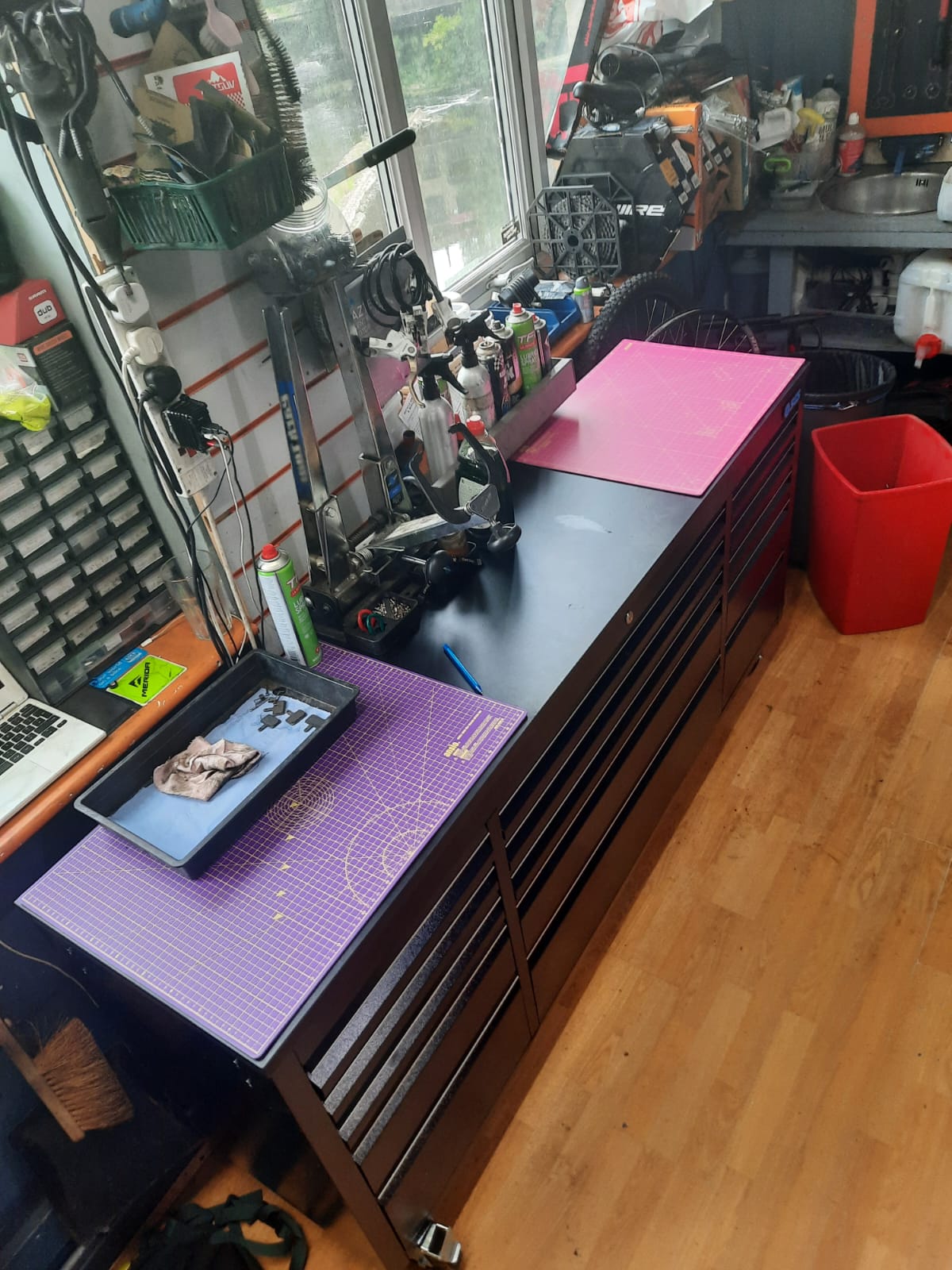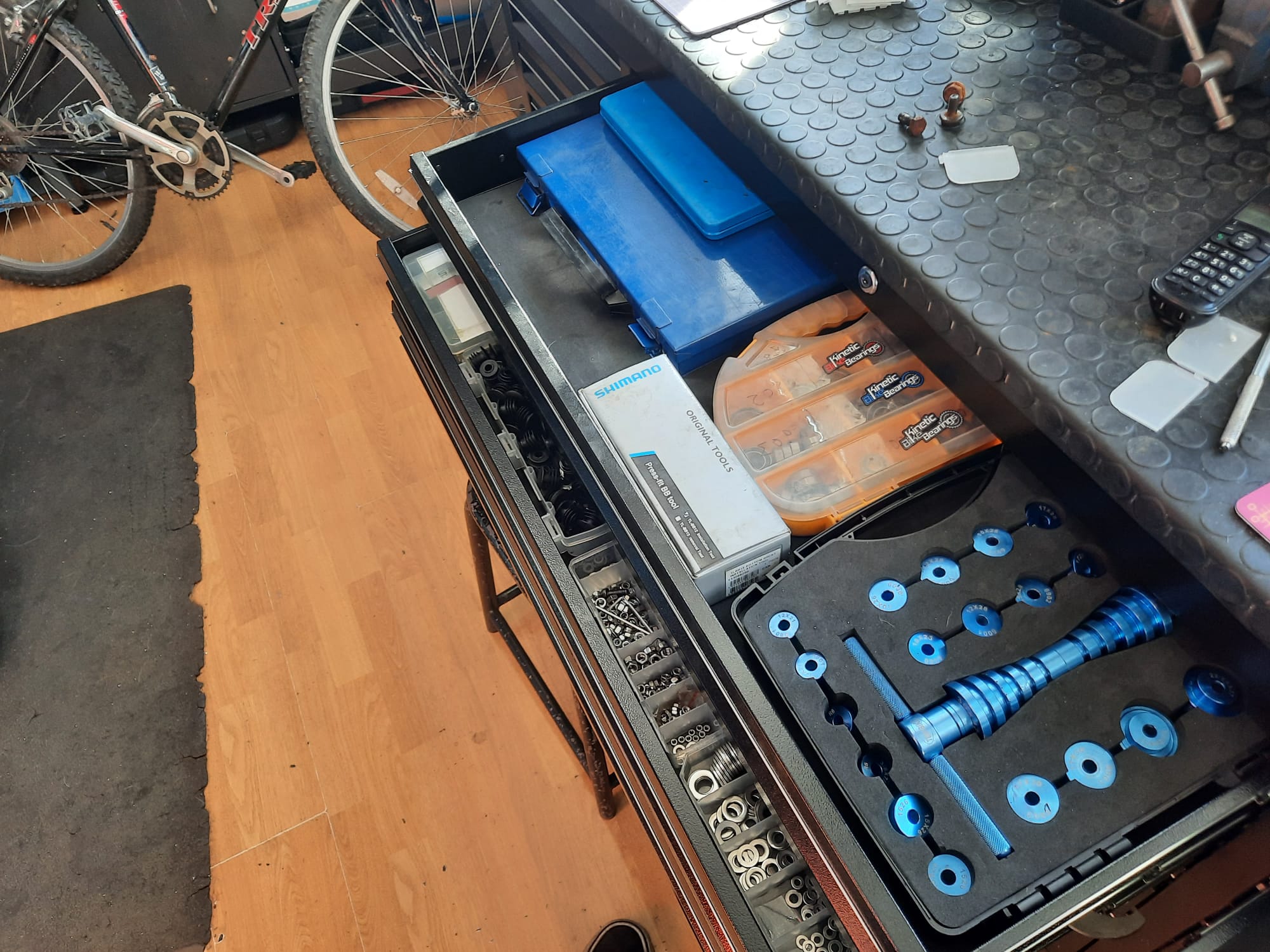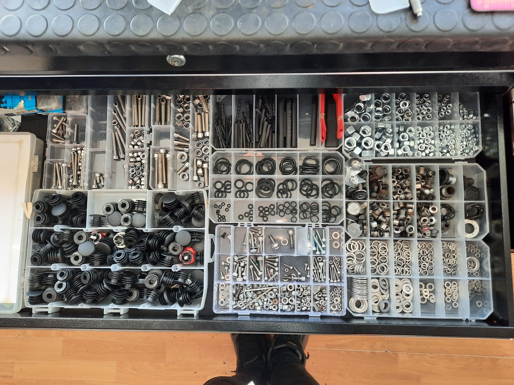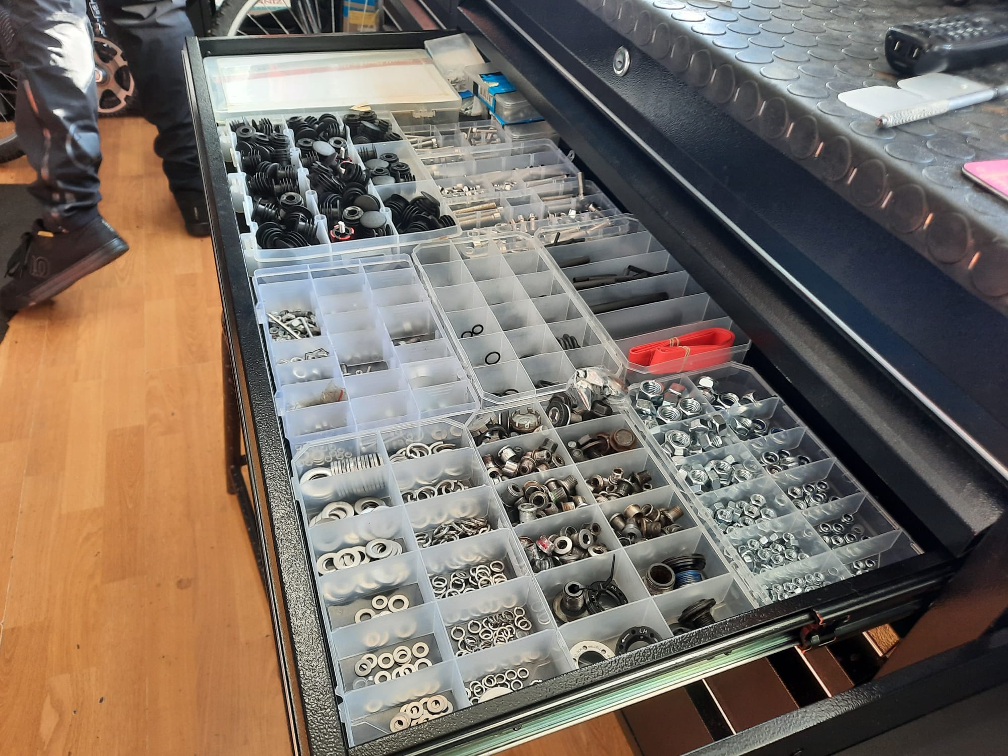 In fact this month I managed to convince the charity Directors to finally get rid of the final wooden bench and spring for a fancy new roll cab to help with my never ending storage space problems. I can’t tell you how much this thing makes my life easier! Previously I’d have to move the bike around in the stand so I can get behind it to pull a box full of boxes out of a cupboard from which I then have to select the right box, then remove the box find the part I want, then reverse the whole setup to put the box back in the cupboard. Now, if I need a bearing or a bolt or a washer or an O-ring or any number of things like that, I can just open a drawer and have them all laid out in front of me ready to go!