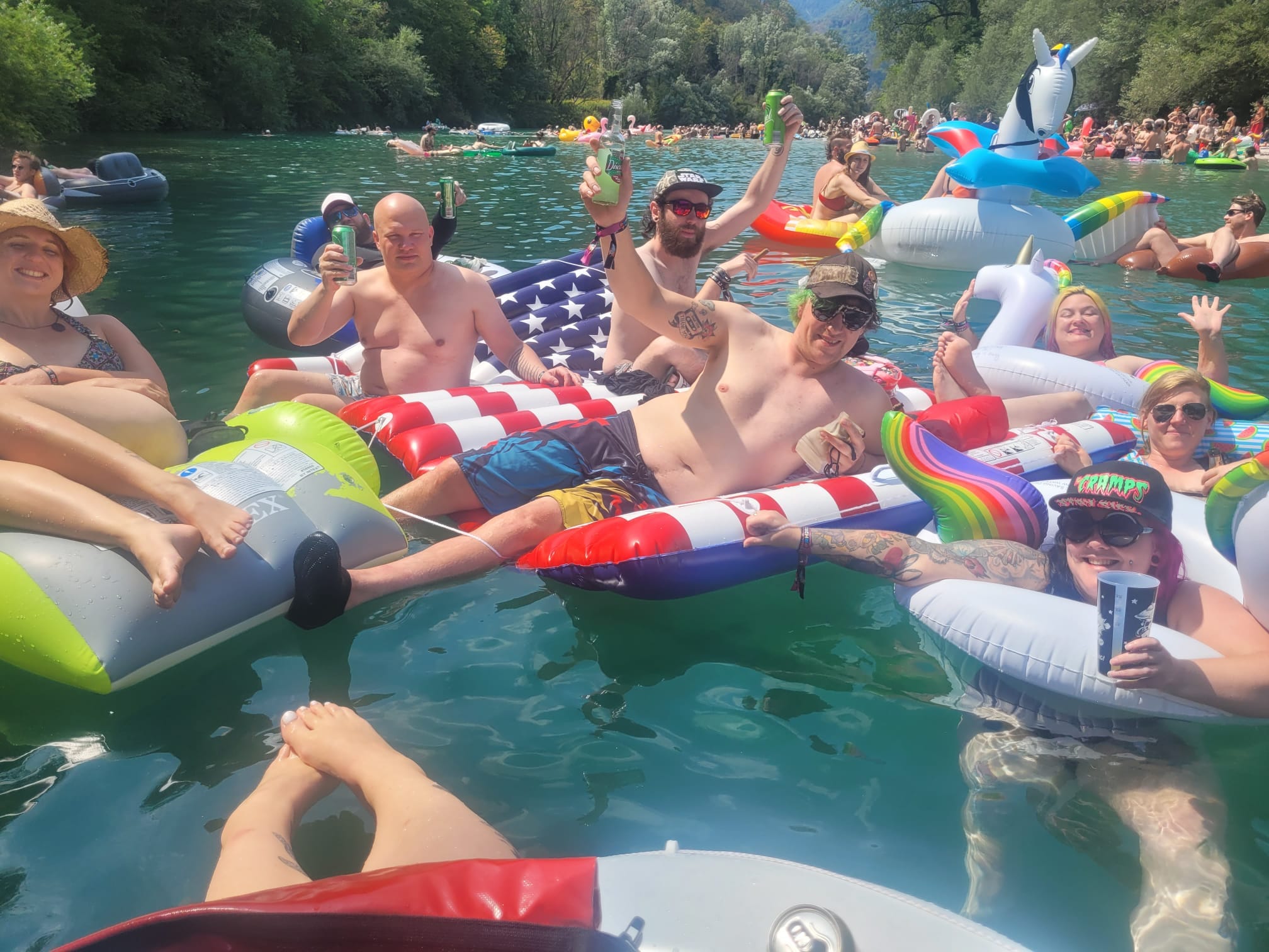 Basically every year 6000 punkers from all over the world descend on the tiny Slovenian town of Tolmin nestled in the Julian Alps to spend a week camping in one of the most beautiful areas of the world, spending the days floating down the crystal clear Soća river on inflatables shaped like just about anything you can imagine, and the nights sweating away watching bands made up of middle age men singing songs they wrote as teenagers!