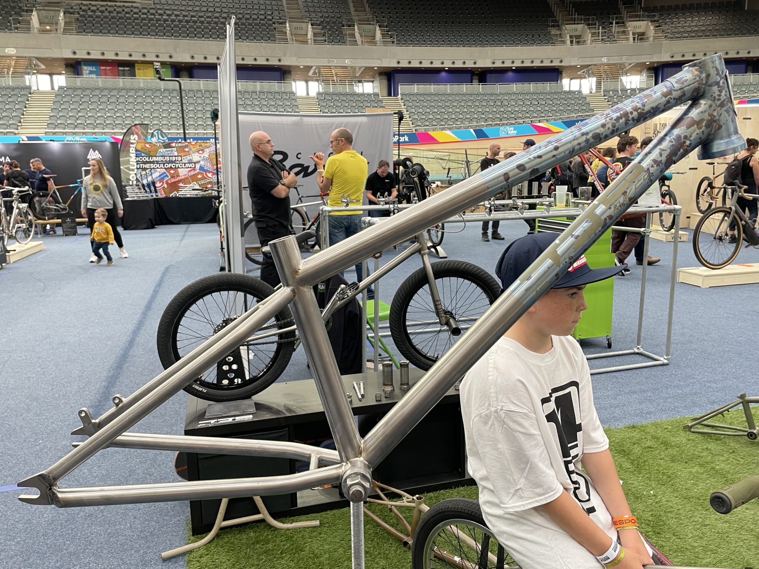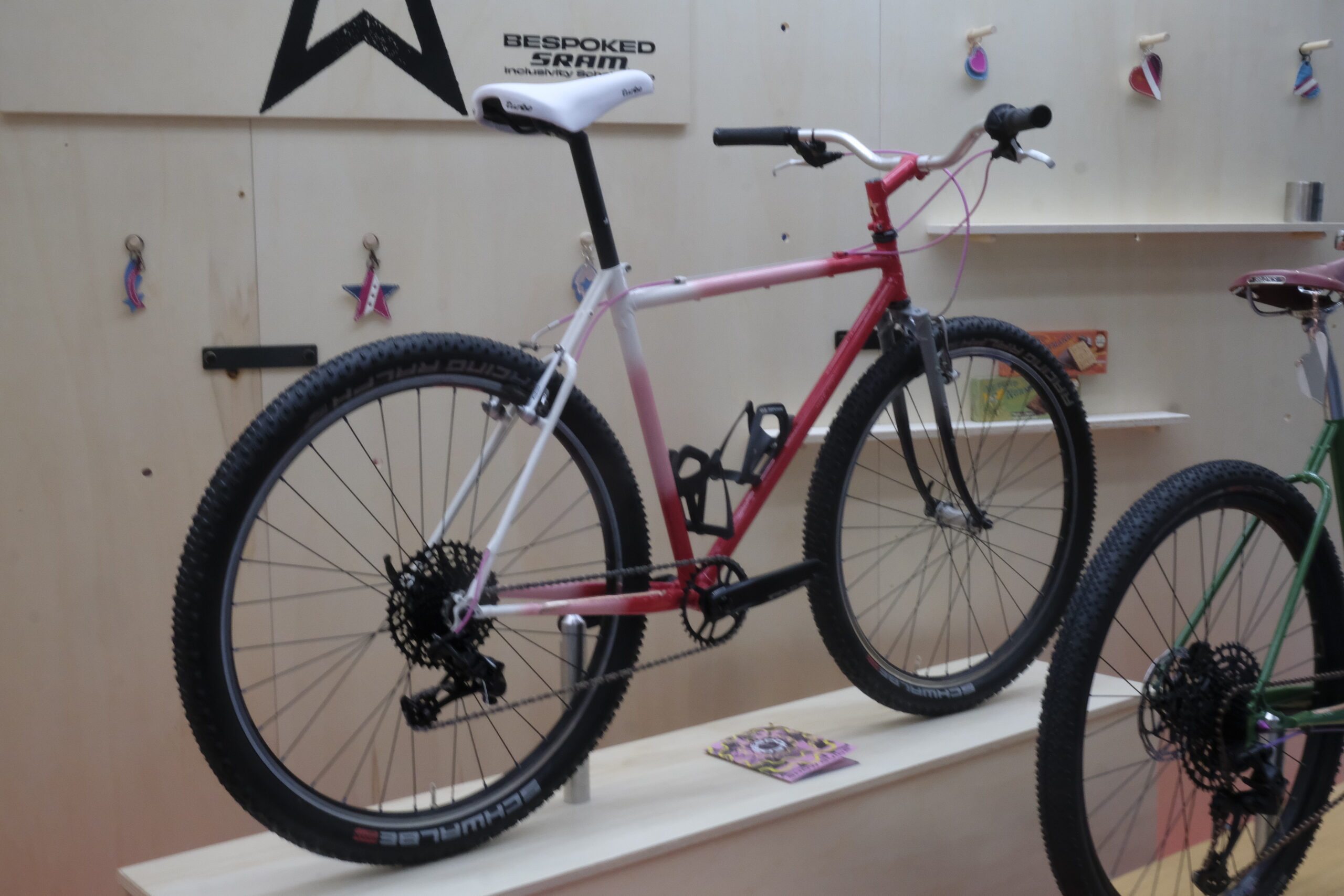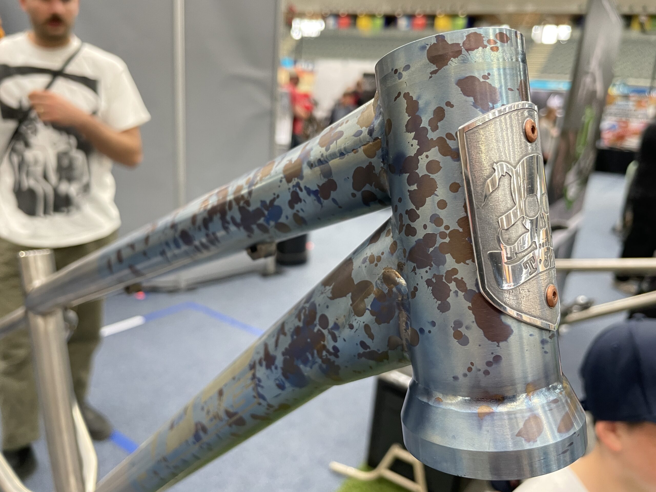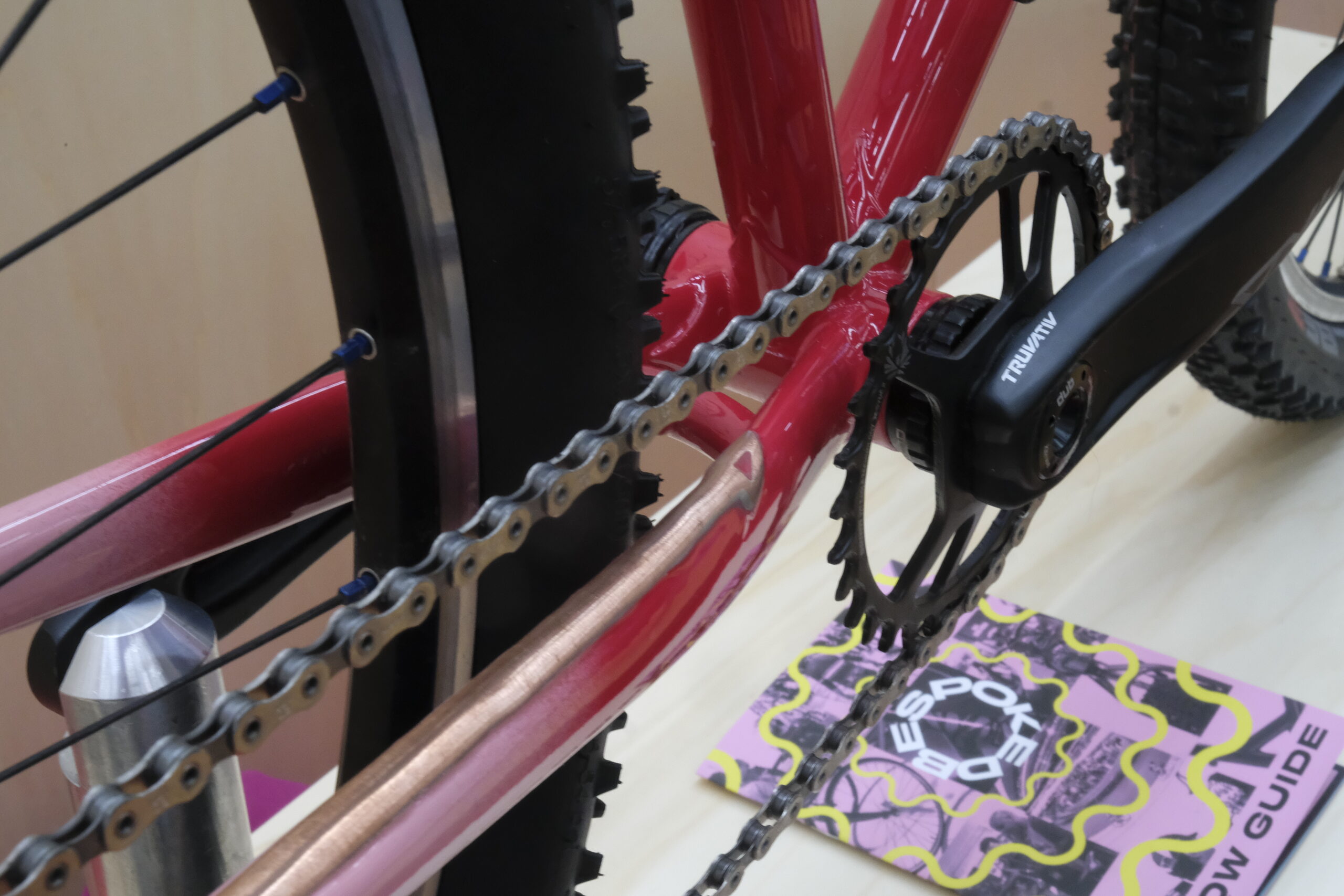 Sarah was at the show thanks to the SRAM inclusivity scholarship, that supports builders from under represented groups to attend the show. She’d built this very neat steel hardtail, then added her pick of SRAM components. Quinntessentials Customs Workshop had given it this gorgeous paint job, which was one of two Lucienne Day designed fabric patterns that they’d transposed onto bikes for the show. I especially liked the colour dot selvedge feature on the seat tube. But, skilled as the paint application was, and neat as the build of the bike was, I felt like I’ve seen nice paint and neat building before, so my judgey eye moved on…