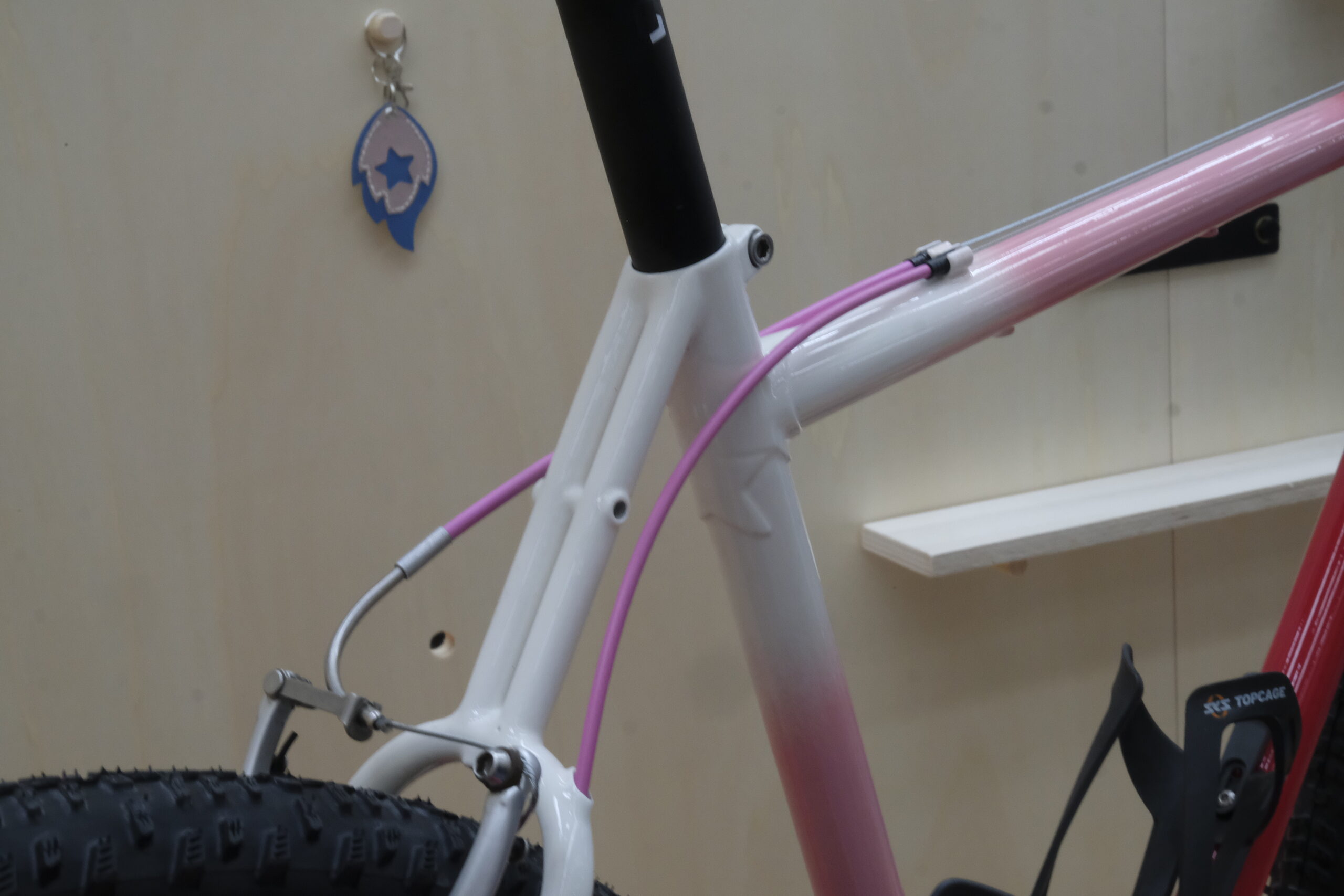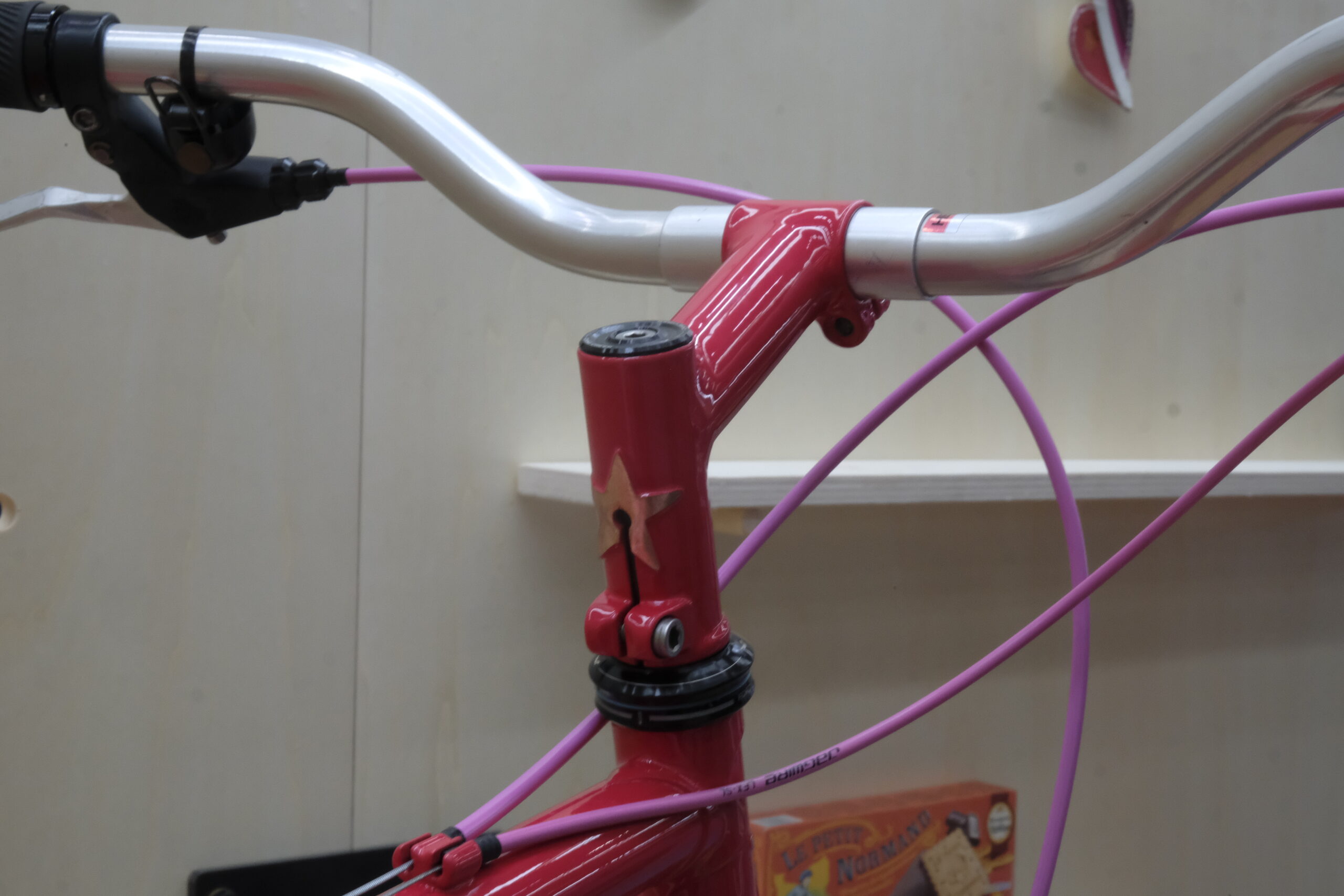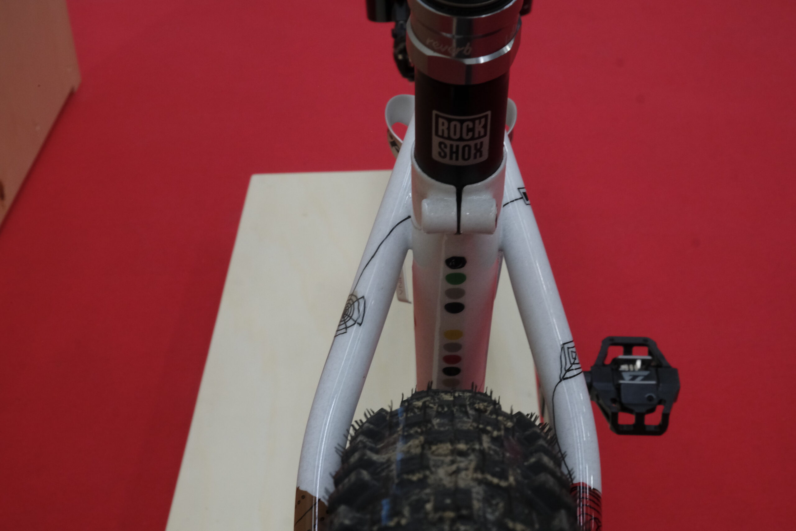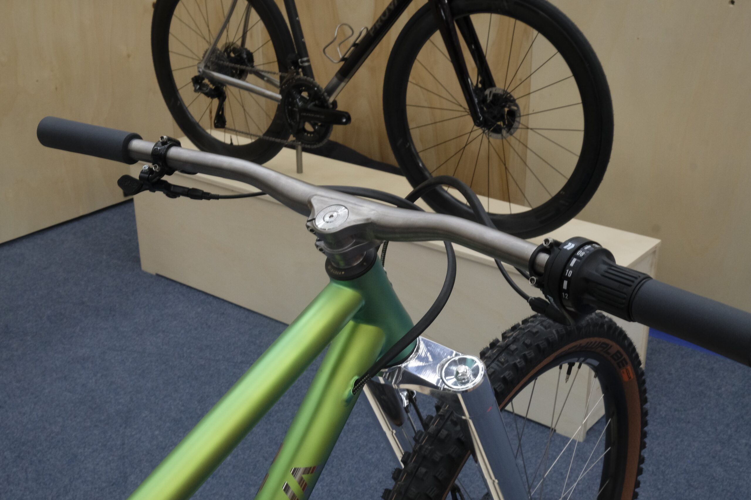 You’d definitely notice the handlebars – made specially by Mark to give himself the shortest stem length possible at 25mm. He tig welded the main handlebar to a 3D printed mini stem – he wouldn’t sell it to anyone at the show, despite enquiries, so we guess he likes it!