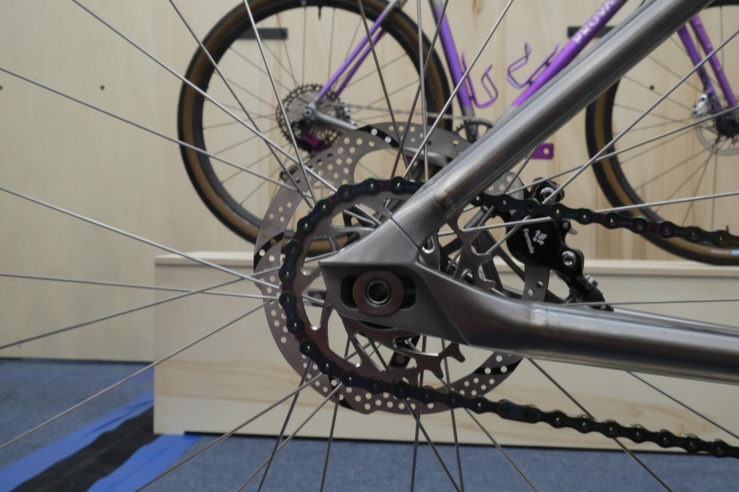 You might also miss the fact that the bottle bosses are attached externally to the downtube – keeping the inside of the tube completely clear for as much seat post insertion as you could ever want. You’d probably notice the dropouts, also additive manufactured from titanium, and designed to look as close to a normal drop out as possible while still allowing for a belt drive and chainstay adjustment for tensioning a chain or belt.