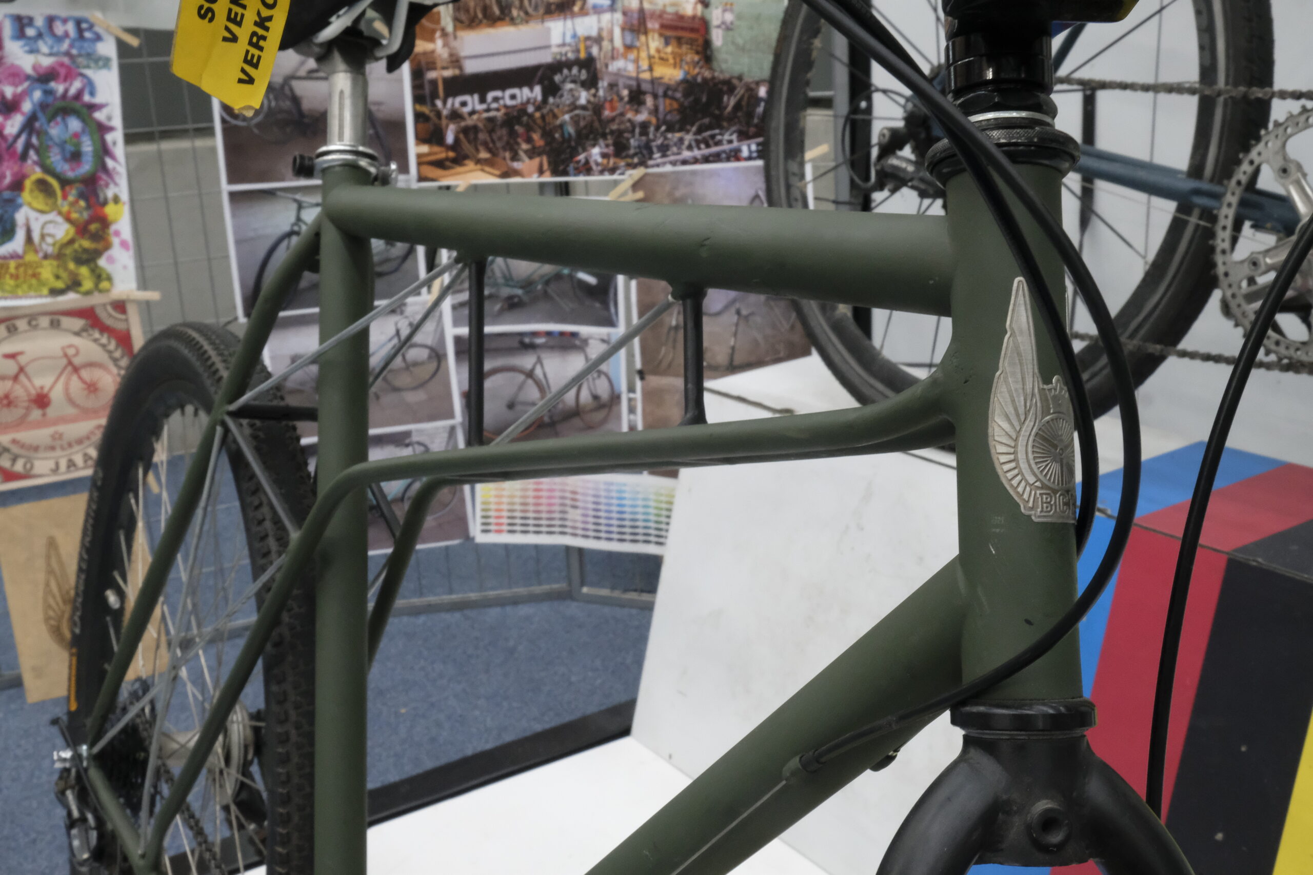 This bike by BCB was built to go bikepacking, so has room for a frame bag. Like all of BCB’s bikes, it’s made by recycling old frames. The skeleton of this one is an old Peugot, with some other pieces added to create the truss supports for strength off road. The moto/BMX bars were added because they couldn’t source anything else in the Great Pandemic Parts Shortage, but they actually suit the look of the bike well. I love the the chop-shop recycling approach, I’d totally have this as my town or pub bike, but I don’t think it would be my first choice for a big mountain trip – look at those gears!