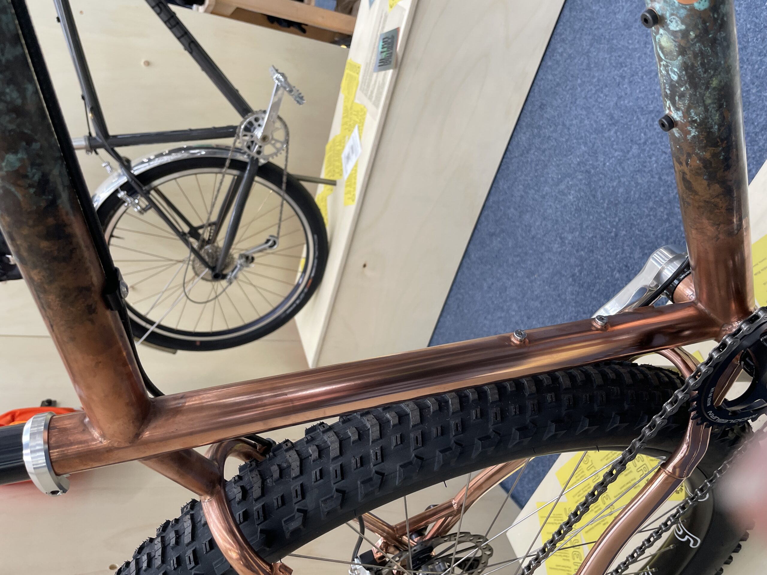 There were three Stayer OMGs on display as part of a prize draw to support the Ultra Distance Scholarship, which helps riders from under represented groups get to the start line of ultra distance events (it’s not everyone who can afford to put together a bike and take a few weeks off work to ride a few thousand miles). This particular one had been plated in copper, then partially aged with lemon juice, creating a verdigris finish that I have never seen before on a bike. It reminded me a lot of a Barbara Hepworth sculpture, with the deliberately contrasting finish across the surface of the copper. It had been built up in a rigid bike packing style, with a dropper post for practicality and Middleburn Cranks and Paul Components brakes for added lust. If I could have pushed one bike out of the show and taken it home, it would have been this one, earning it a place on my official Runners Up list. I’ve entered the prize draw and live in hope…