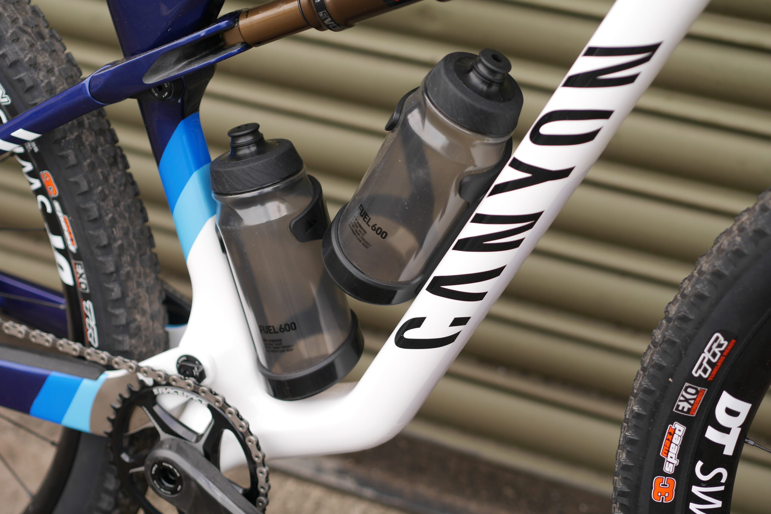 There is space for two bottle cages which are supplied. Cool. Here’s a secret, I don’t actually like bottles for XC racing since I discovered these fancy hydration bladder things. How fashions change. Either way I can appreciate the fitting of two bottles inside the front triangle (no sniggering Amanda) of a size small frame is great packaging. The side entry cages and clear bottles are also provided.