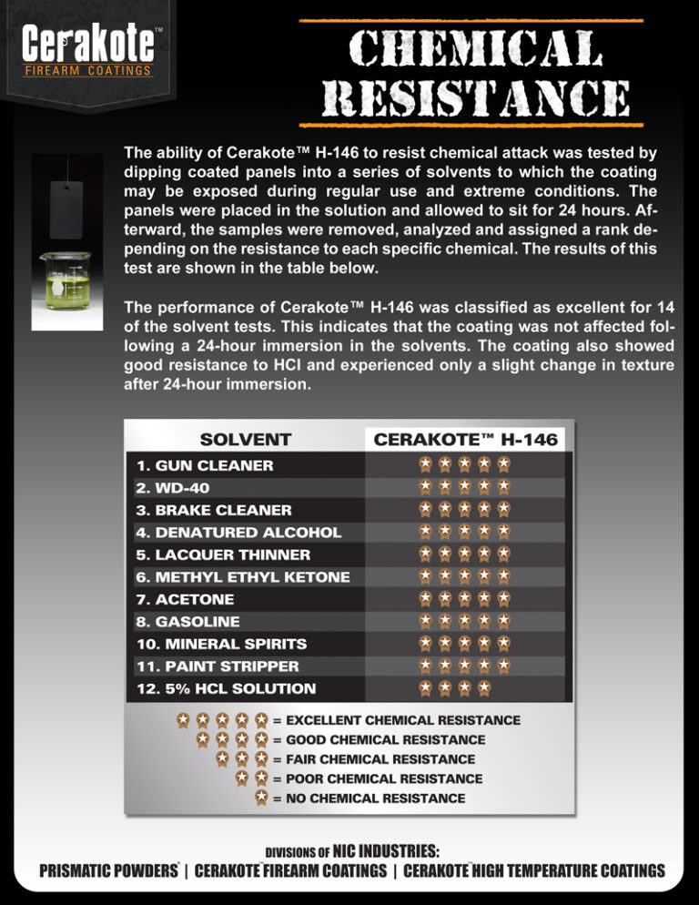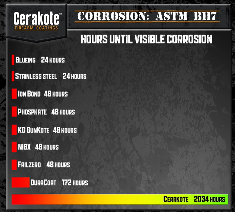 In a corrosion test Cerakoted stainless steel outlasted plain stainless steel in a salt chamber by over 2,000 hours (24 hours versus 2034 hours).
