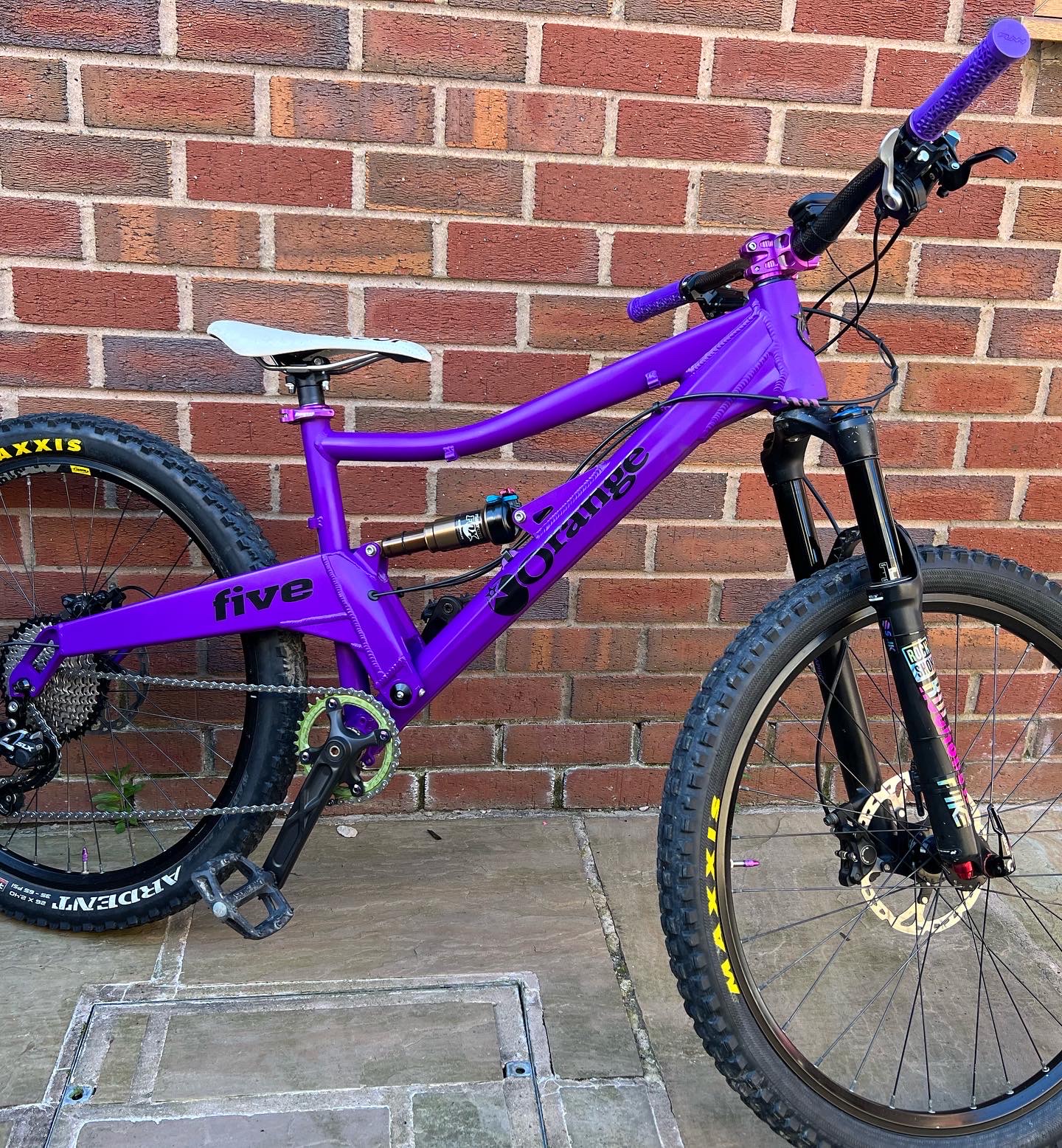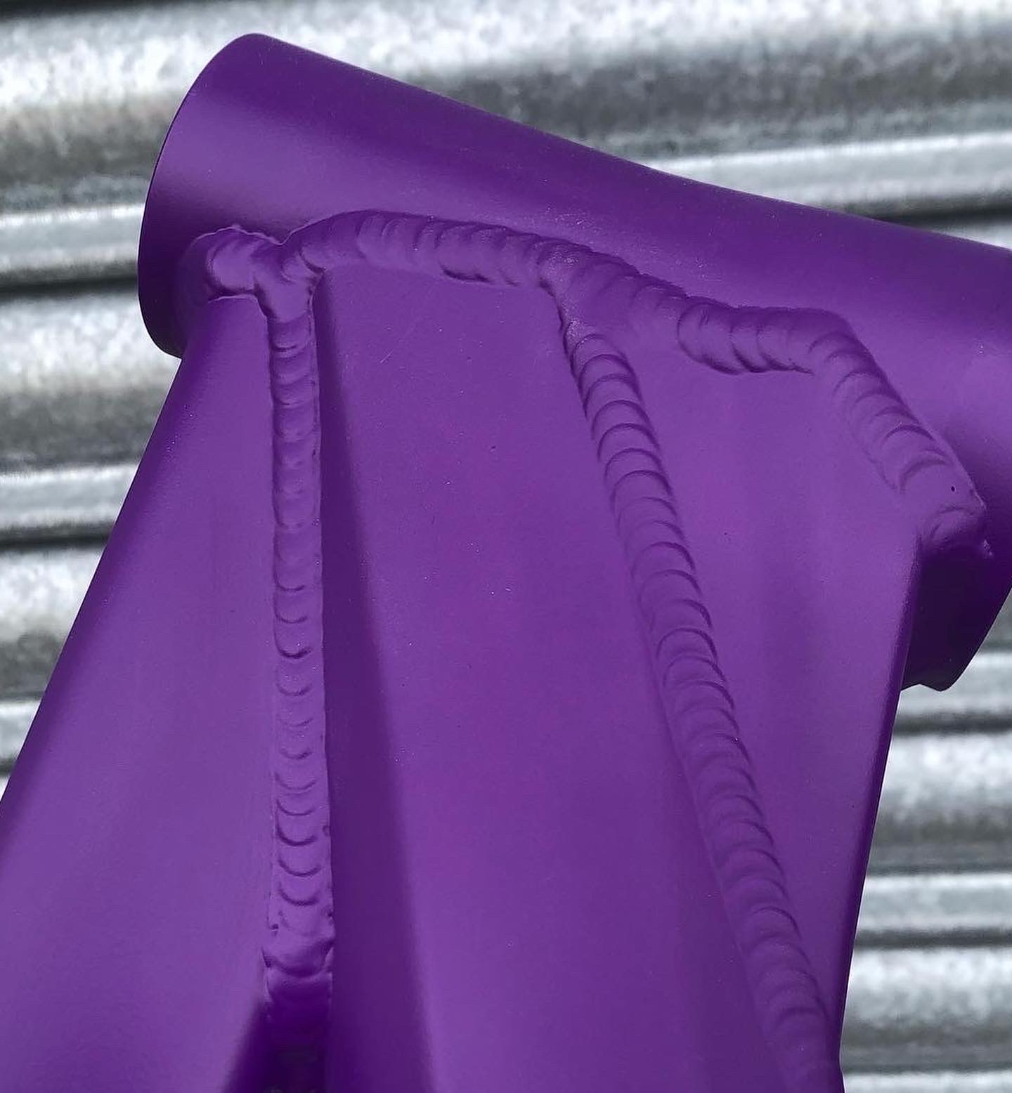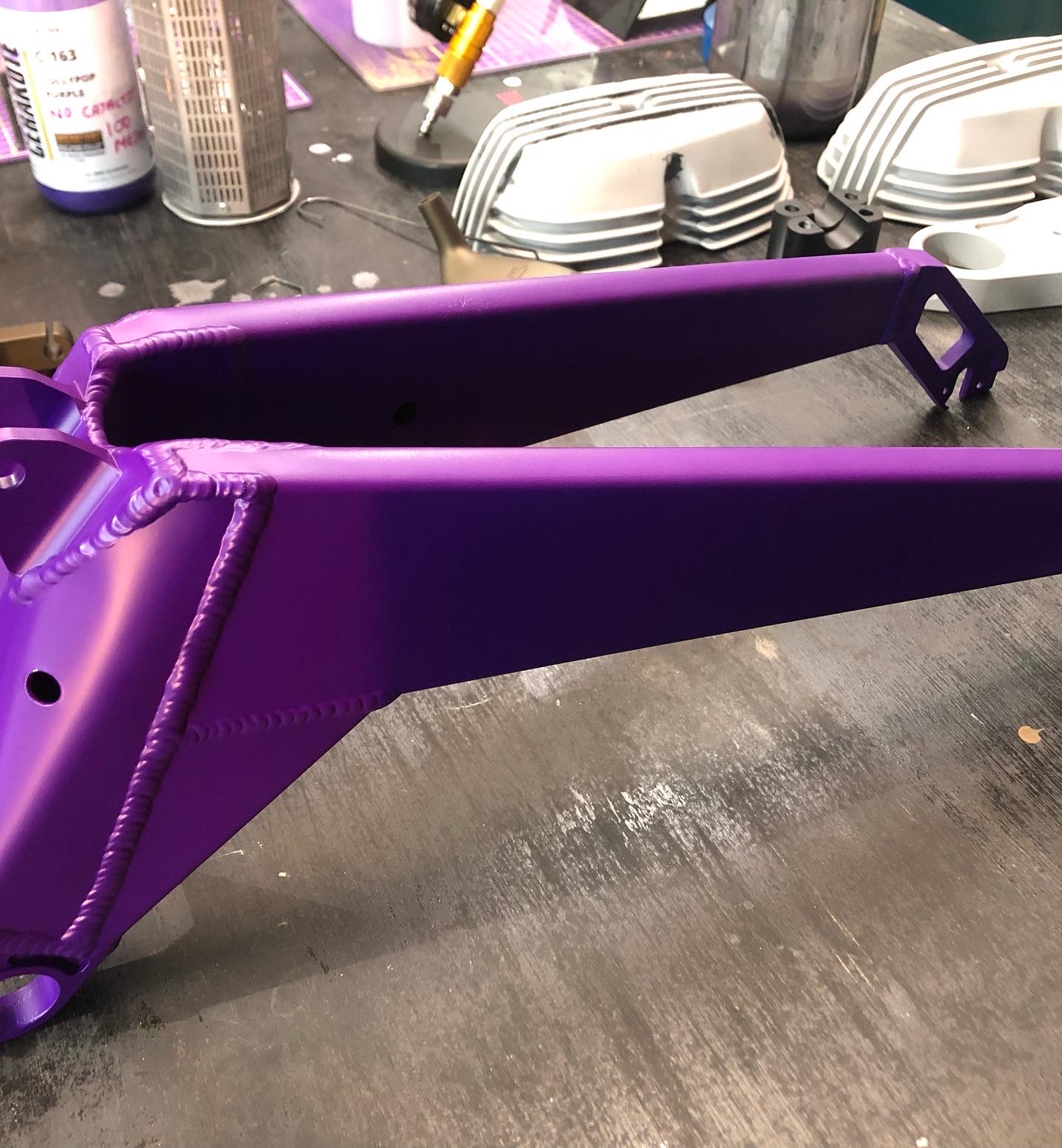 This frame was originally pink, the customer fancied a change and picked the Lollipop purple with black logos (logos are decals added by the customer) We turned this around within two days as the customer had a race meeting they wanted to attend on the newly finished bike.