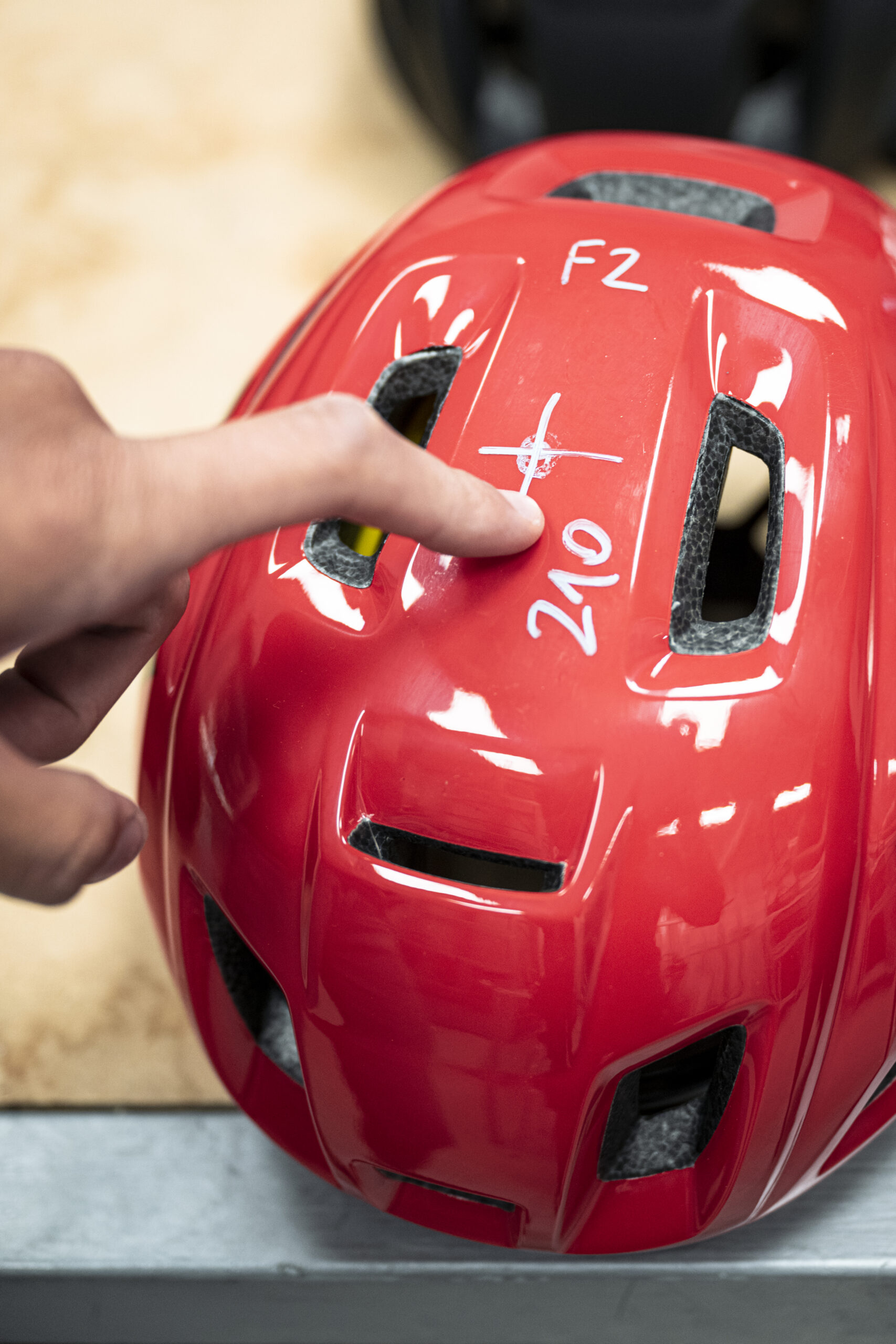 When product samples are received they are passed to the crash test engineers. Each testing run will have 50–60 impacts recorded in various conditions. UV is used to mimic material ageing; a freezer and an oven are used to vary the temperature. Samples are annotated with the results, which MET believes to be a really important part of the process. Holding a physical result and seeing the impact in actual form and not just as a result on a graph helps them understand about materials, impacts and why they’re doing what they do.