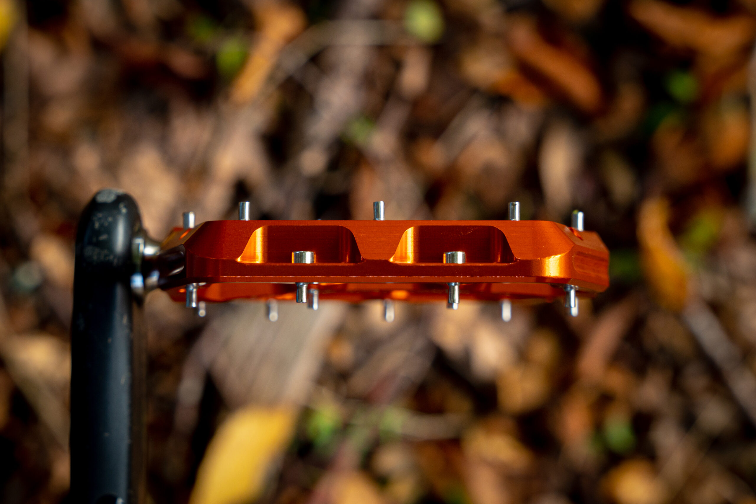 These dual-concave profile pedals, paired with 11 grip pins on each side locks in your foot, while a large tapered leading edge deflects pedal strikes.