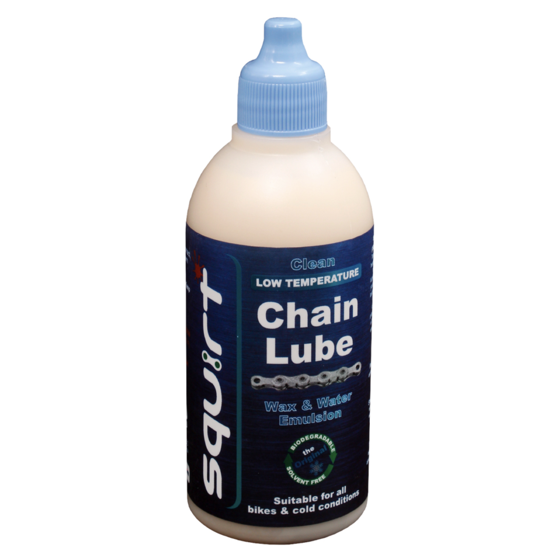 “Squirt Low-Temp Chain Lube is a low temperature lube for use in very cold conditions. Lube that thickens or hardens in cold conditions causes more drag in the drive train, resulting in less efficient usage of power. Squirt Low Temp Lube has a modified congealing point, allowing it to lube optimally in these temperatures, keeping your chain quiet and clean, with long lasting durability.”