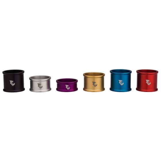 “Wolf Tooth’s Precision Headset Spacer Pack contains 5 stylish headset spacers to suit 1 1/8″ top (straight 1 1/8″ or 1 1/2″ to 1 1/8″ taper) steerer tubes. Manufactured from 6061-T6 aluminium in Minneapolis, MN USA, the headset spacers mate perfectly with Wolf Tooth’s top caps and allow you to get your stem exactly where you need it, while allowing you add a splash of colour to your bike at the same time!”