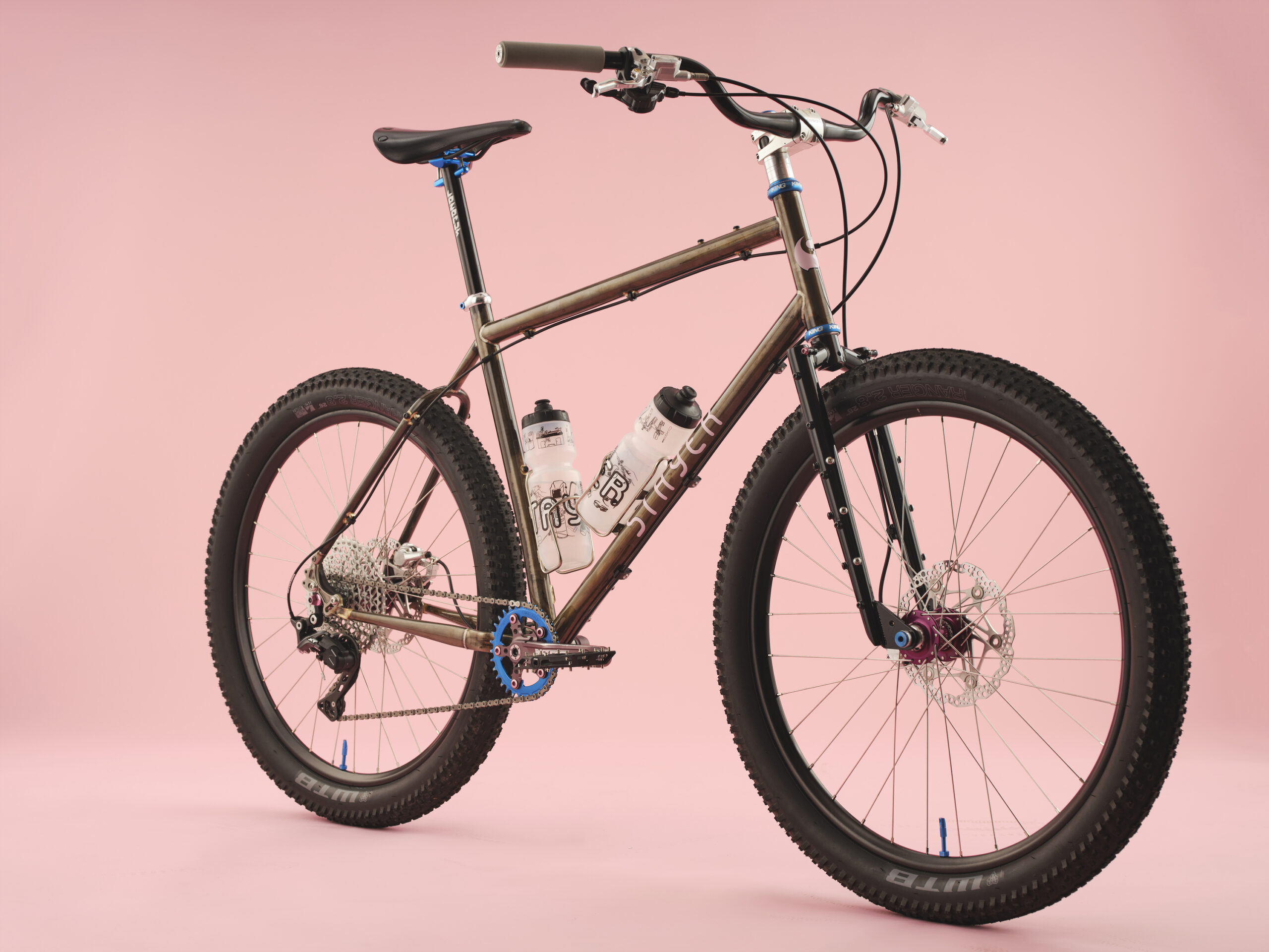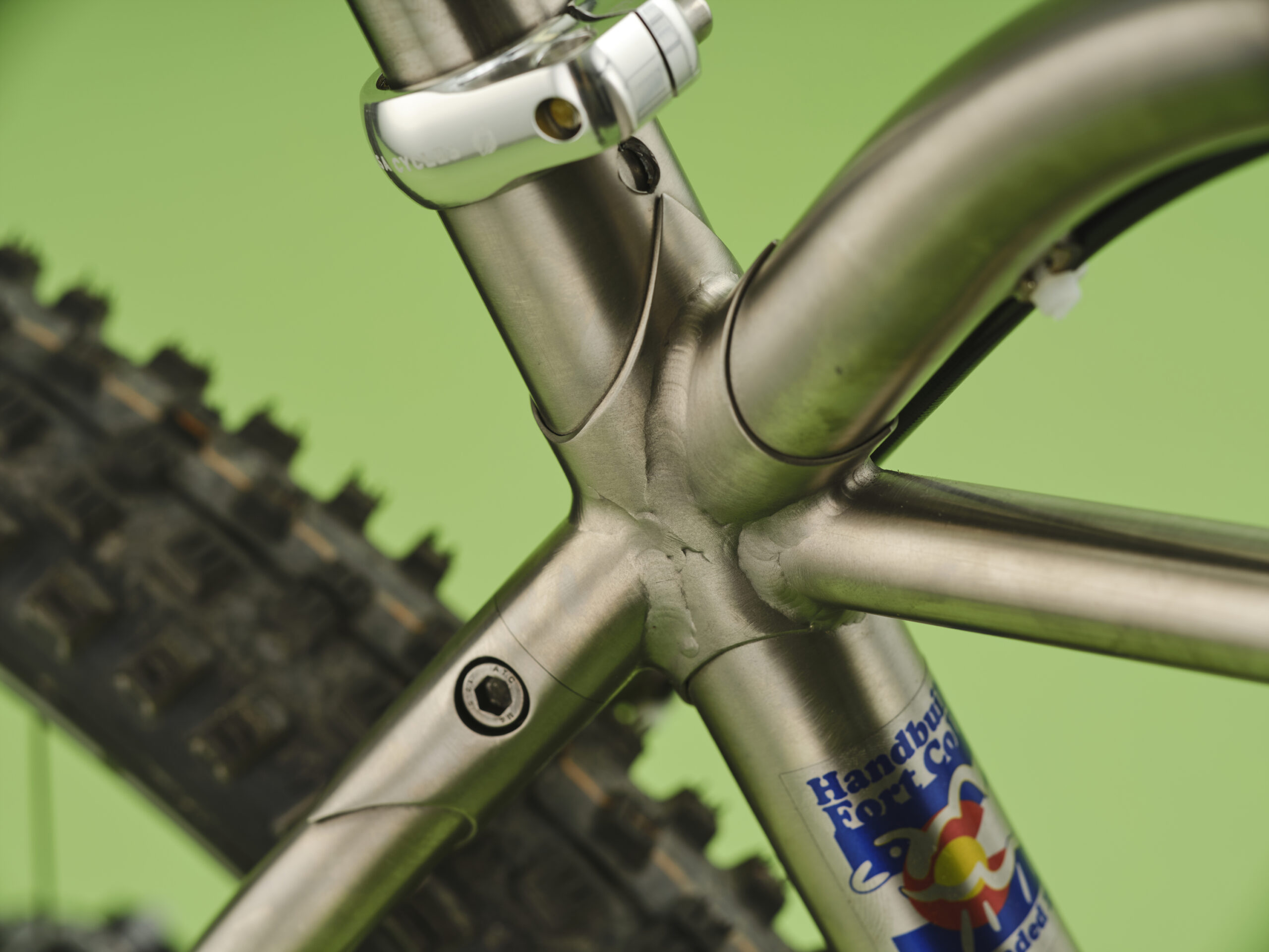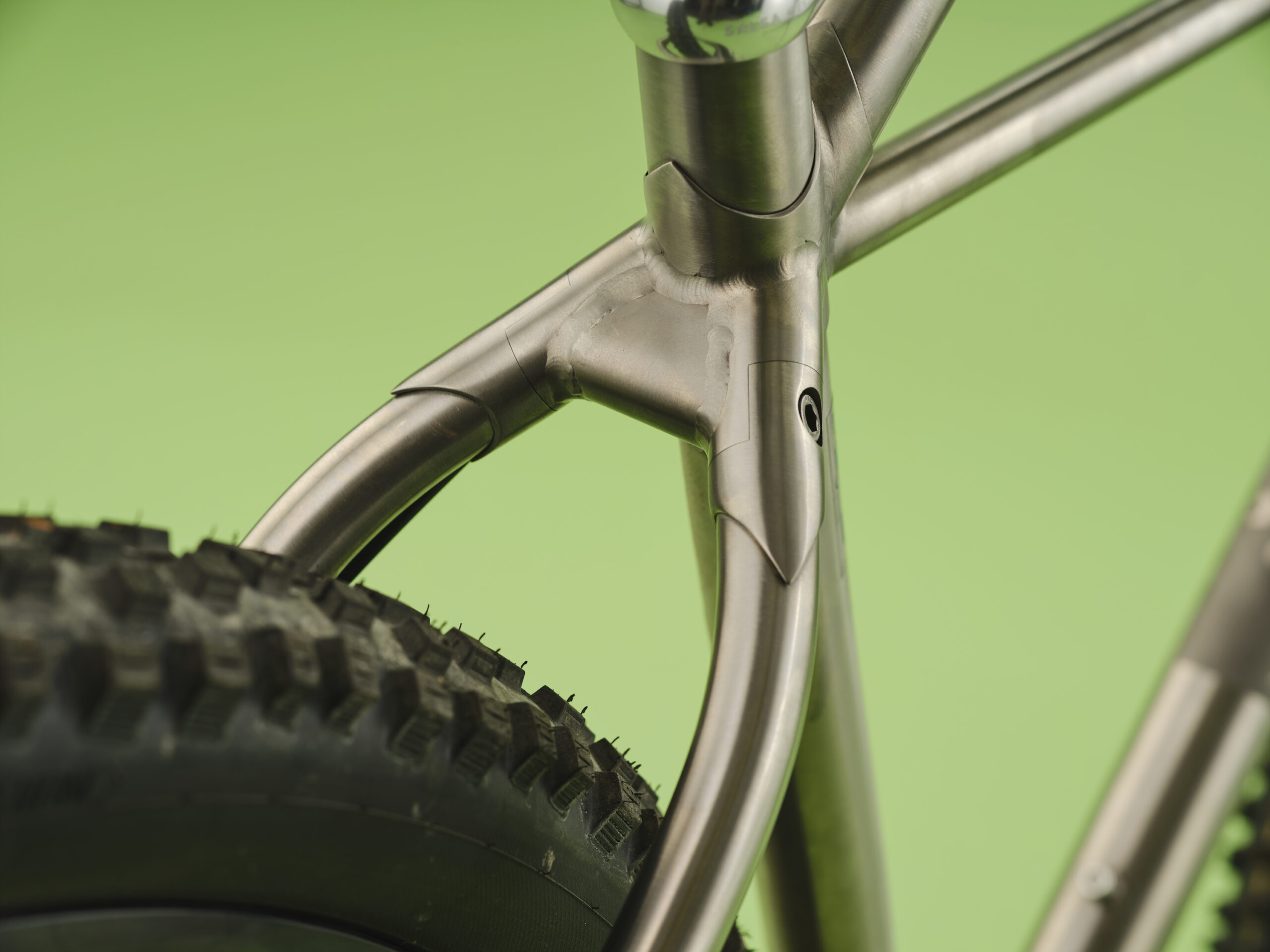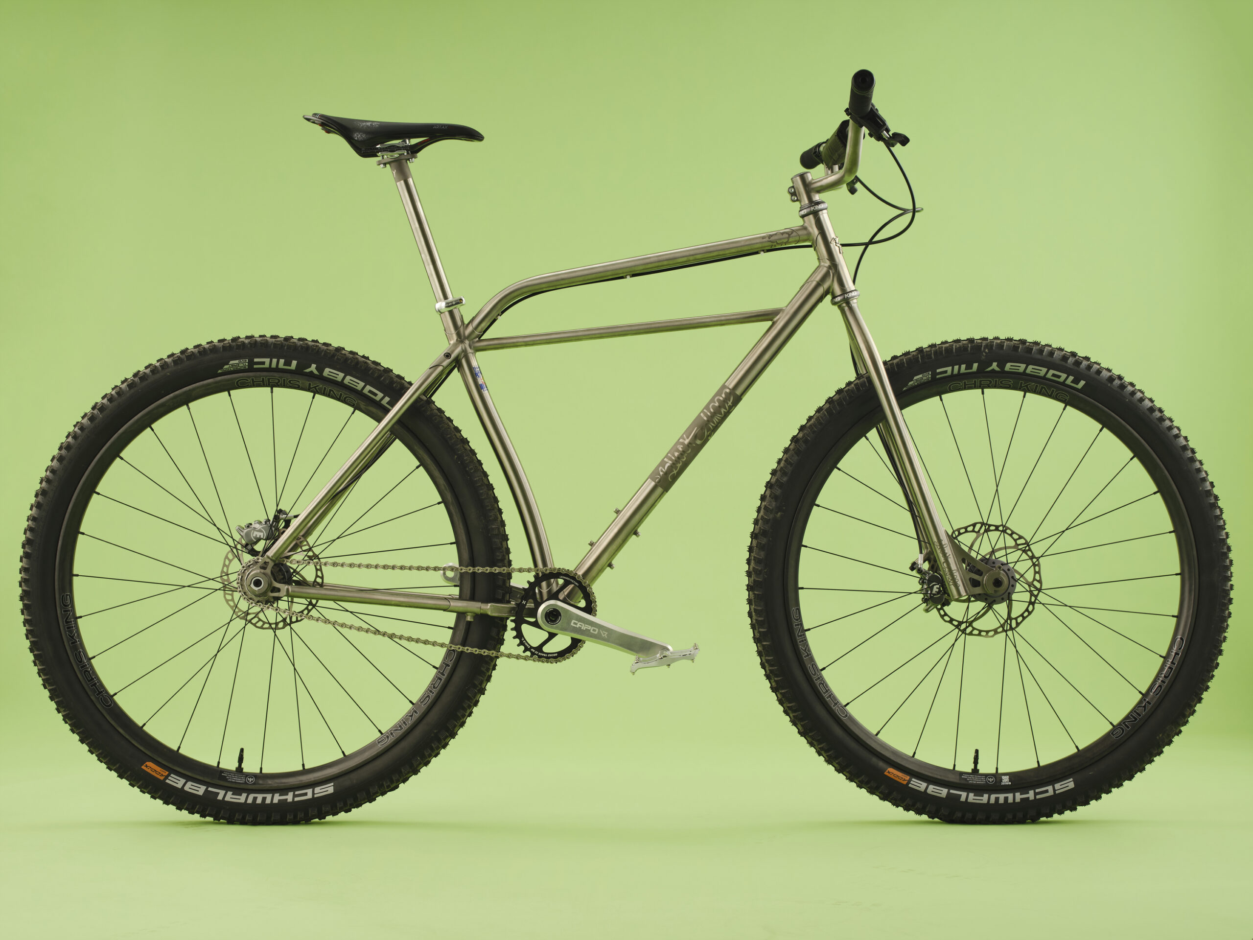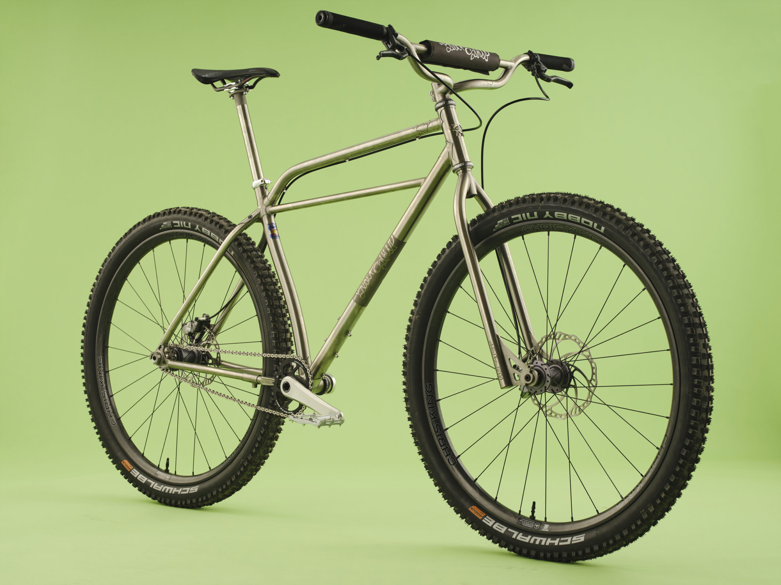 Lugged titanium travel bike, for cruising the streets and trails of the world. Super short back end for wheelies.