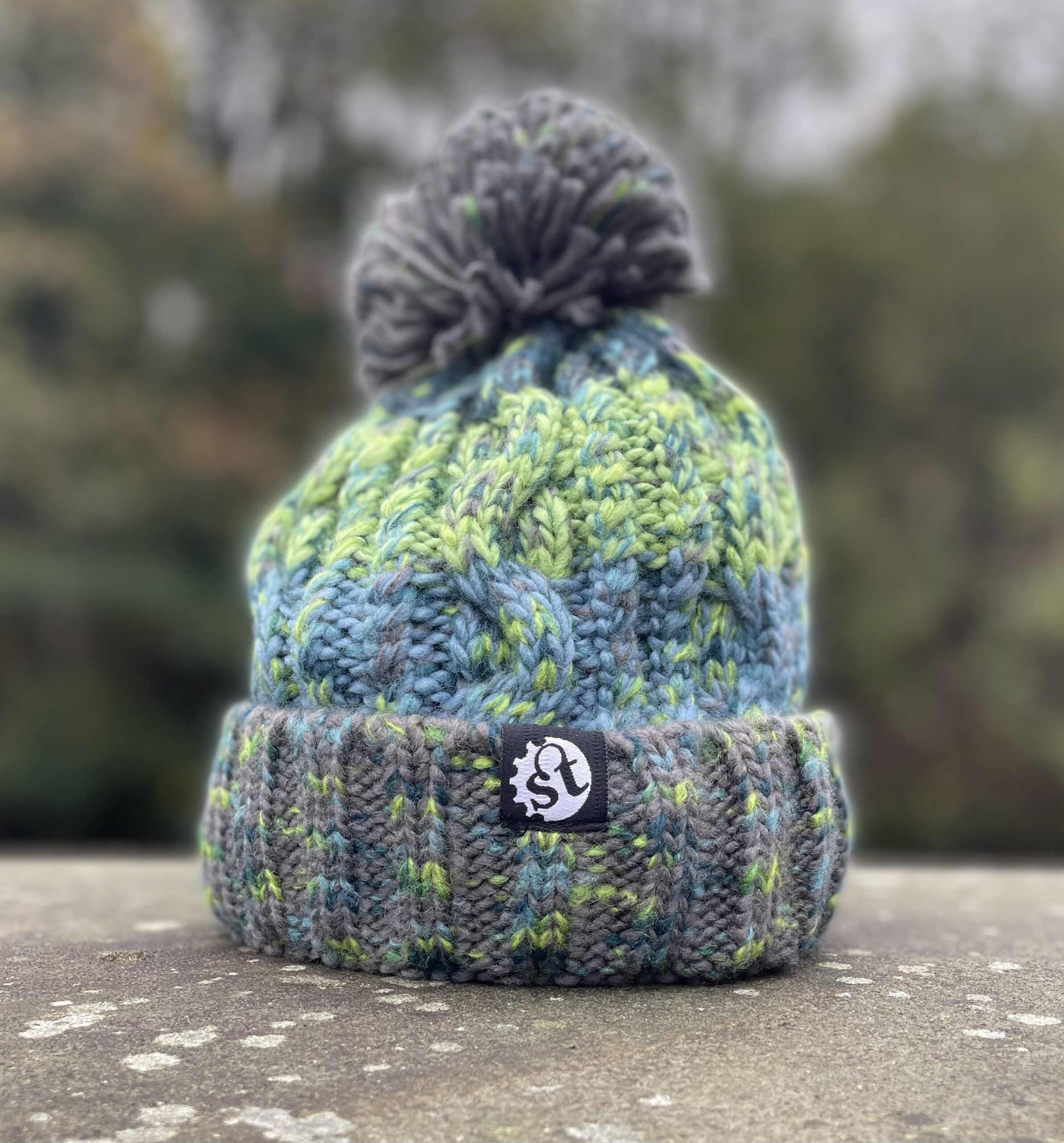 Our new Singletrack Pom Pom hat is super snug and warm. It has a chunky cable knit construction and a cuddly fleecy headband. If we asked scientists, they might tell us that the deep headband helps prevent winter seeping into your ears, and therefore reduces the possibility of winter infecting your brain with chilly negative vibes.